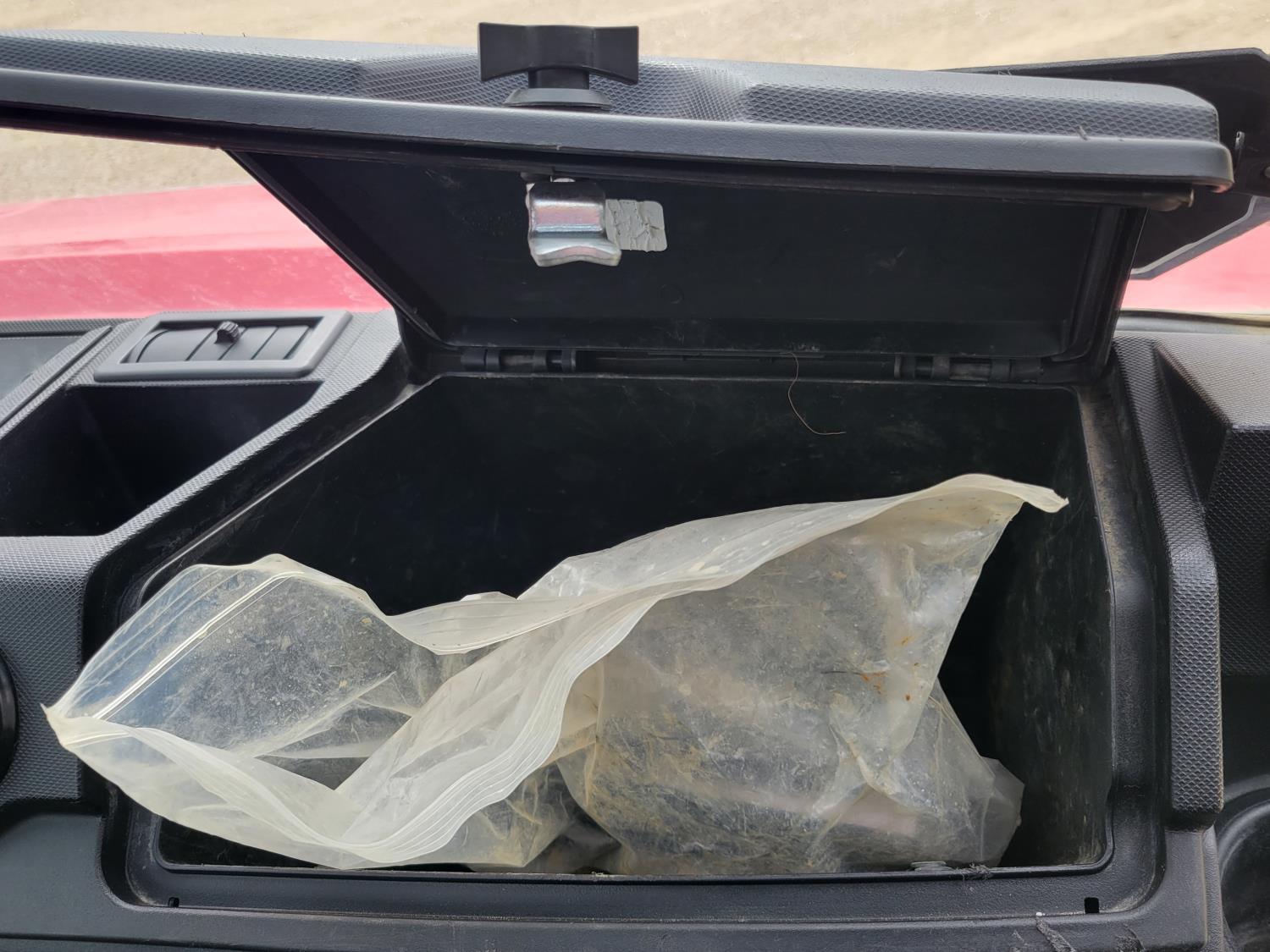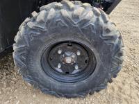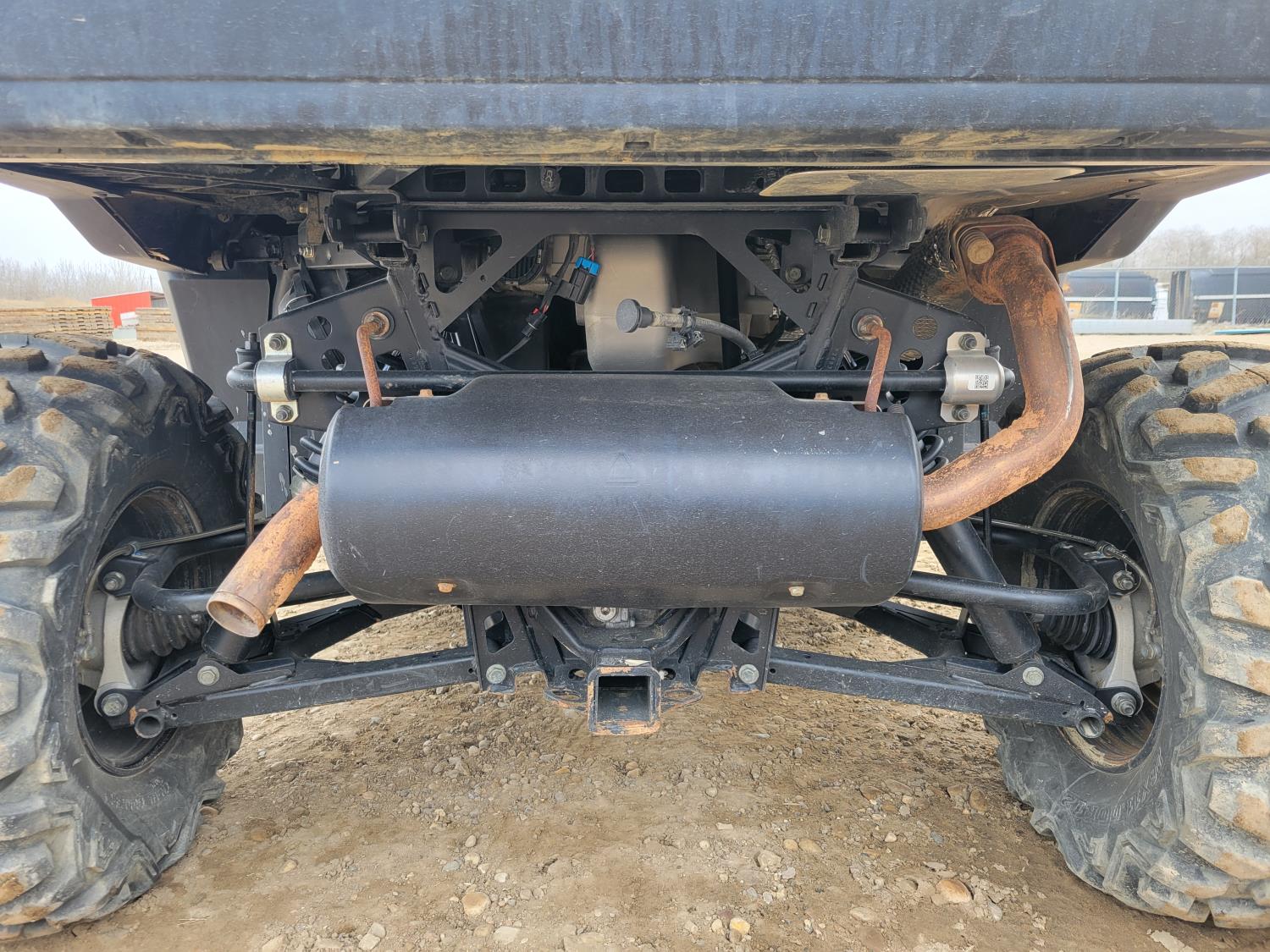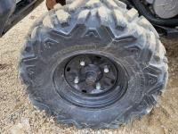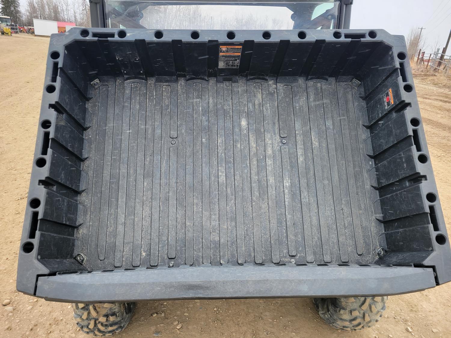 1000 cc fuel injected water cooled engine, automatic transmission, Hi/Lo range, reverse, enclosed cab, heater, windshield, power steering, front winch, front brush guard, manual dump box, receiver hitch, independent suspension, rear screen, 26X9.00R12 front tires, 26X11.00R12 rear tires