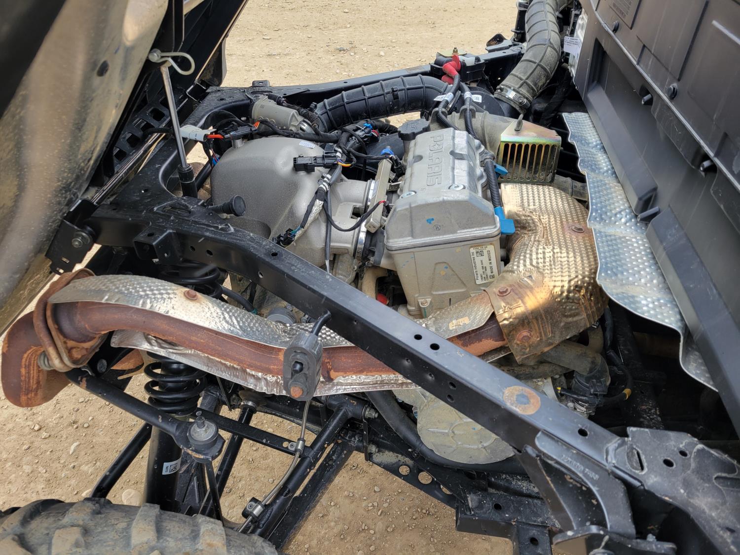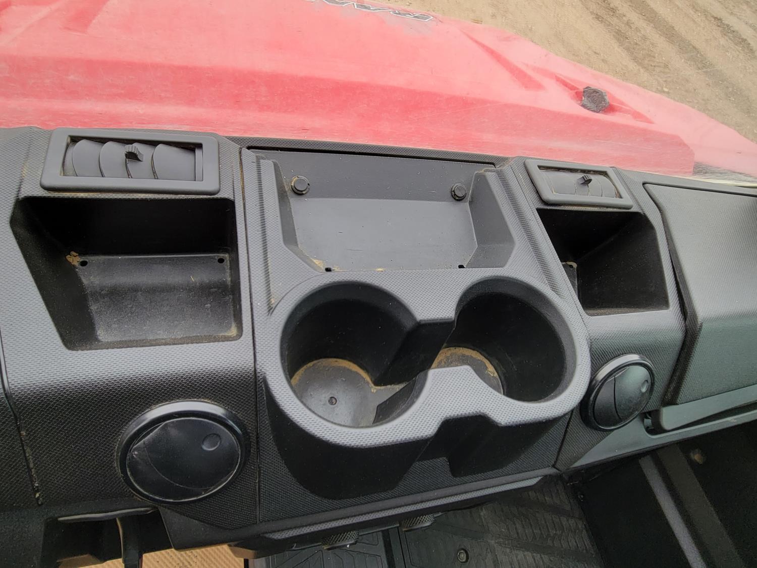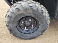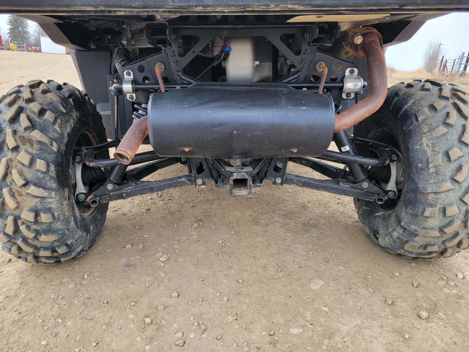 1000 cc fuel injected water cooled engine, automatic transmission, Hi/Lo range, reverse, enclosed cab, heater, windshield, power steering, front winch, front brush guard, manual dump box, receiver hitch, independent suspension, rear screen, 25X10.00-12 tires