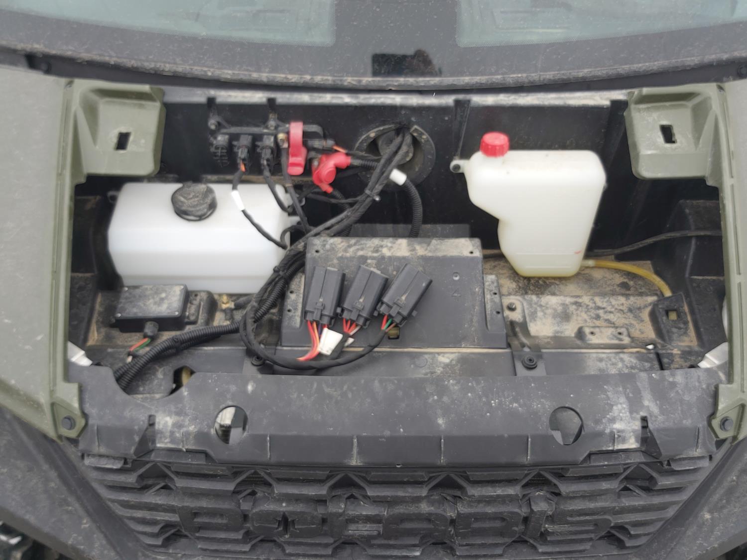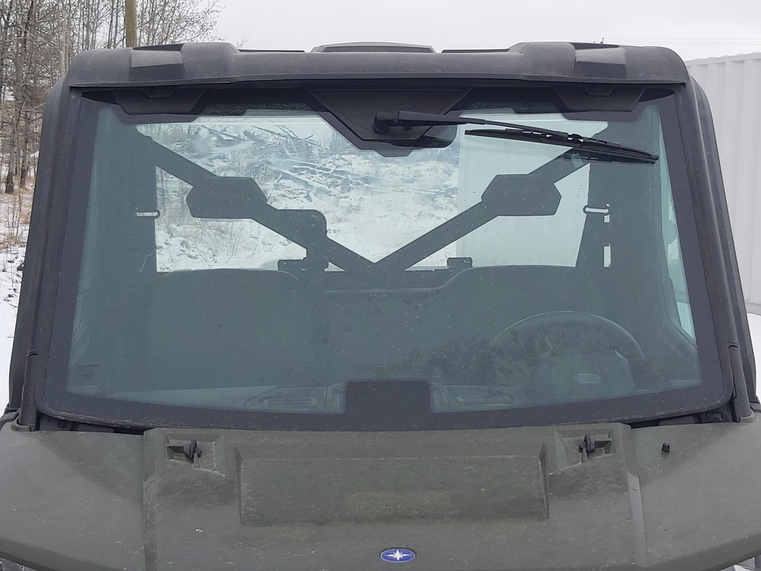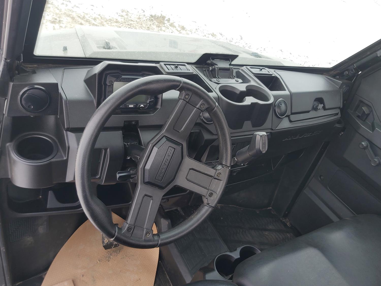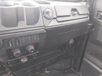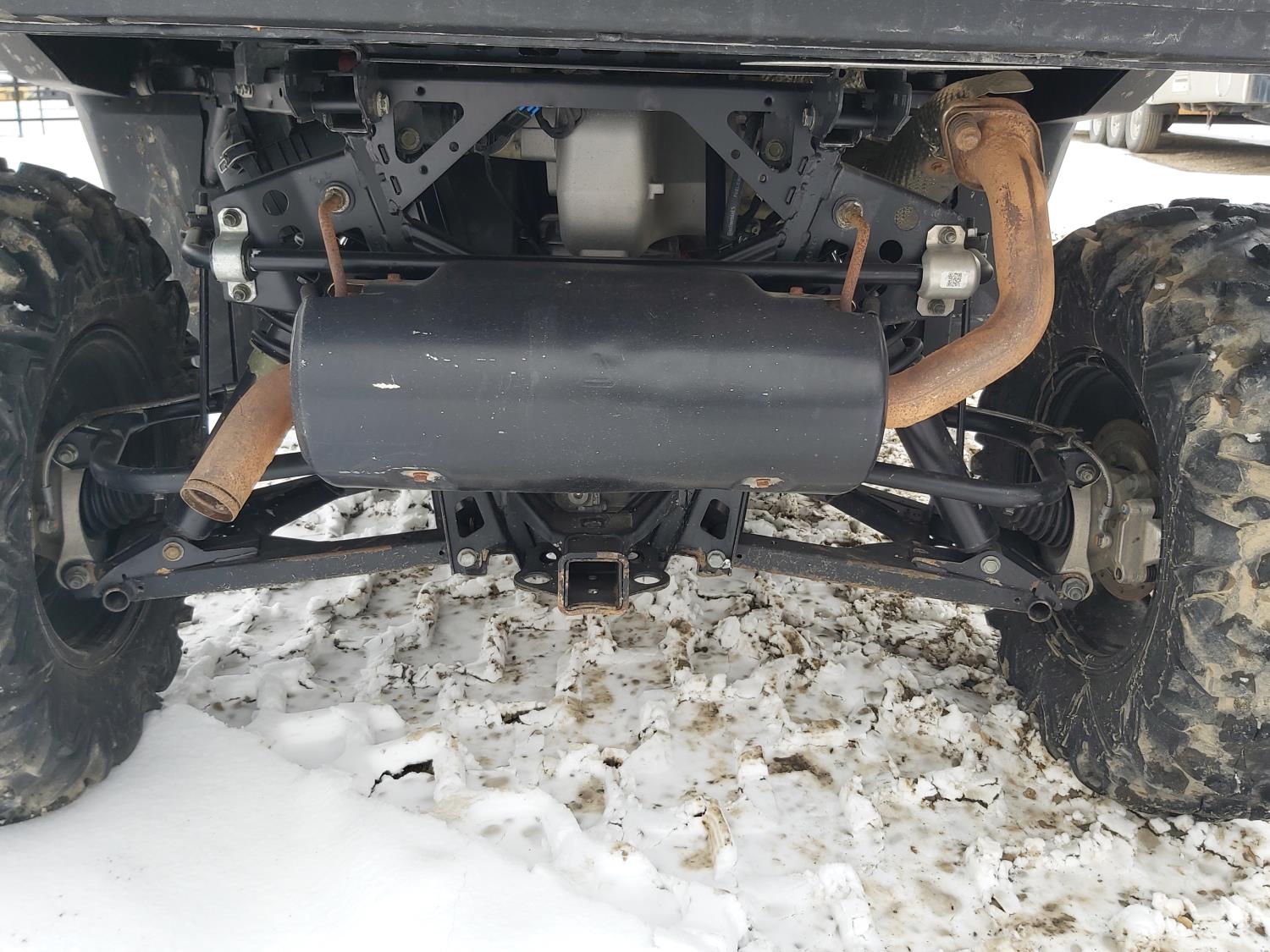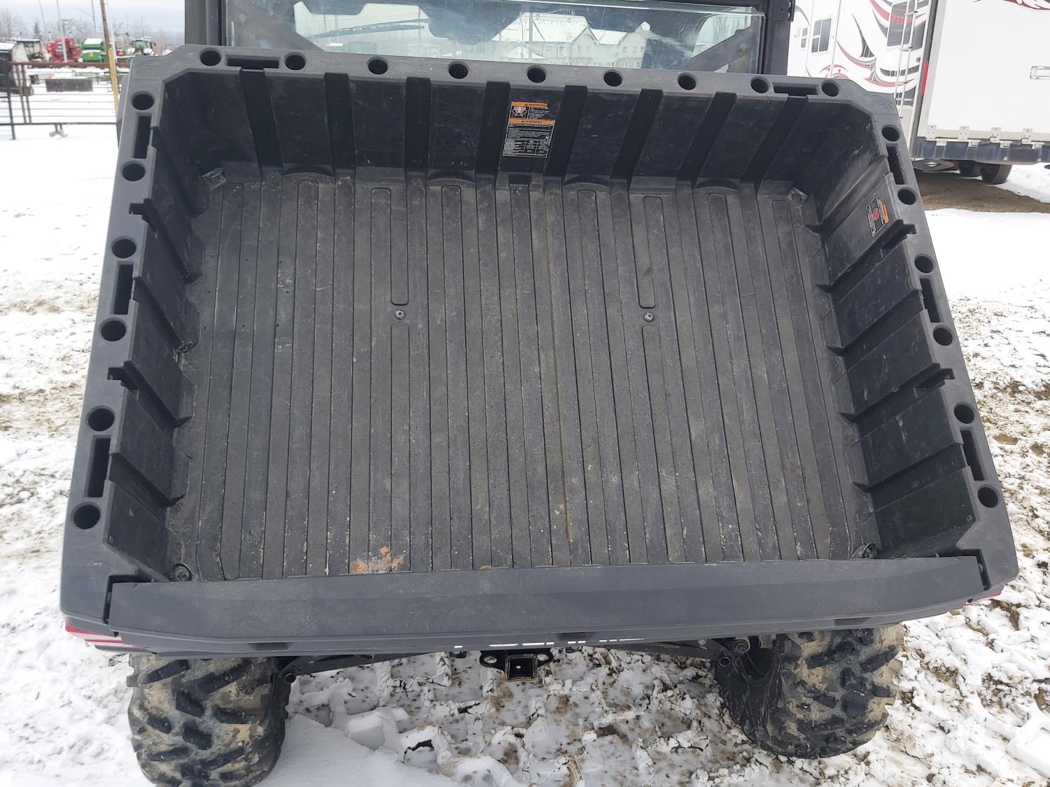 1000 cc fuel injected water cooled engine, automatic transmission, Hi/Lo range, reverse, enclosed cab, heater, windshield, power steering, front winch, front brush guard, manual dump box, receiver hitch, independent suspension, rear screen, 28X9.00R14 front tires, 28X11.00R14 rear tires