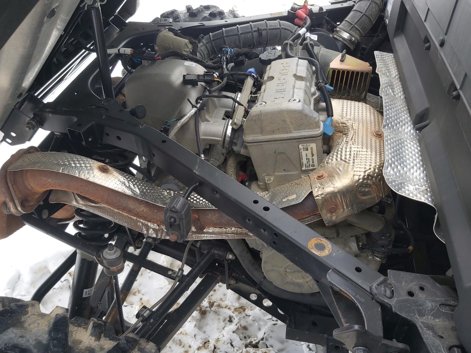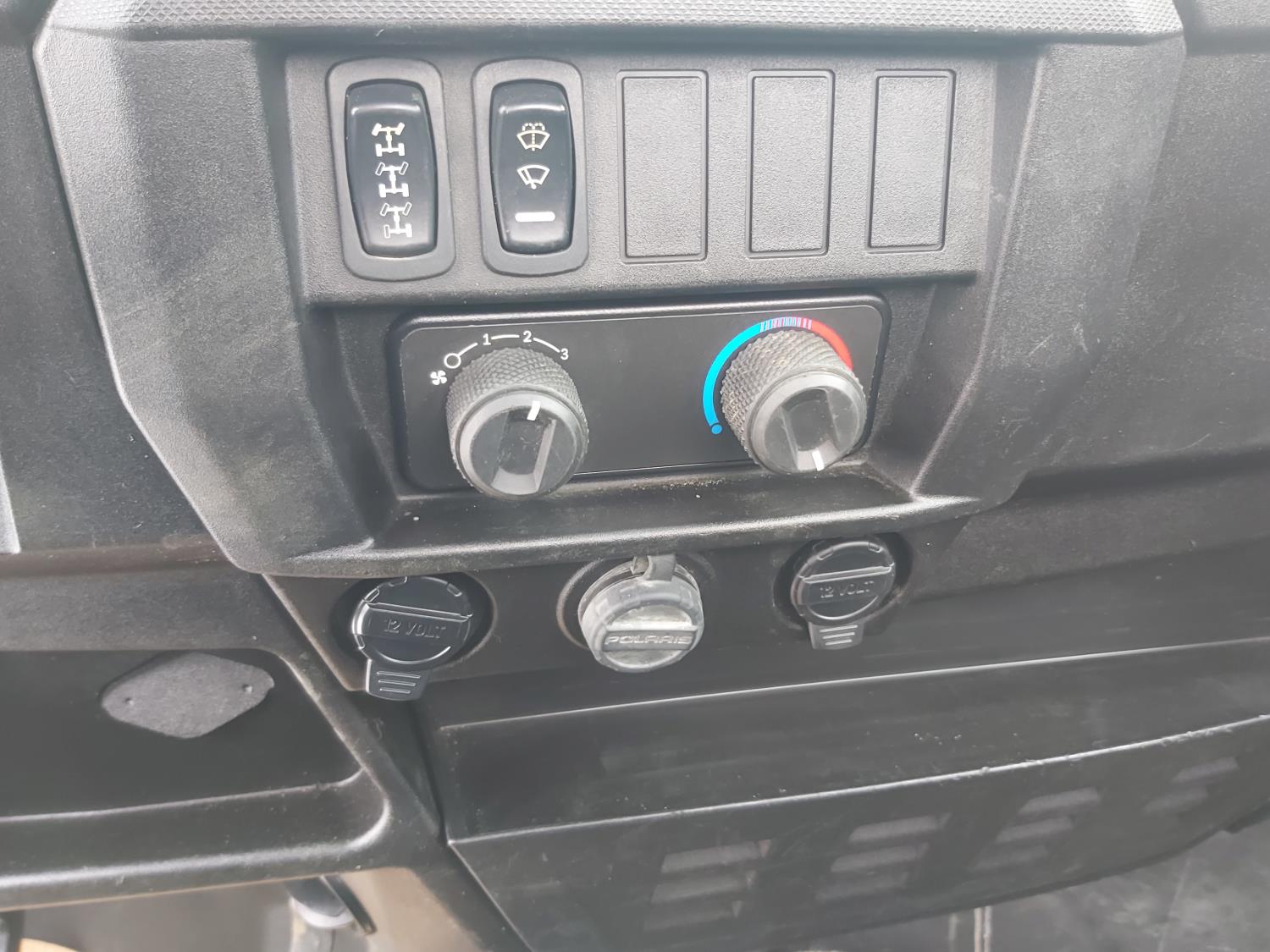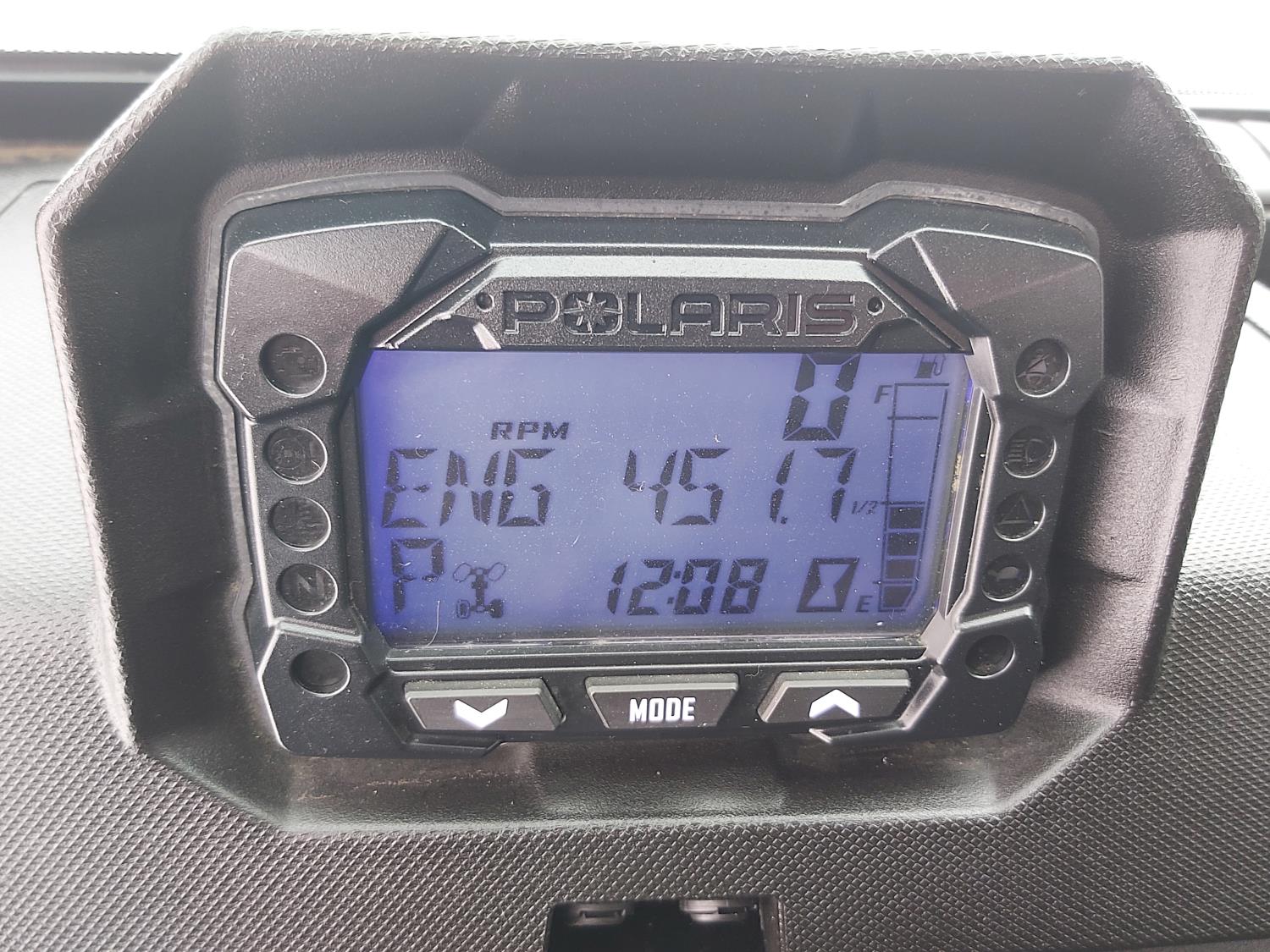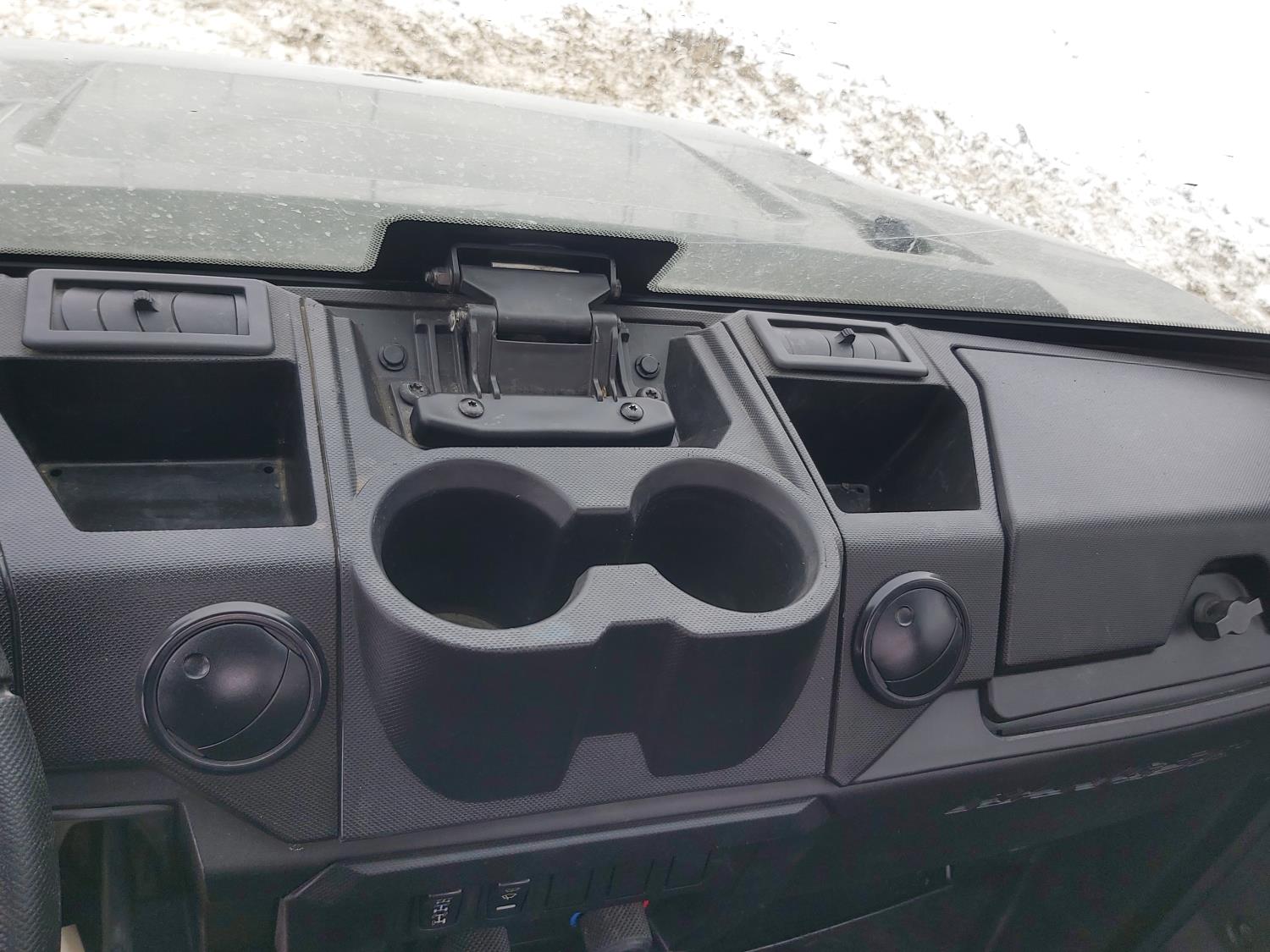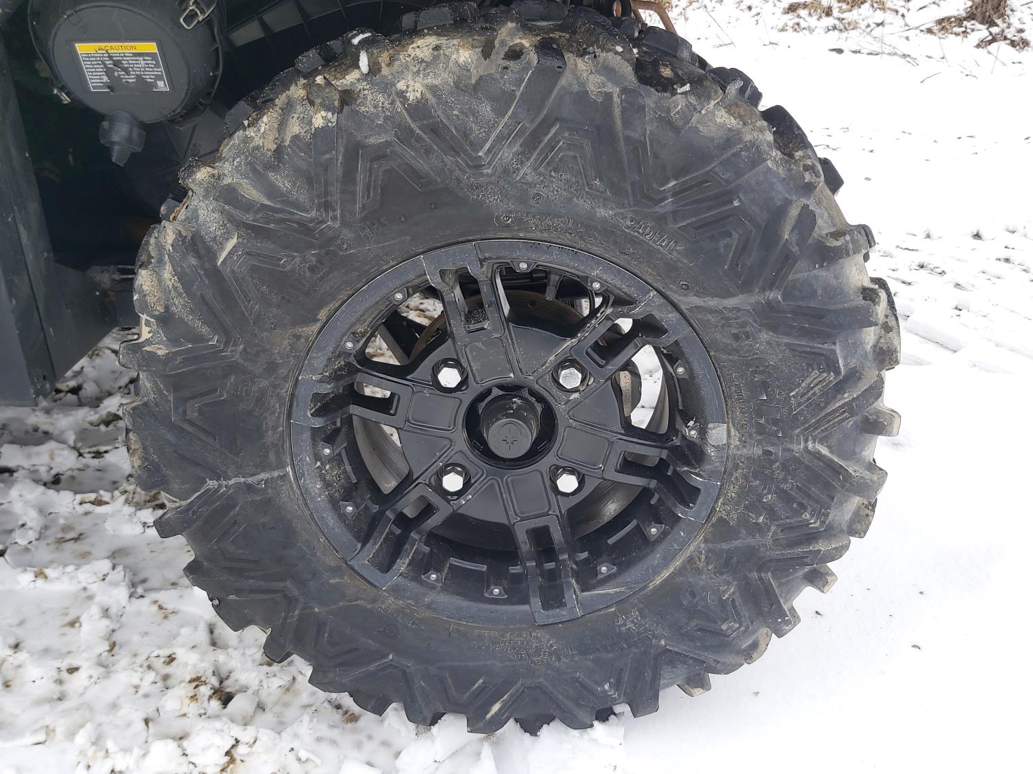 1000 cc fuel injected water cooled engine, automatic transmission, Hi/Lo range, reverse, enclosed cab, heater, windshield, power steering, front winch, front brush guard, manual dump box, receiver hitch, independent suspension, rear screen, 28X9.00R14 front tires, 28X11.00R14 rear tires