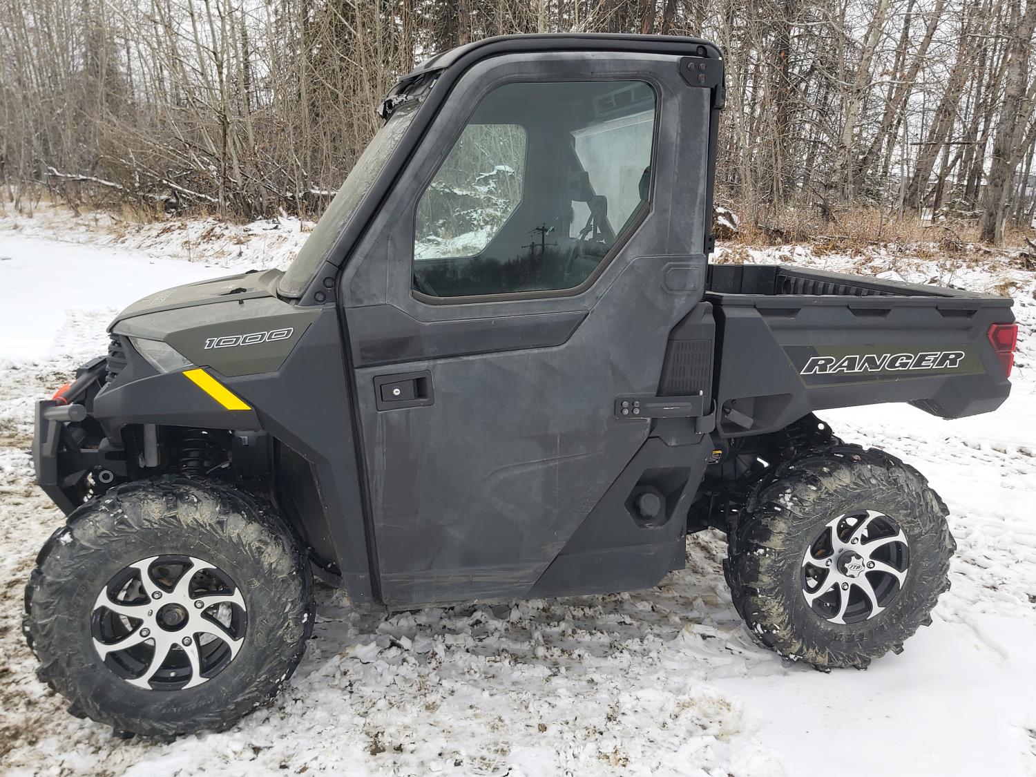 1000 cc fuel injected water cooled engine, automatic transmission, Hi/Lo range, reverse, enclosed cab, heater, windshield, power steering, front winch, front brush guard, manual dump box, receiver hitch, independent suspension, rear screen, 30X9.00-14 front tires, 30X11.00-14 rear tires