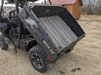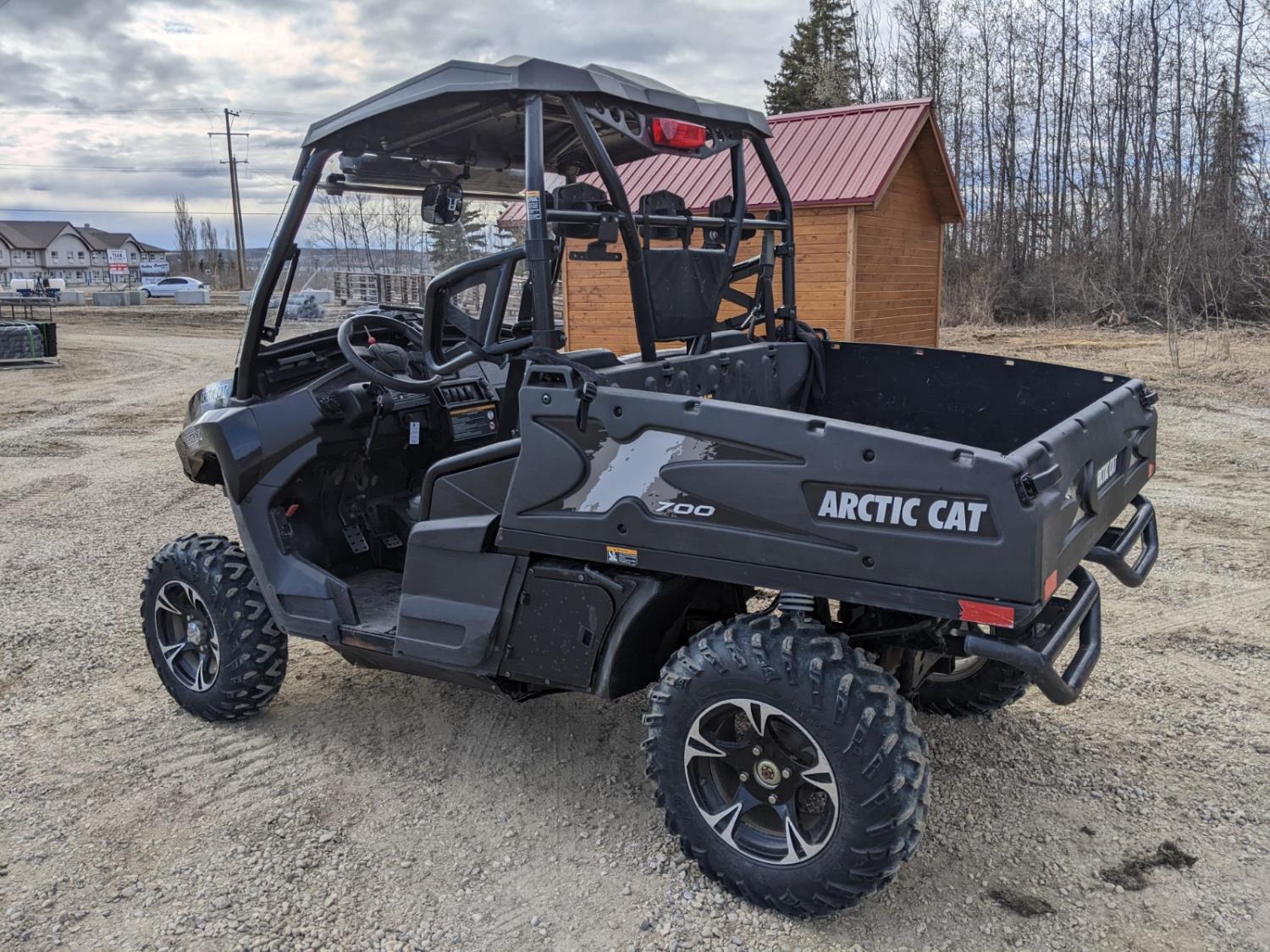 700 cc fuel injected engine, automatic transmission, Hi/Lo range, reverse, open canopy, windshield, power steering, front winch, front locking differential, manual dump box, receiver hitch, independent suspension, LED light bar, 205/75R14 front tires, 255/65R14 rear tires