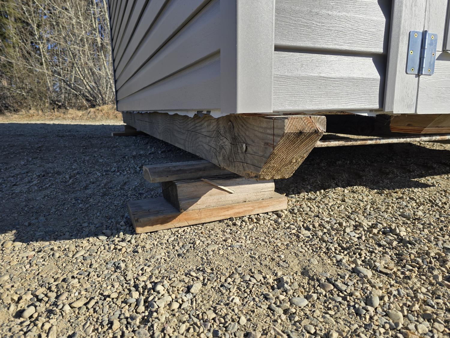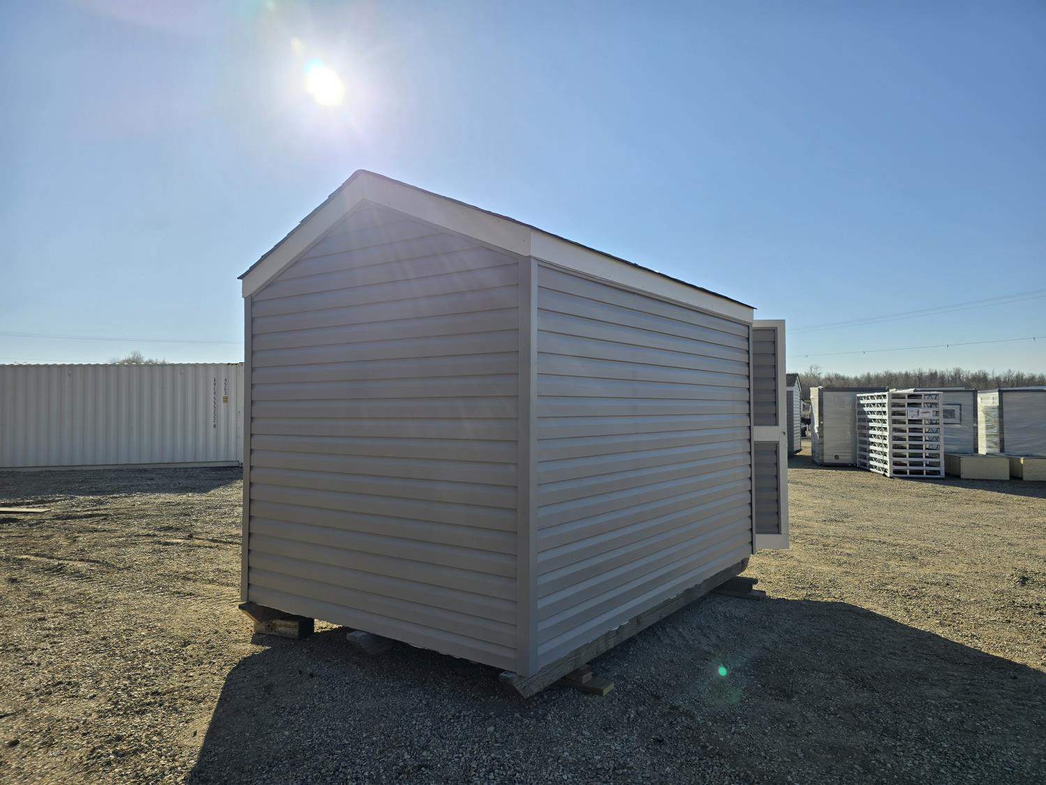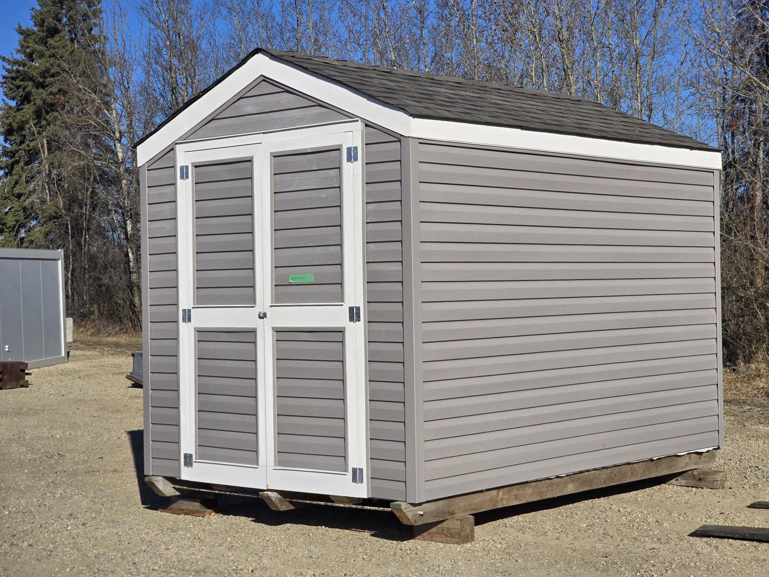 4 inch x 6 inch douglas fir skids, 5 ft x 7 ft double doors, 3/4 inch fir plywood walls & floor, interior has 1 coat of primer & 1 finishing coat, rhino roof membrane and tyvec walls, 30 year shingles, vinyl siding,
