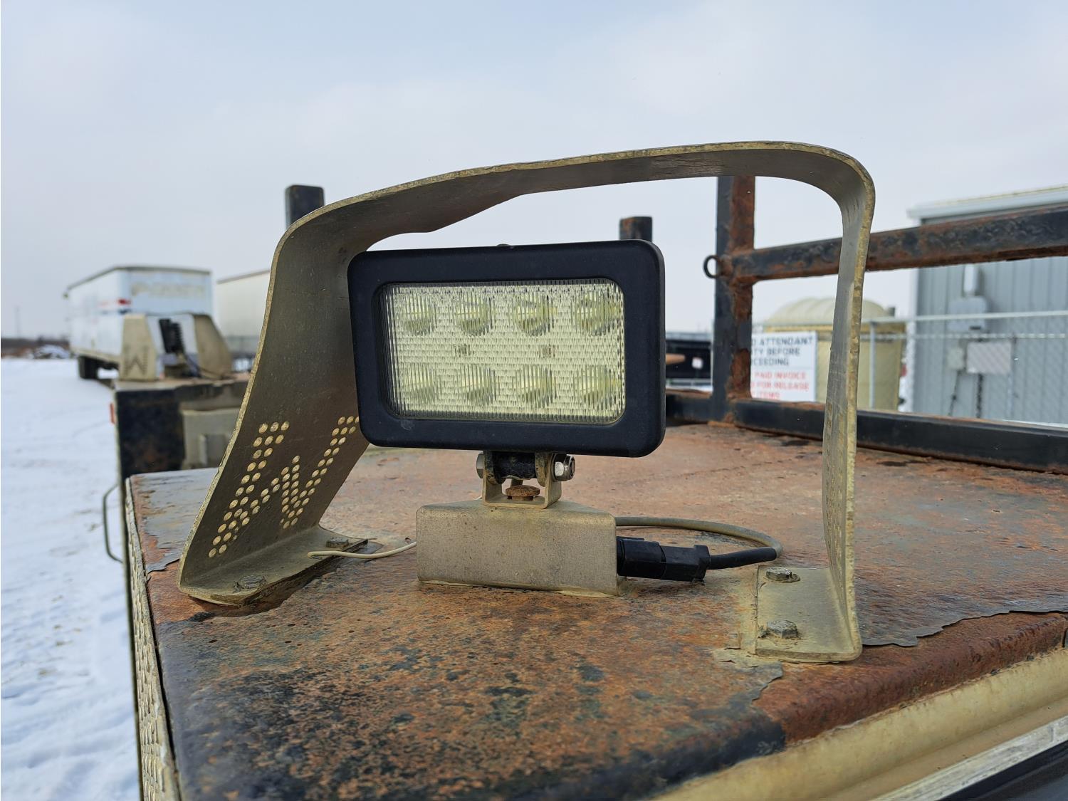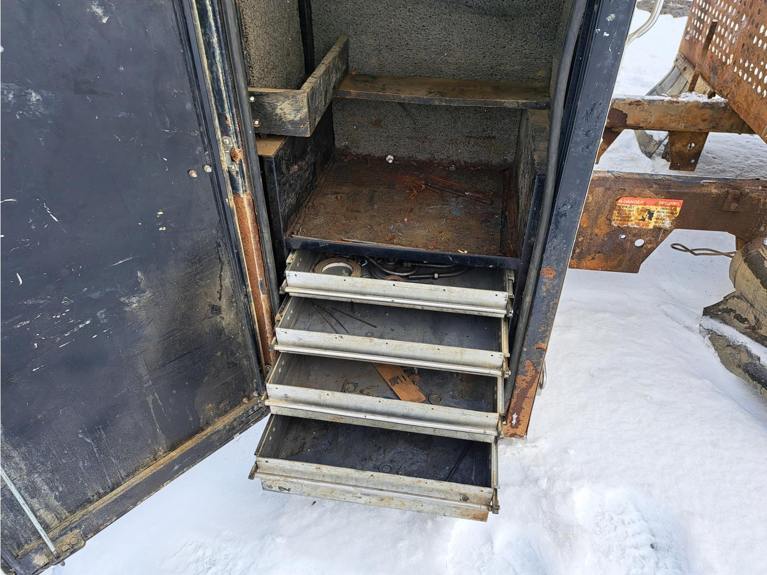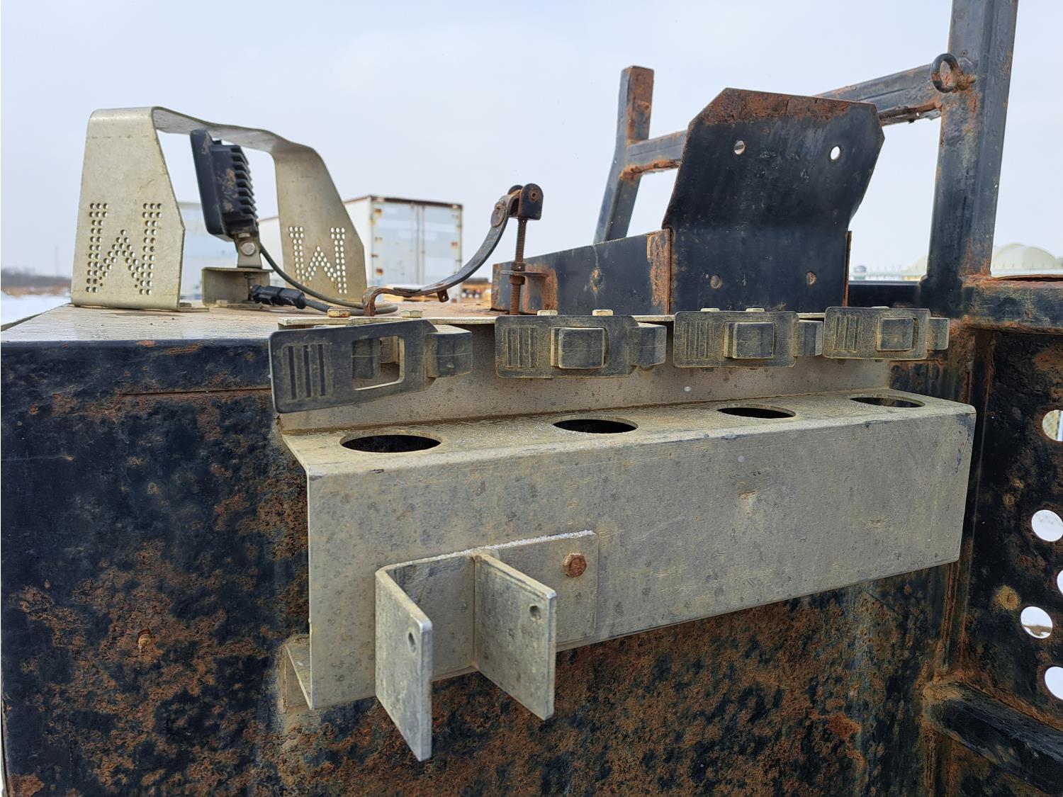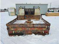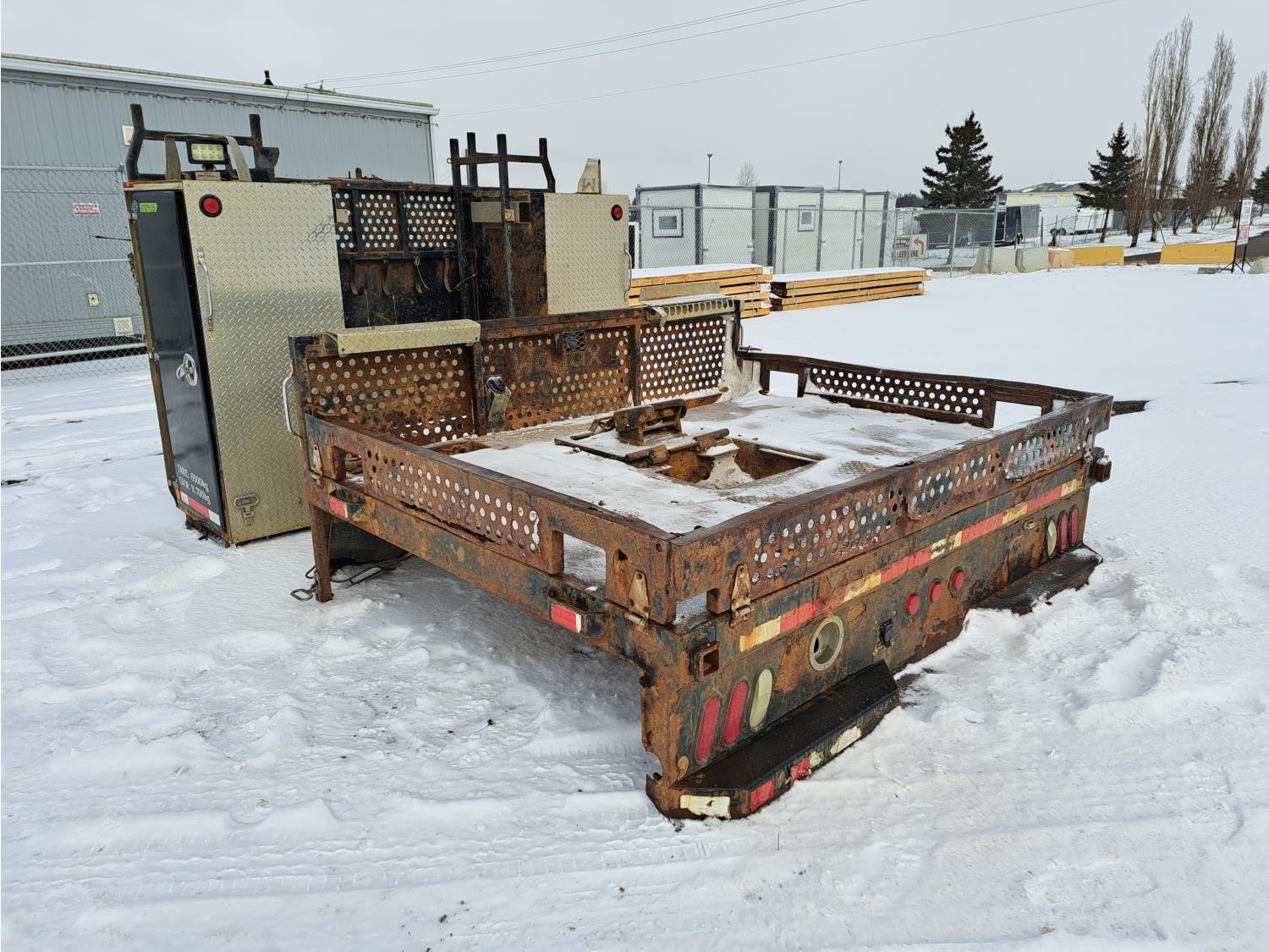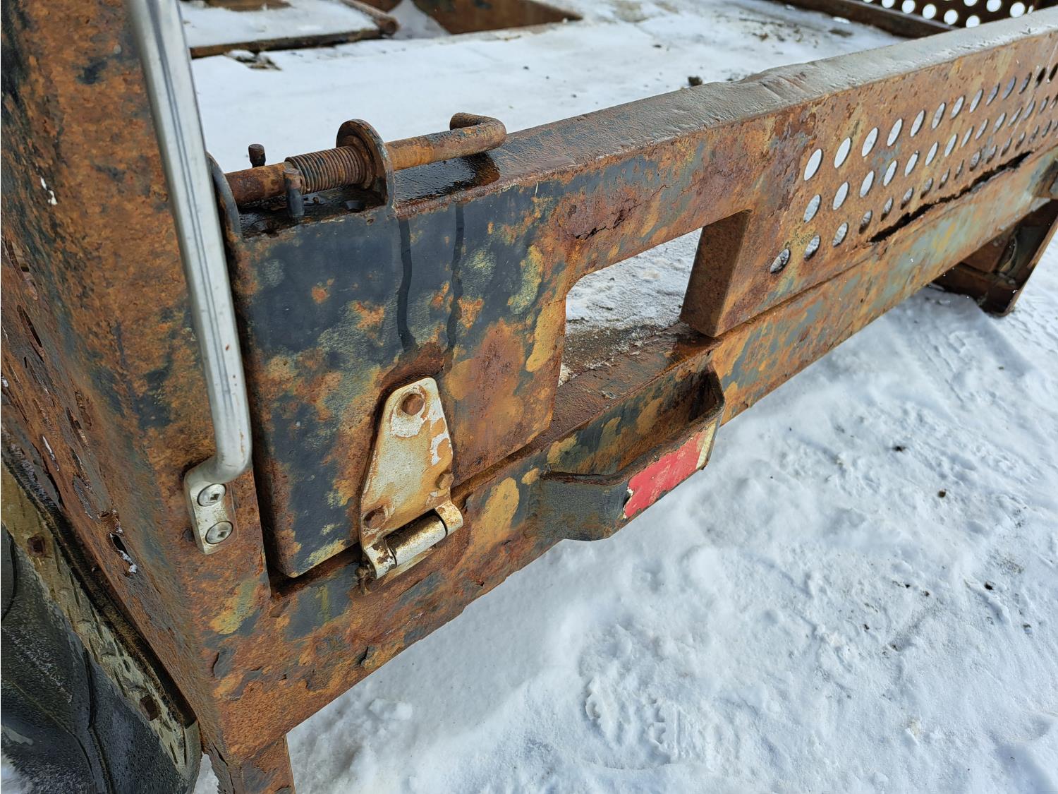 Headache rack, side toolboxes, hinged fold down sides, taillights, (2) work lights, wood deck is 76 long X 94 inch wide, no wood where picker was mounted, flip over 5TH wheel hitch, (2) 24-inch- deep x 27- inch- wide x 60-inch- high toolboxes, fire extinguisher holder