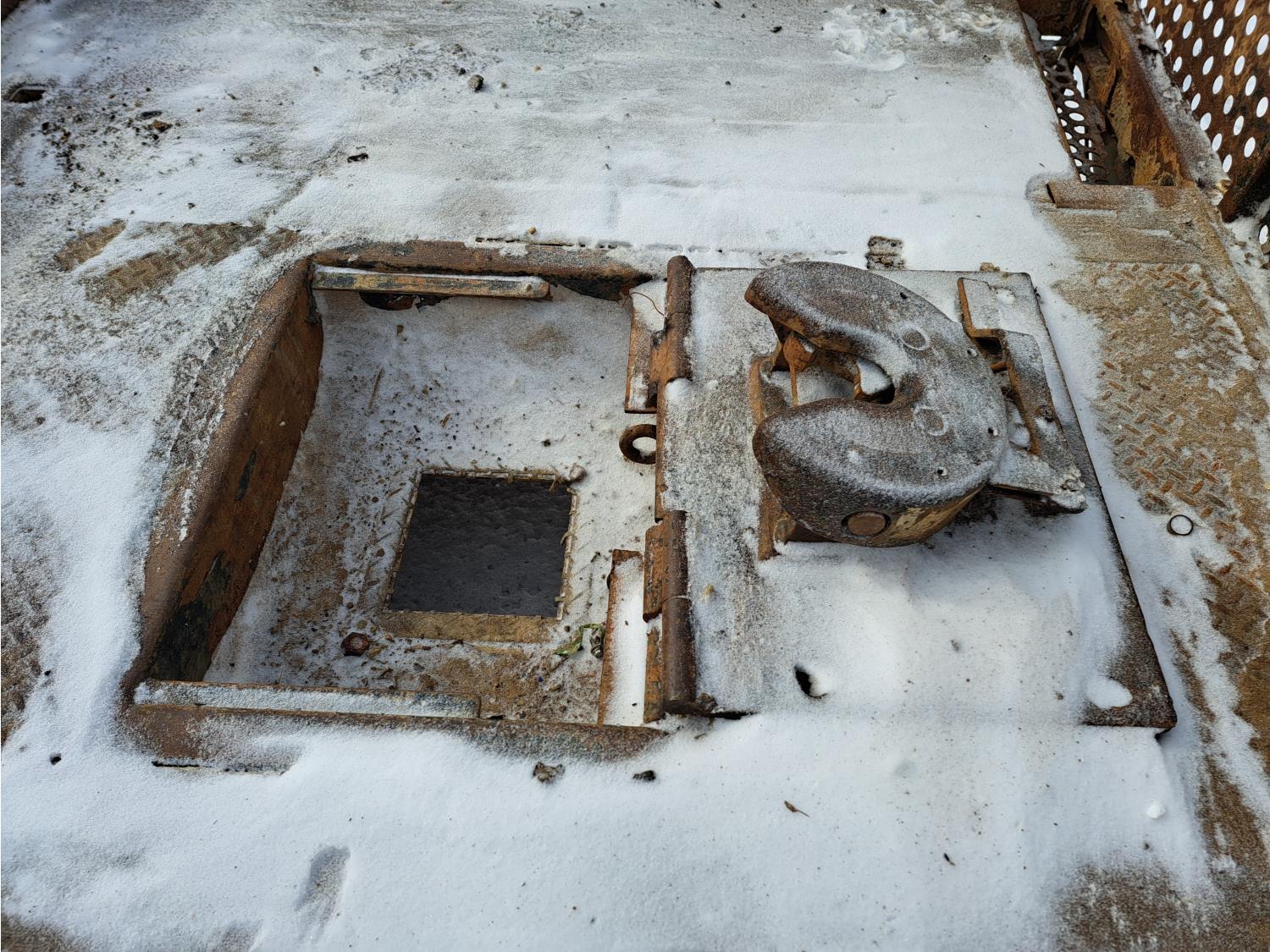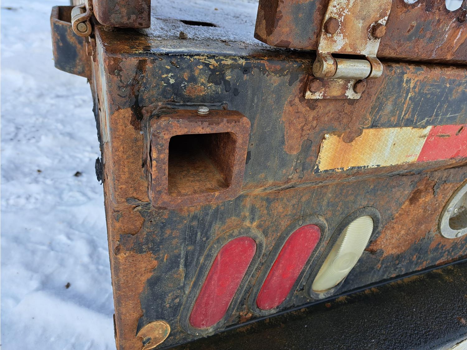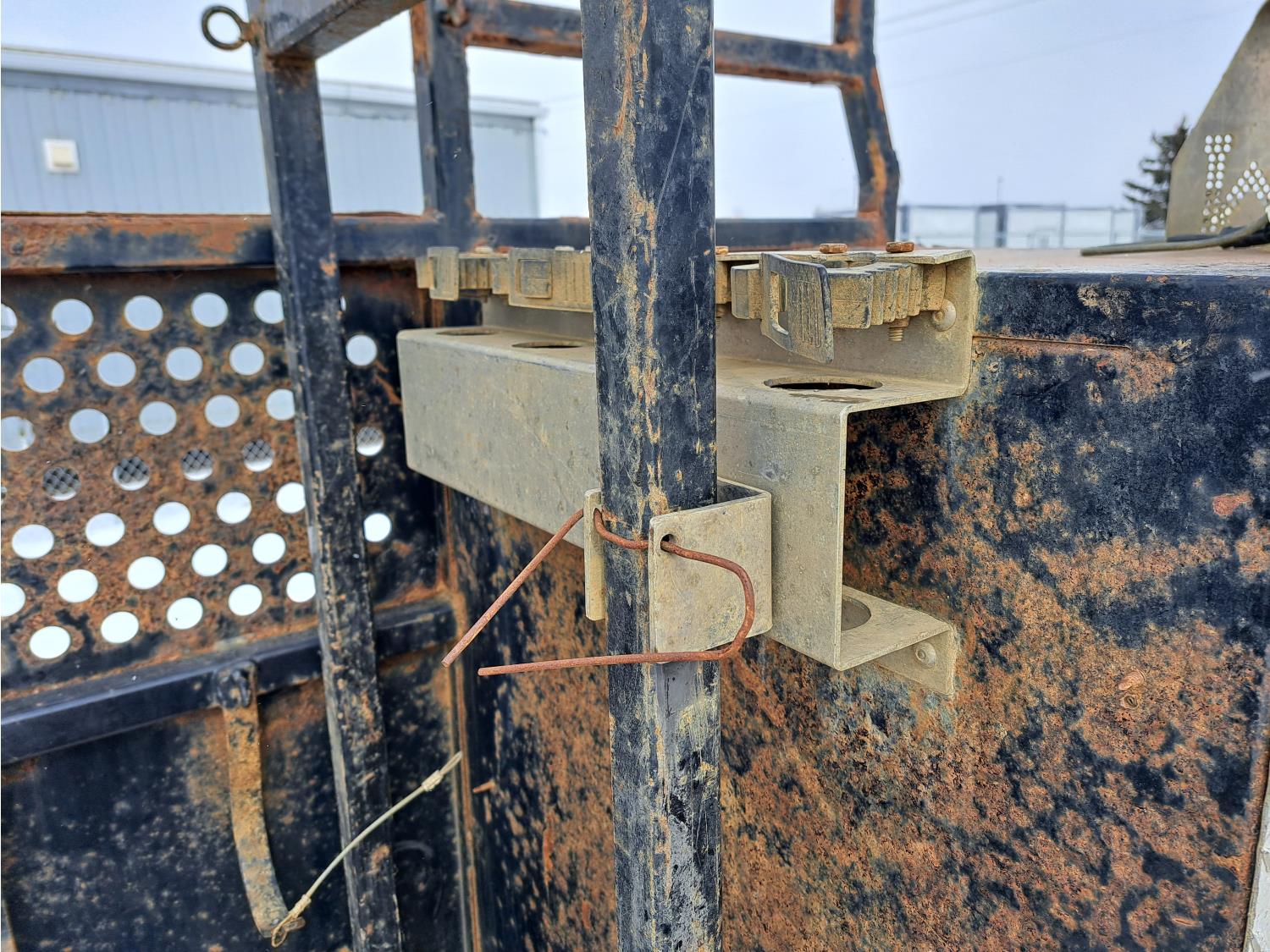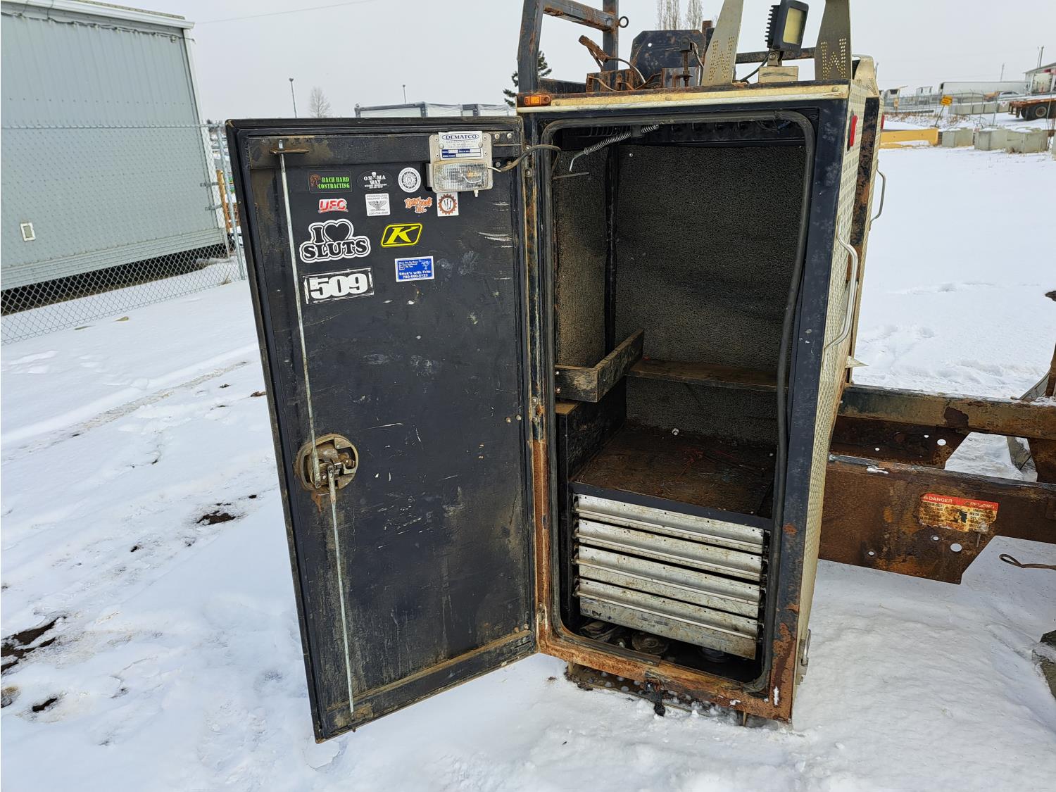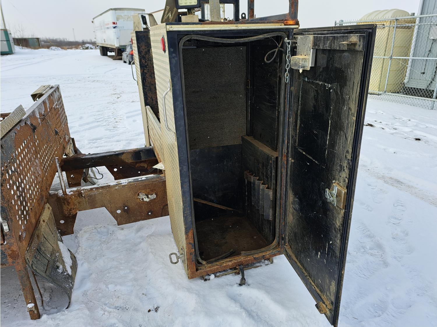 Headache rack, side toolboxes, hinged fold down sides, taillights, (2) work lights, wood deck is 76 long X 94 inch wide, no wood where picker was mounted, flip over 5TH wheel hitch, (2) 24-inch- deep x 27- inch- wide x 60-inch- high toolboxes, fire extinguisher holder