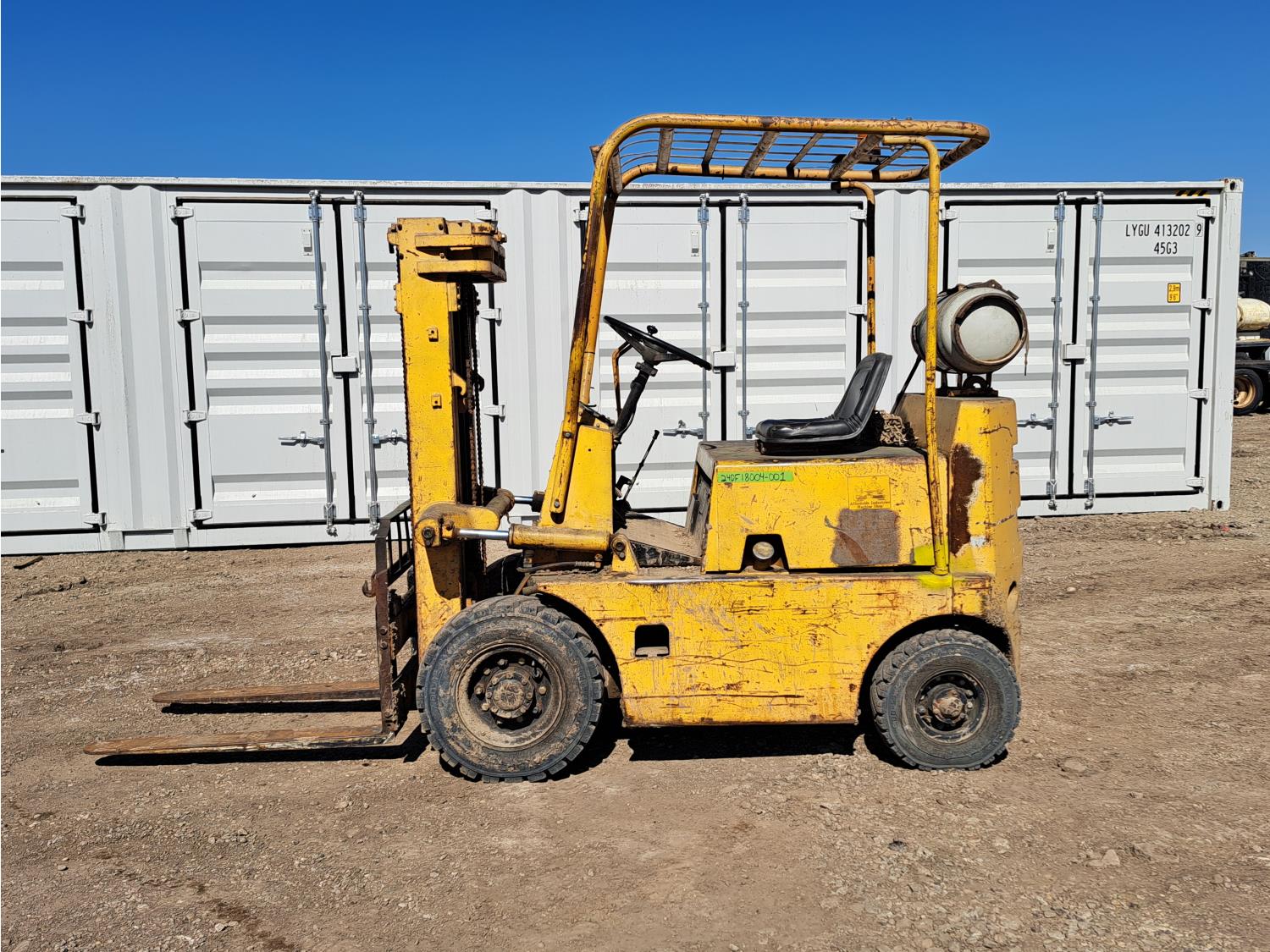 Propane powered Nissan motor, two stage tilting mast, 42 inch pallet forks, 7.00 - 12 front tires, 6.00 - 9 rear tires, front tire chains, 132 inch ± mast fully extended.