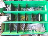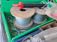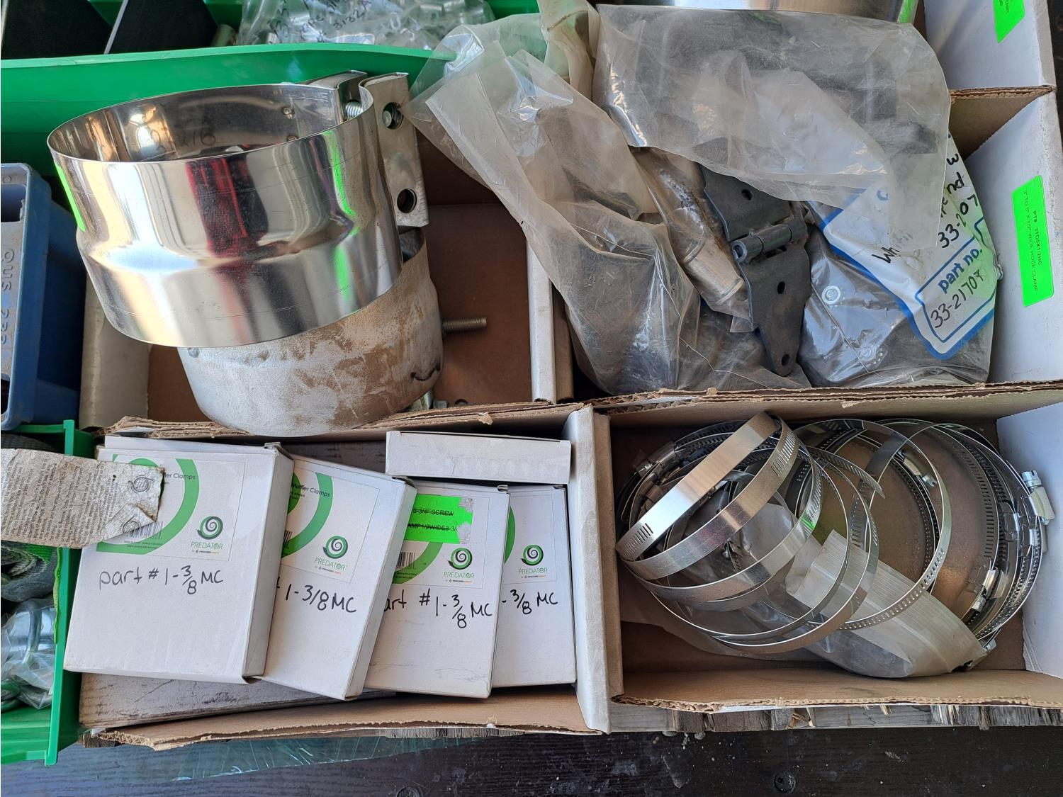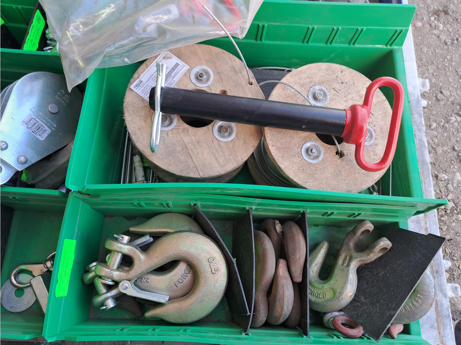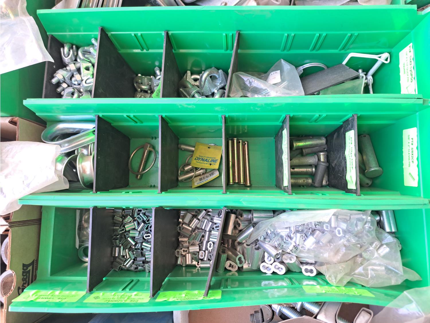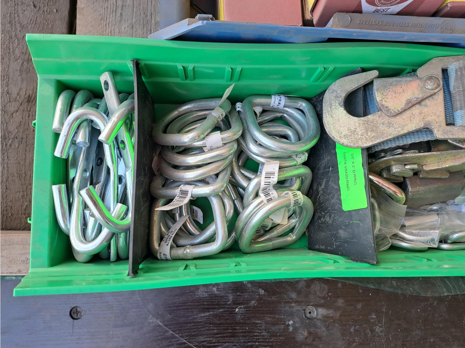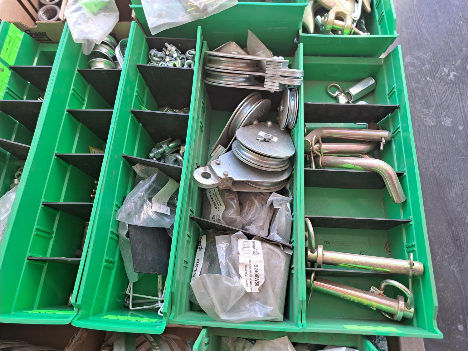 Various sizes of hitch pins, hose clamps, aircraft cable and clamps, small snatch blocks, chain hooks, D-rings, muffler clamps, hardware fasteners.