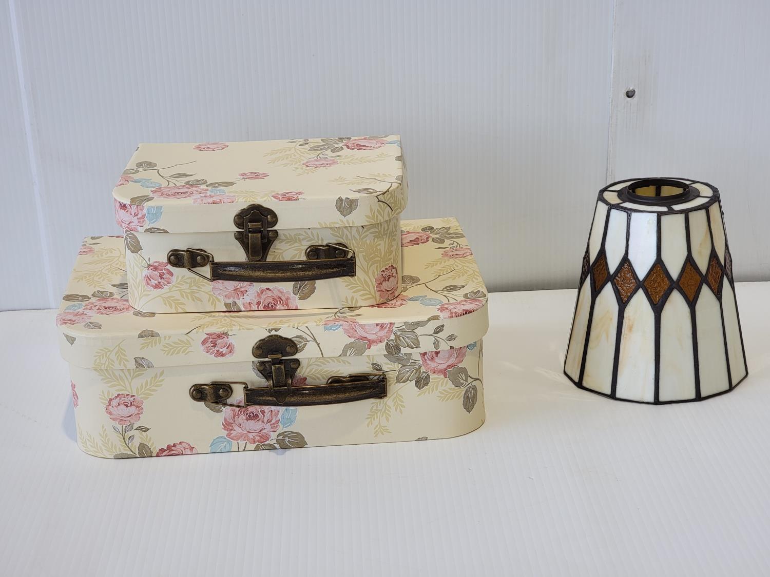 1897 (2) Stationary Boxes and a Tiffany Style Lamp Shade