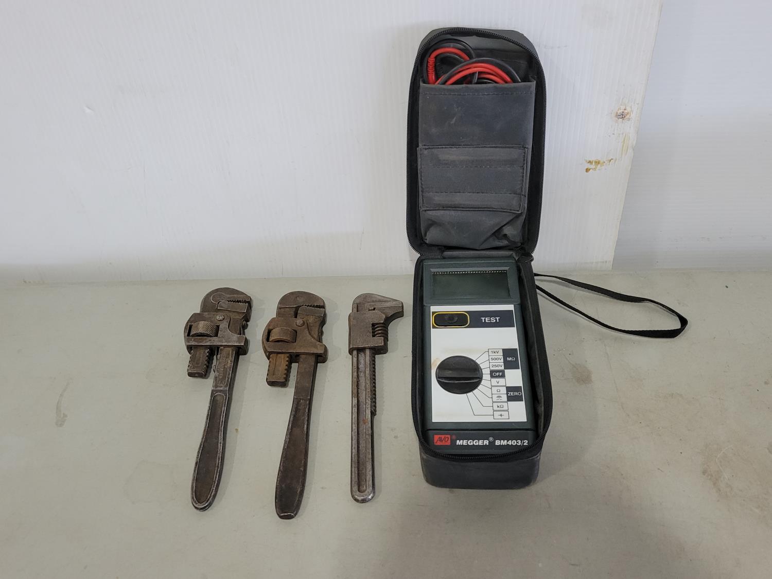 1744 Megger BM403/2 Electric Motor Tester and (3) Antique Pipe Wrenches
