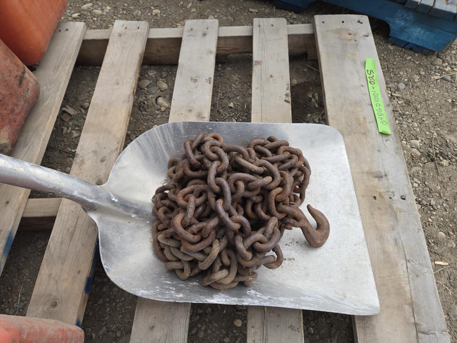 (4) 20 liter Jerry cans, (1) 4 liter Jerry can, aluminum scoop shovel, (1) chain