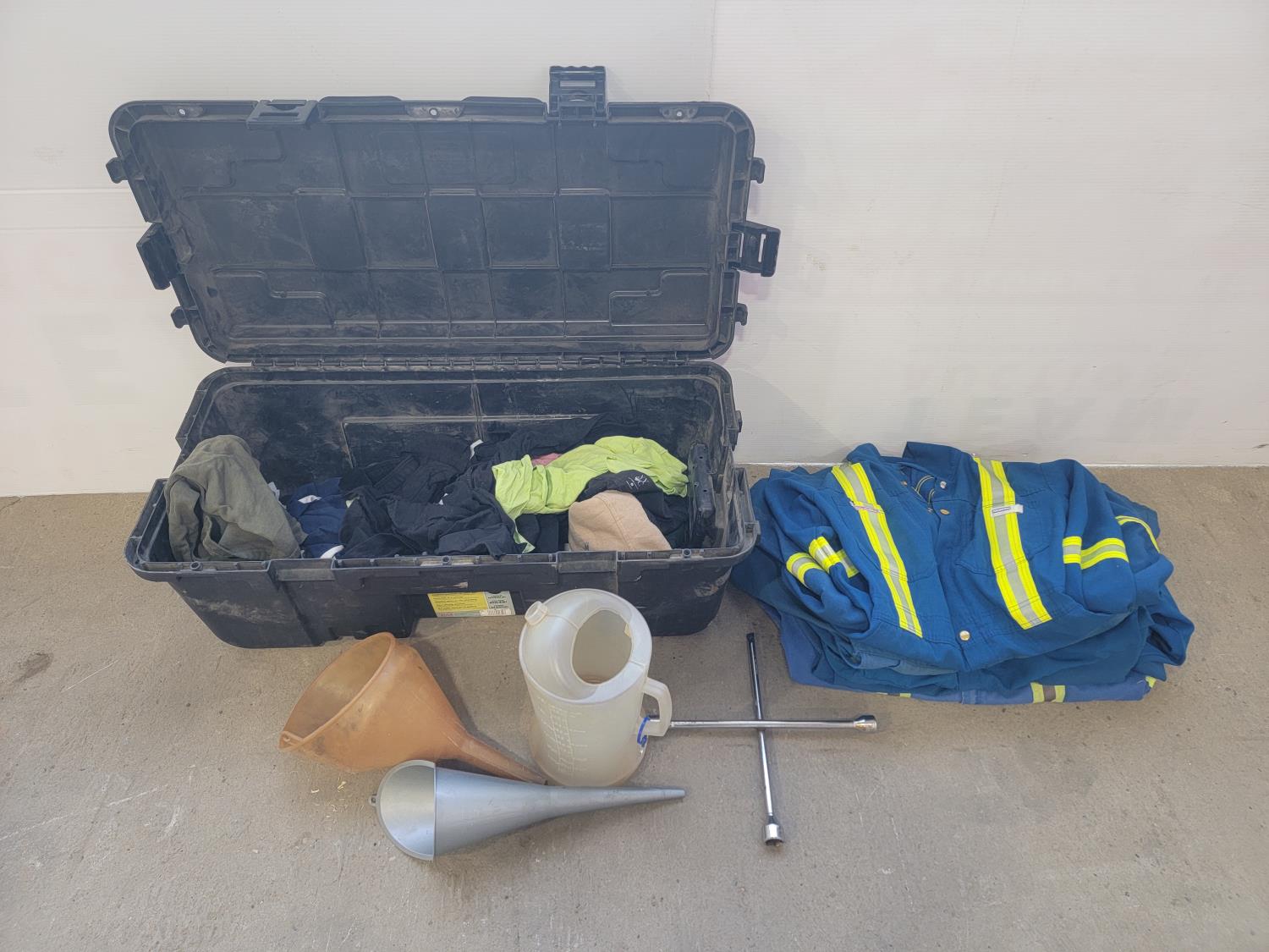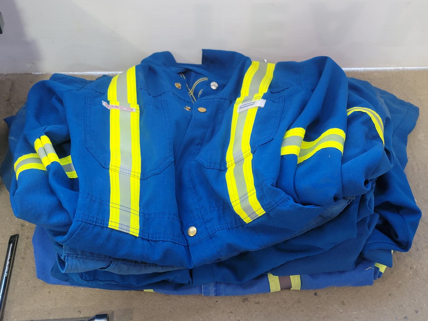 size 42 and 44 fire proof coveralls, tire iron, (3) funnels, rags