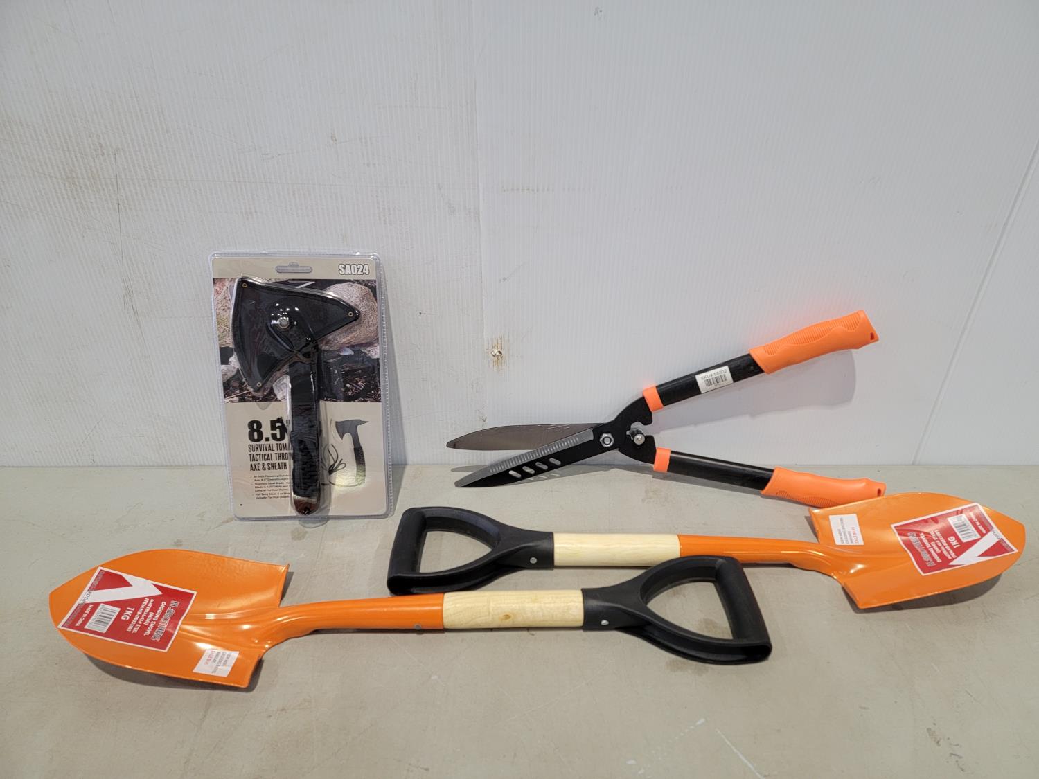 1108 Pruning Sheers, (2) Mini Shovels, Throwing Axe (Unused)