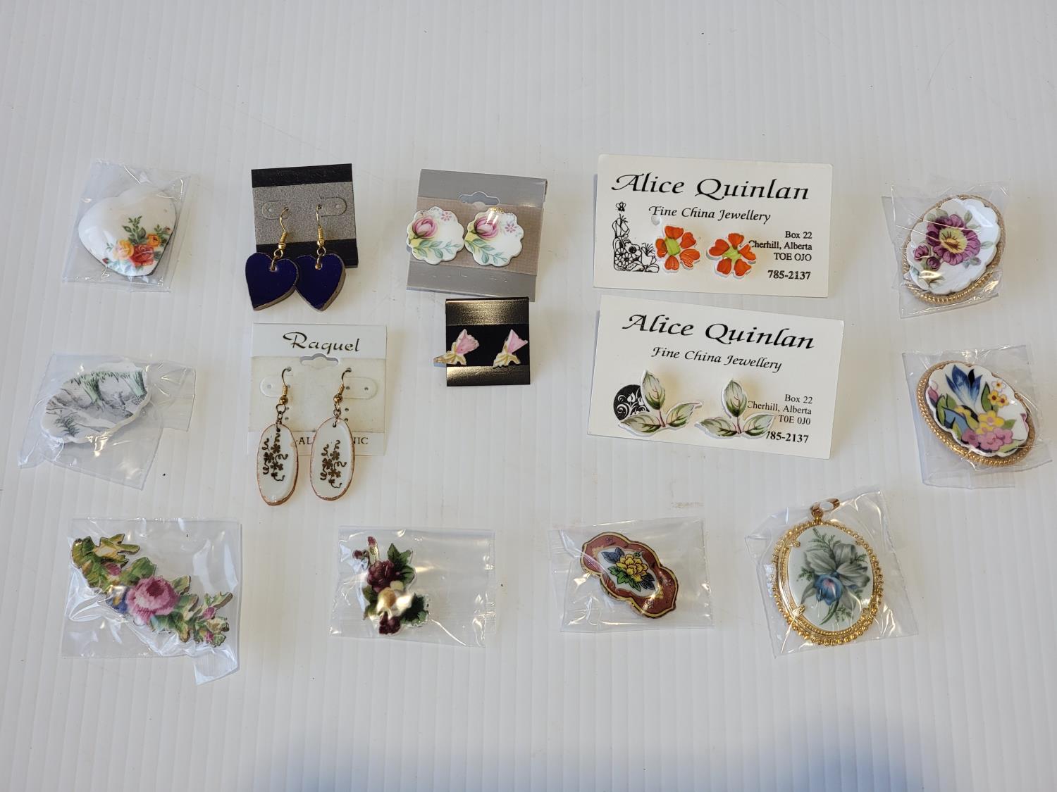 (6) earrings, (8) broches, cut china