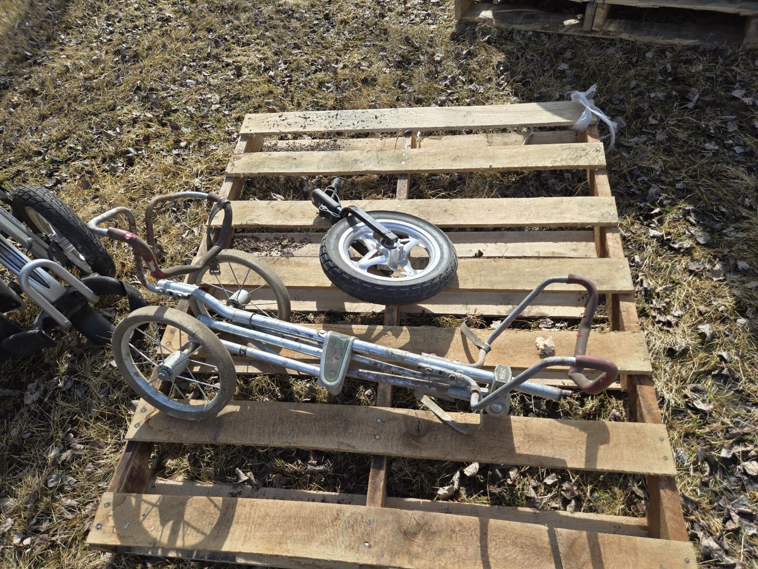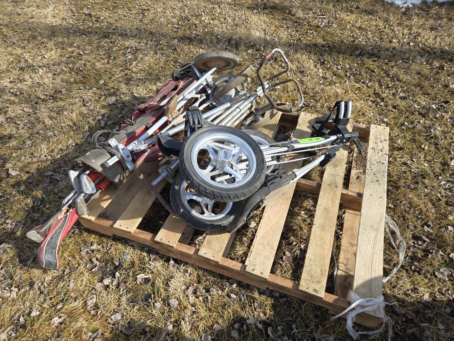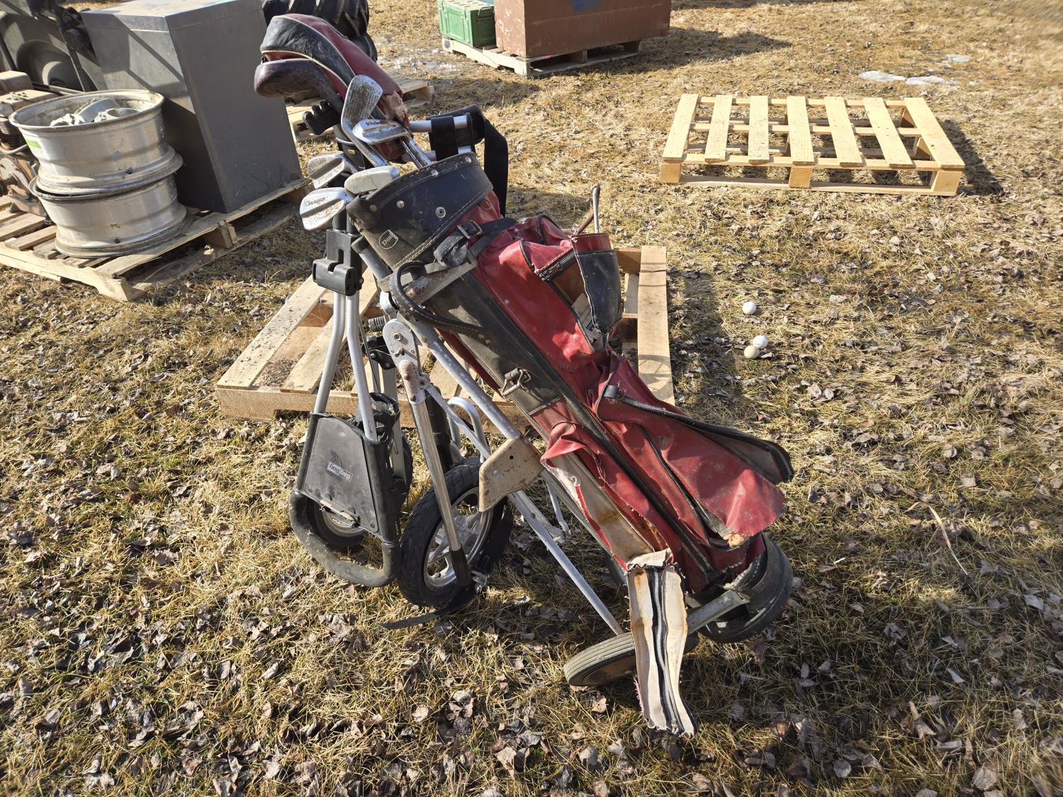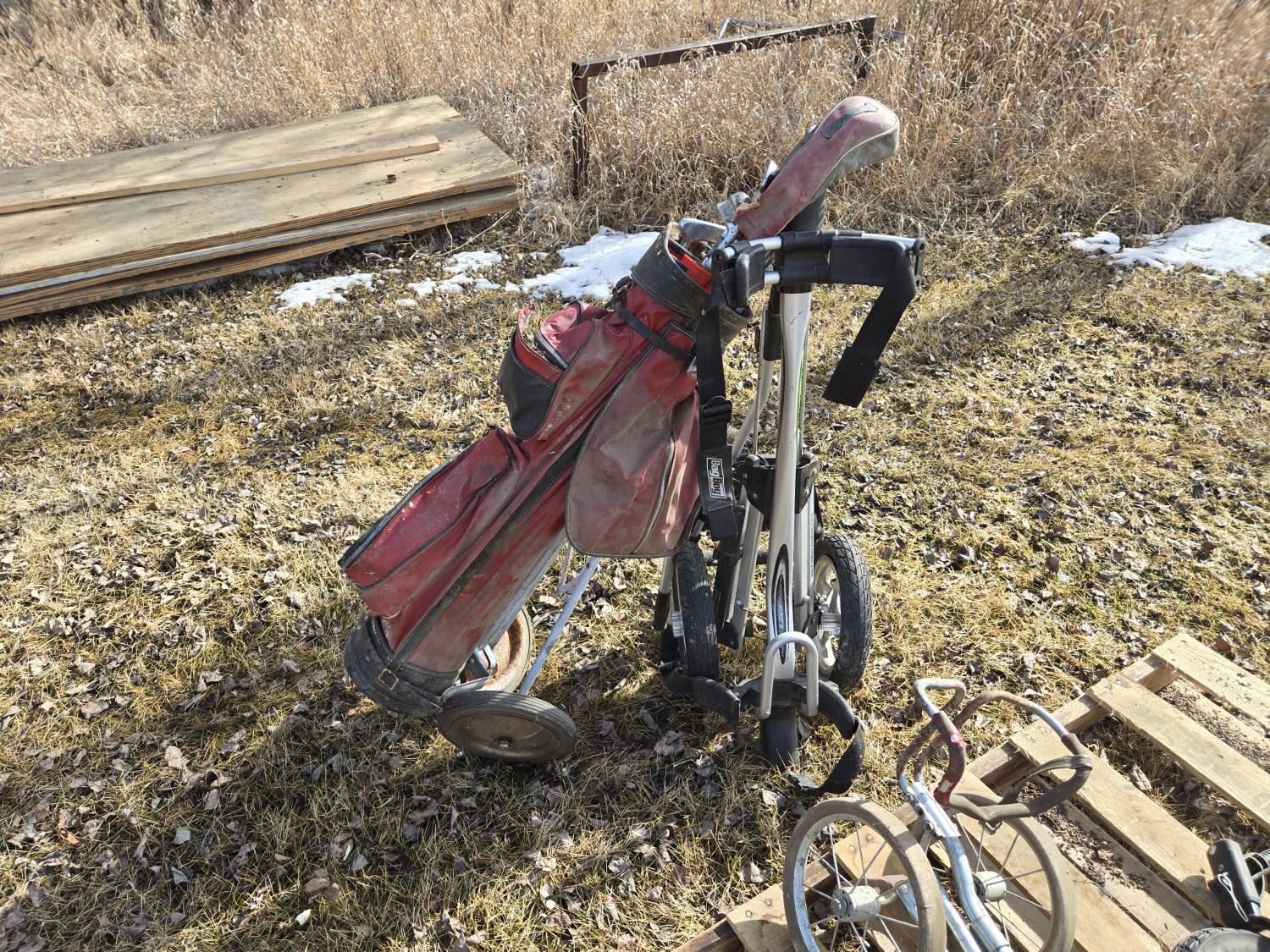 137 (3) Golf Bag Trolleys, (7) Golf Clubs with Bag, (1) Extra Wheel