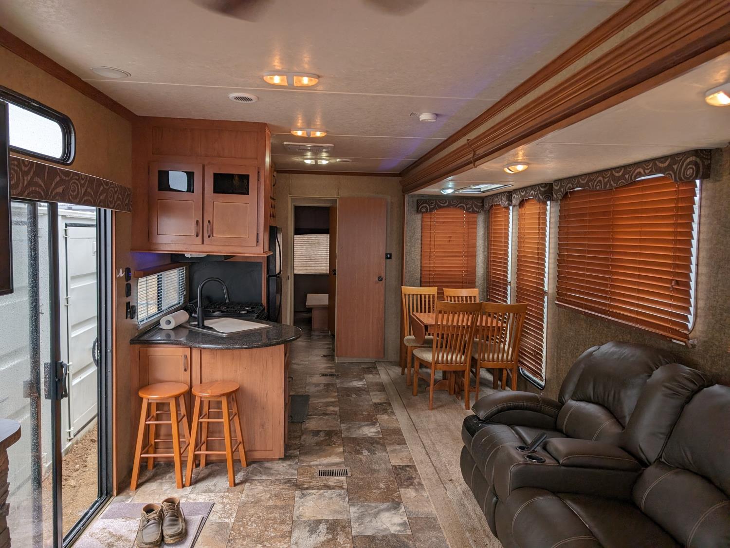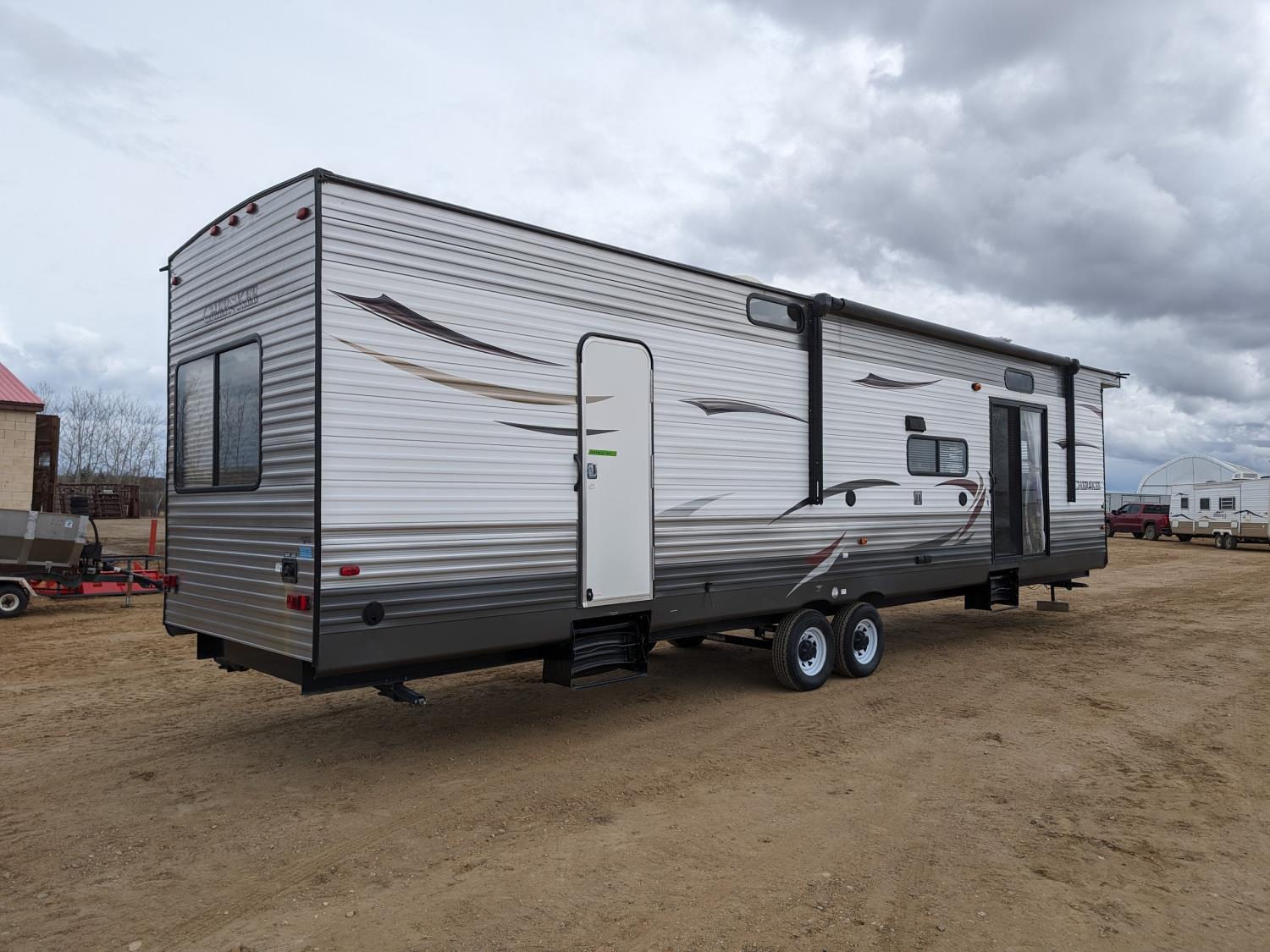 stove, fridge, microwave, full bath, master bedroom, A/C, 2 slides, power awning, spring suspension, electric brakes, 225/75R15 tires