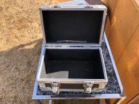 (2) metal boxes, display shelf 52 inch L X 10 inch D X 31 inch H, (2) tables (1) 25 inch X 19 inch X 20 inch high, (1) 26 inch X 22 inch X 20 inch high