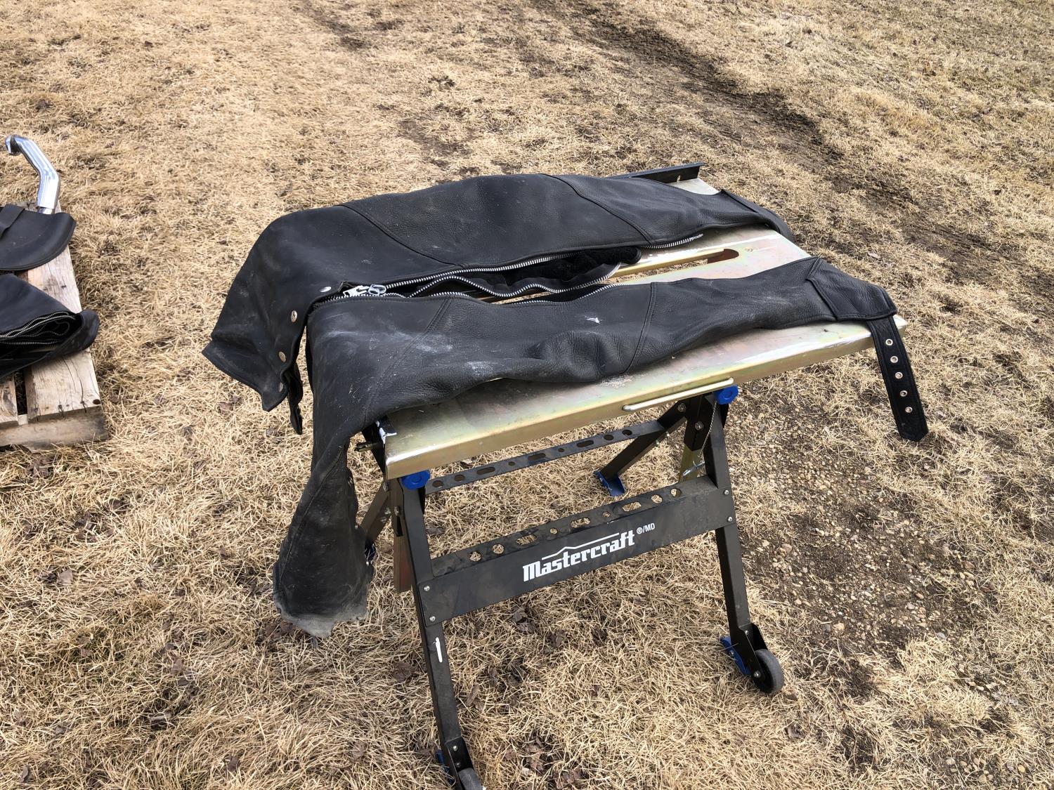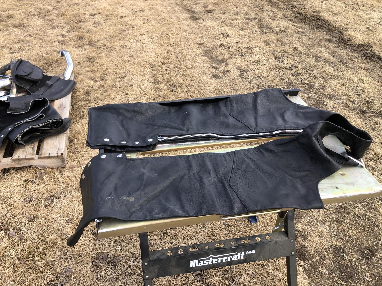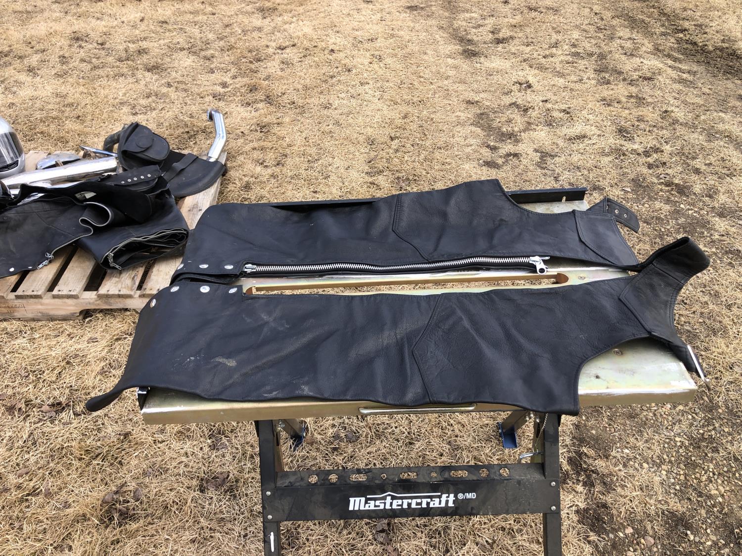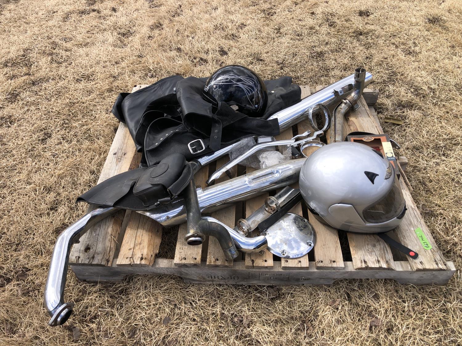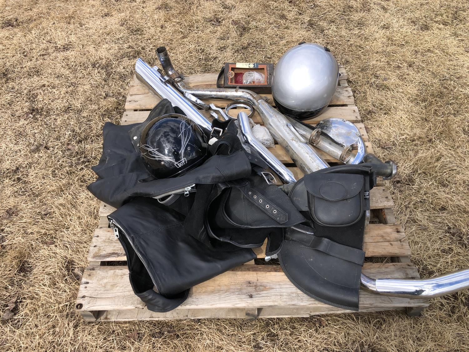 complete exhaust system for 2005 Electra Glide Harley Davidson with 35,000 km on it, HD full face helmet, (3) leather chaps, open face Harley Davidson helmet, miscellaneous motorcycle parts