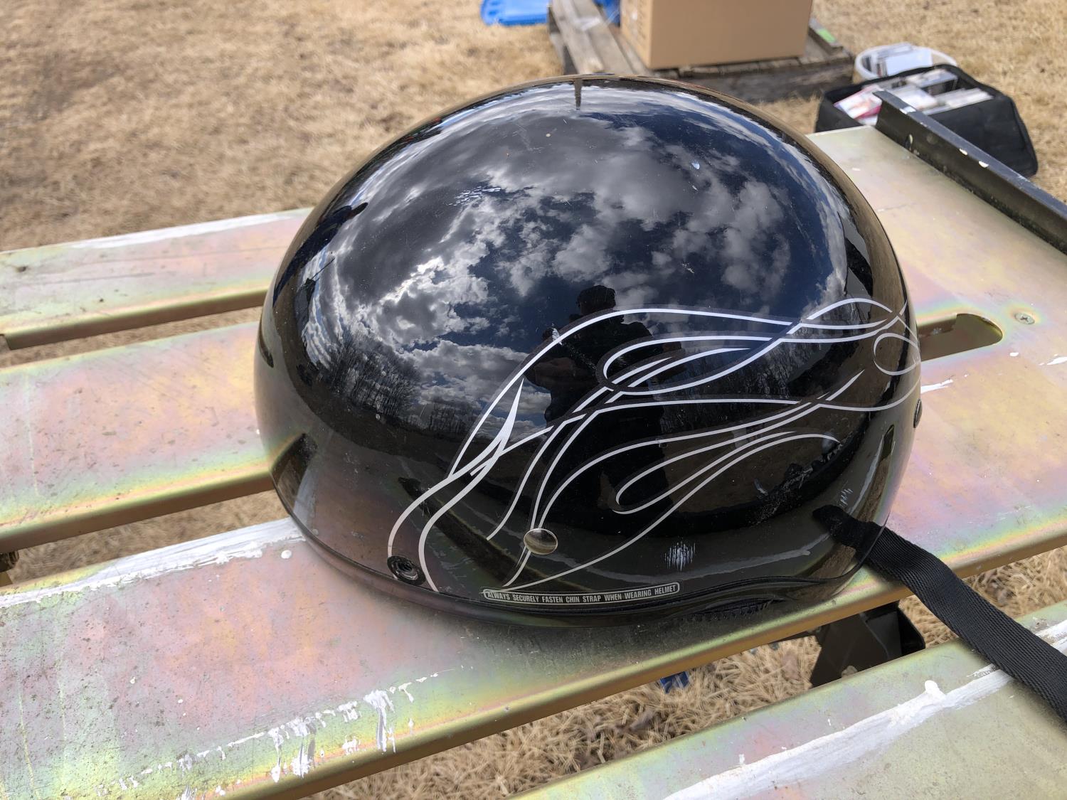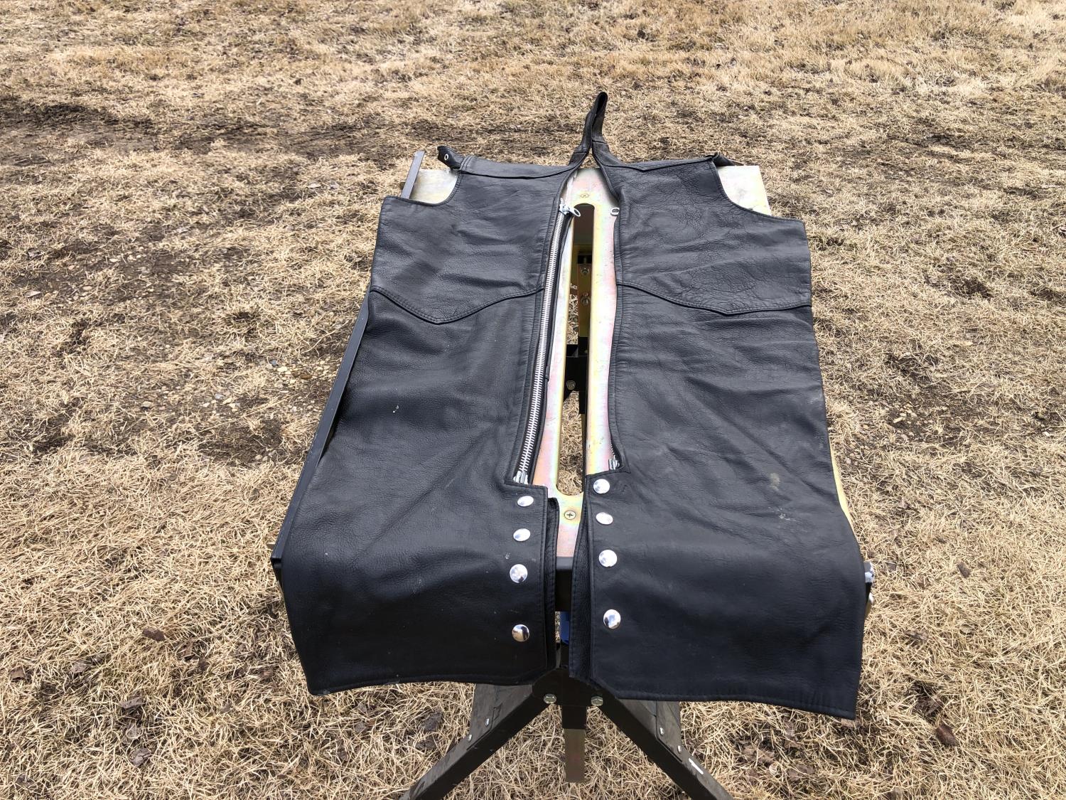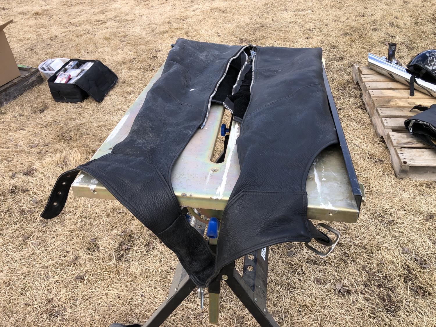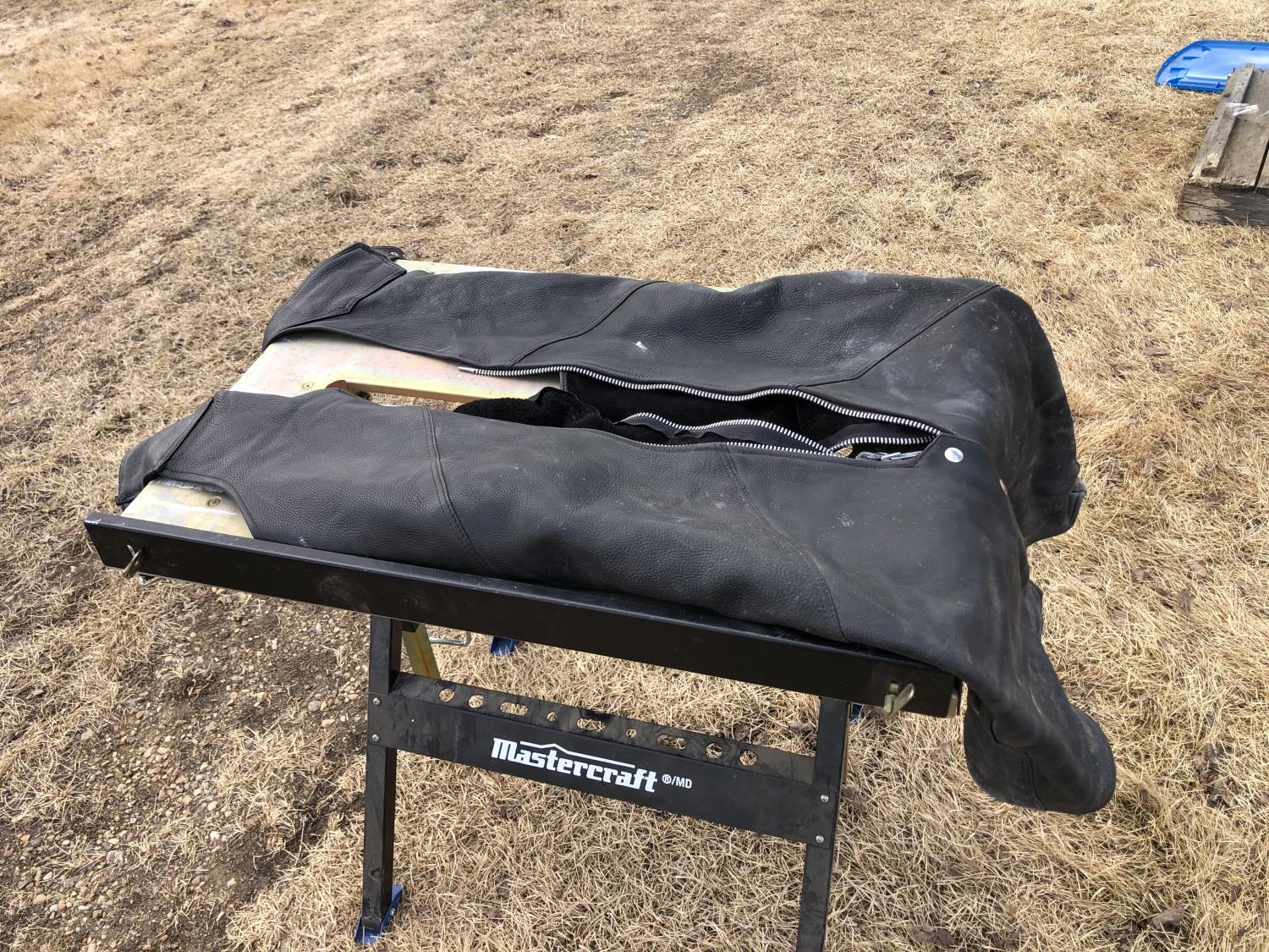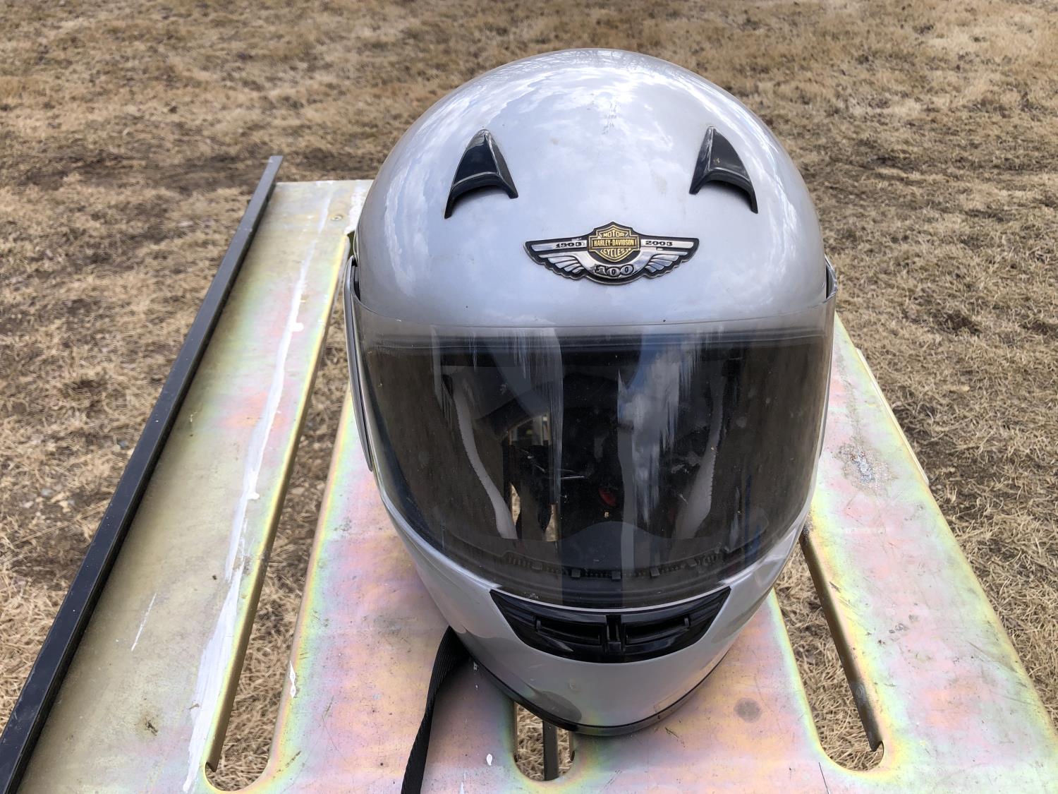 complete exhaust system for 2005 Electra Glide Harley Davidson with 35,000 km on it, HD full face helmet, (3) leather chaps, open face Harley Davidson helmet, miscellaneous motorcycle parts