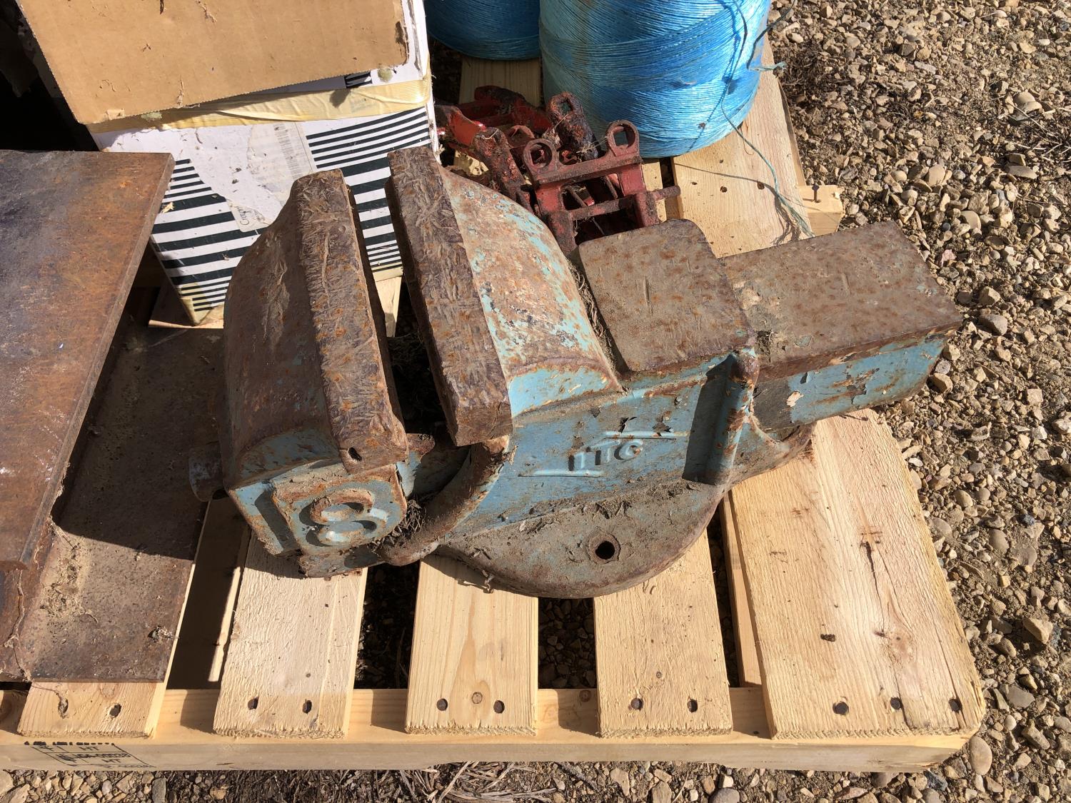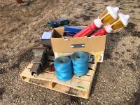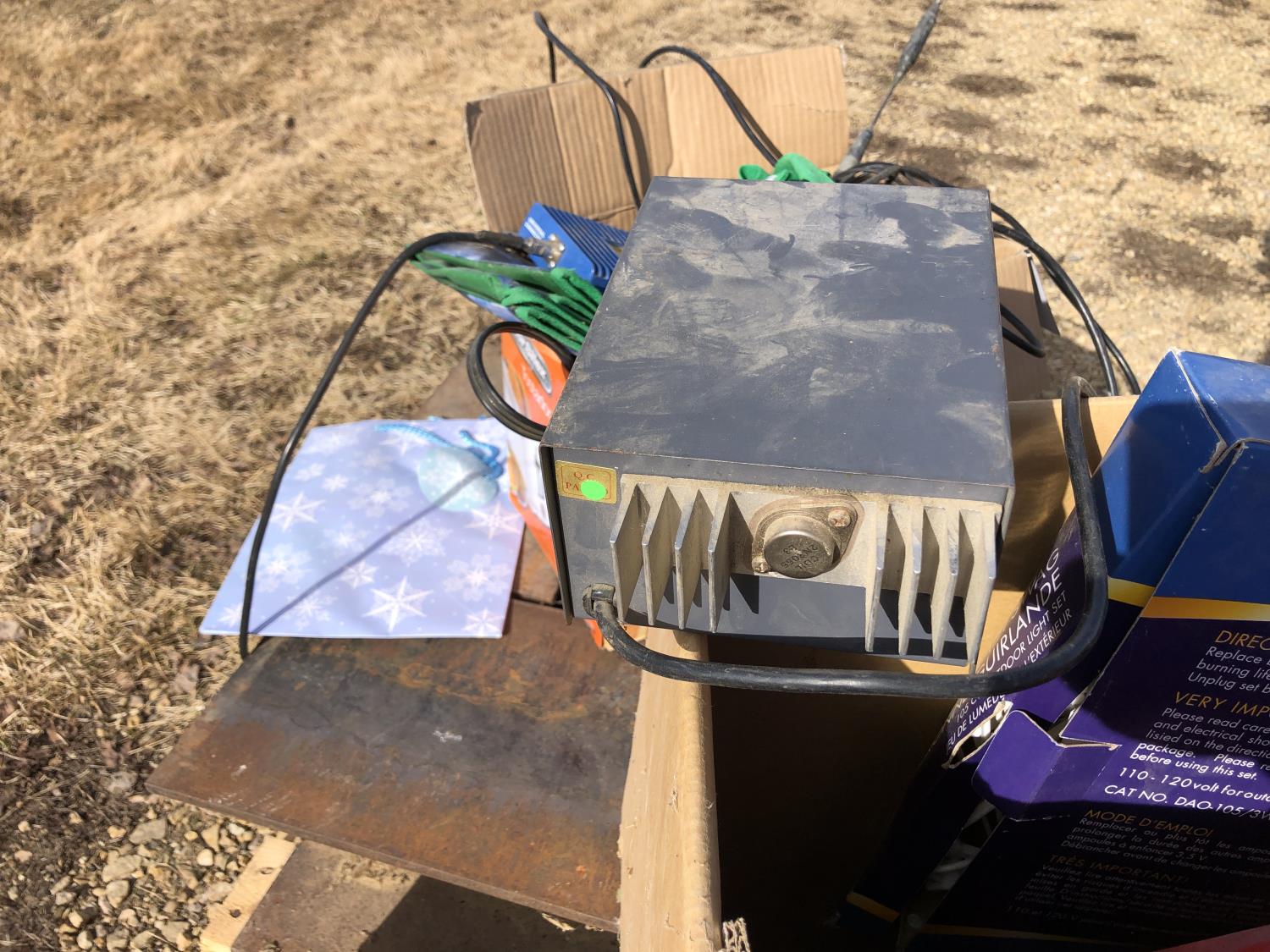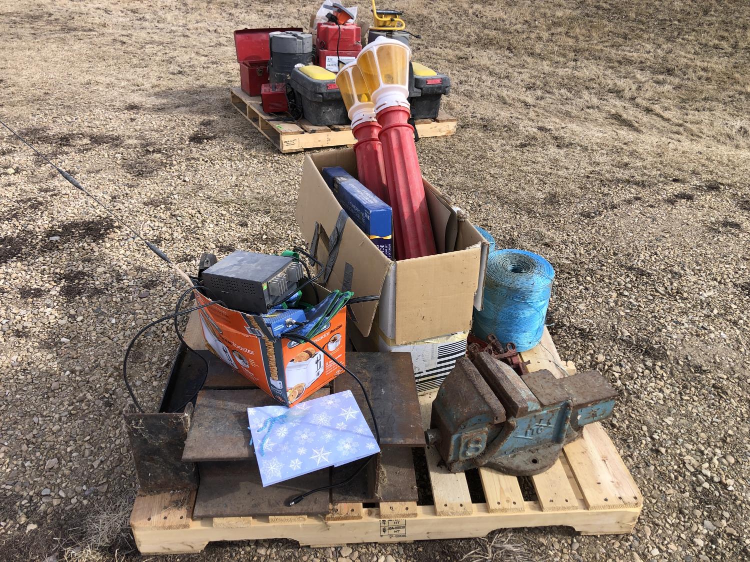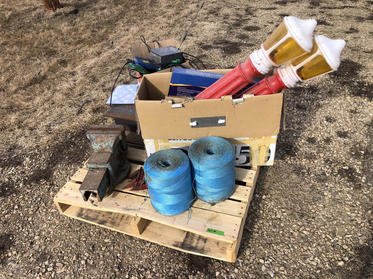 (2) Balls baler twine, 8 inch bench vise, AC-DC power convertor, (2) Wilson phone signal boosters, (4) 12 inch X 12 inch X 8 inch high I beam, Wolf bench grinder, Christmas lights