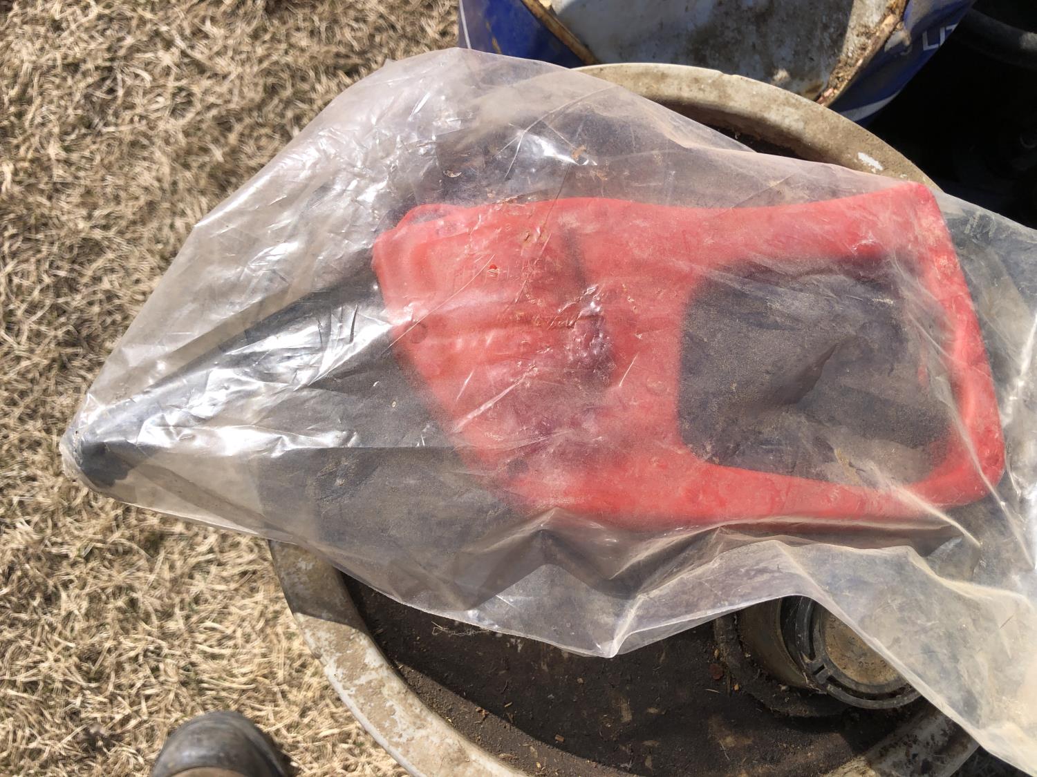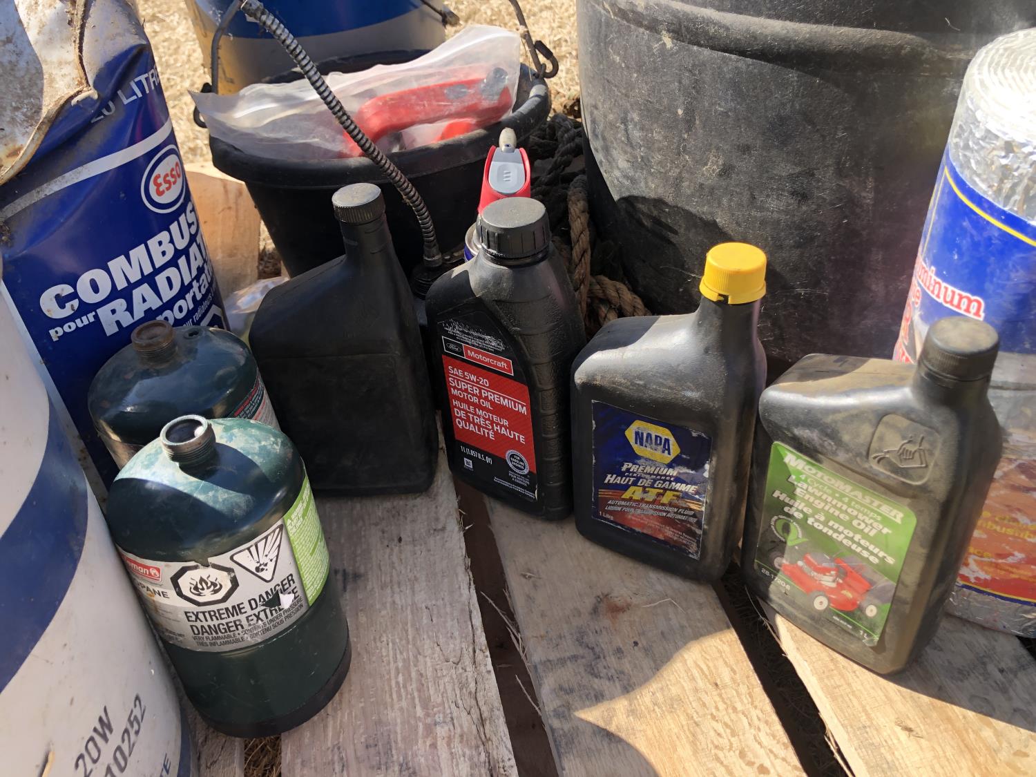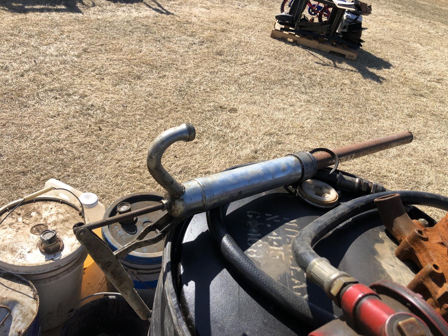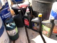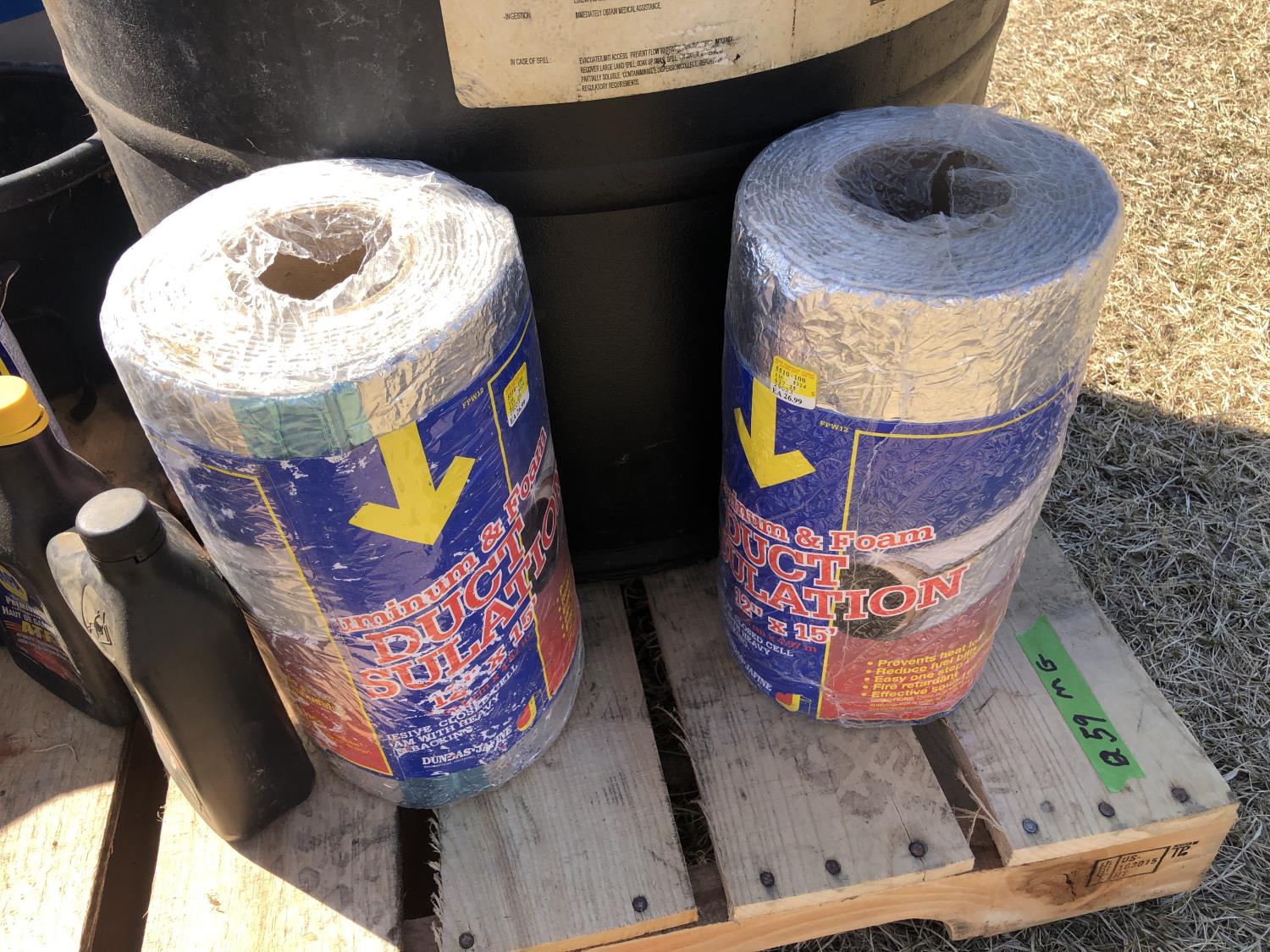 assorted oils, (2) hand pumps, (2) rolls of duct insulation, poly barrel, belt driven pump, poly fuel nozzle