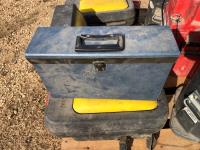 Tool box with contents, (3) drill bit boxes, 12 volt battery charger, quad seat, (2) lights, B&D drill, air mattress