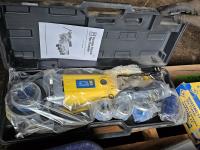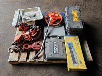 Portable electric pipe threader, 3 ton chain come-a-long, metal steel plate lifter, manual tile cutter, wet tile saw, 18V Lincoln grease gun