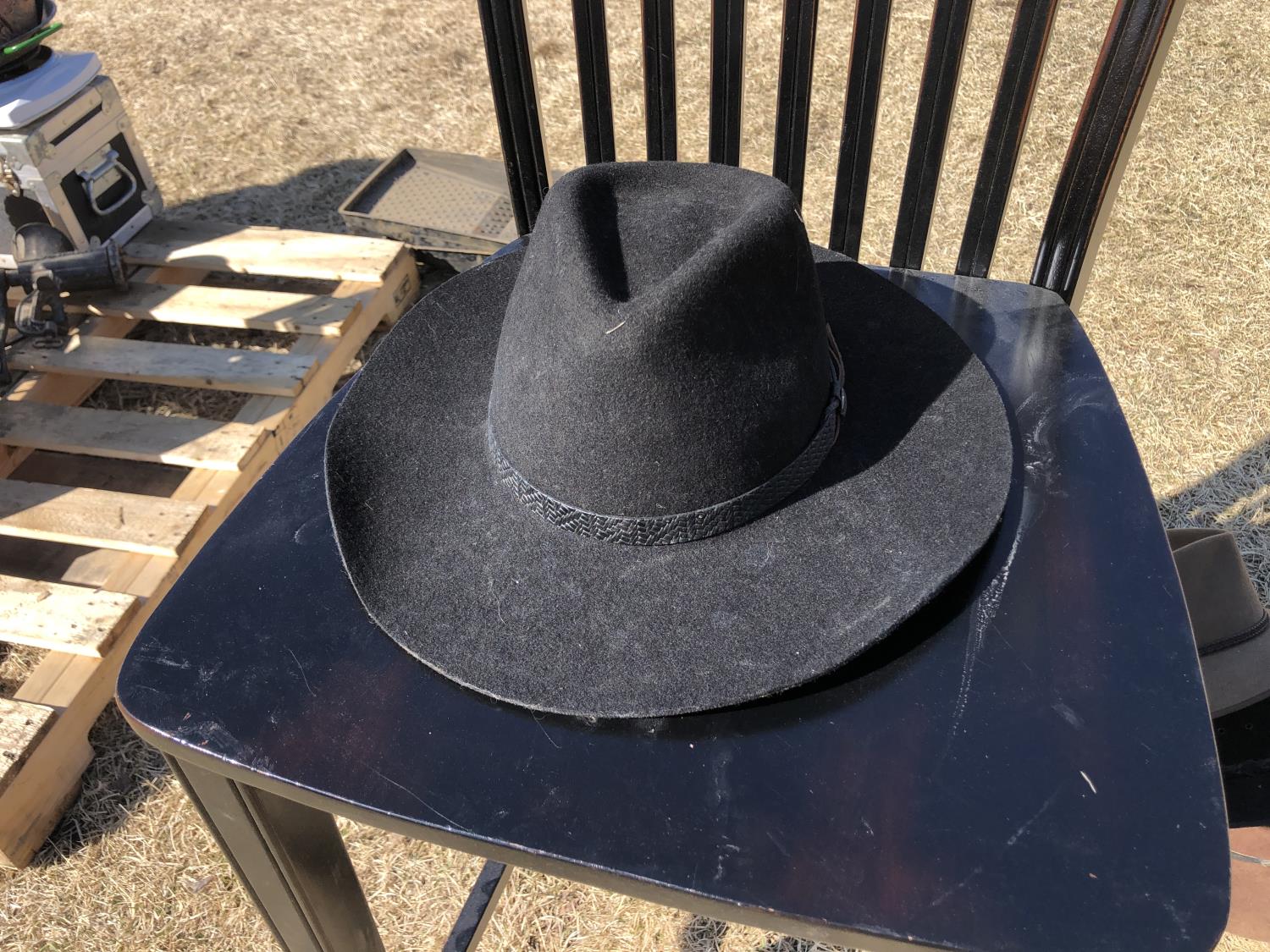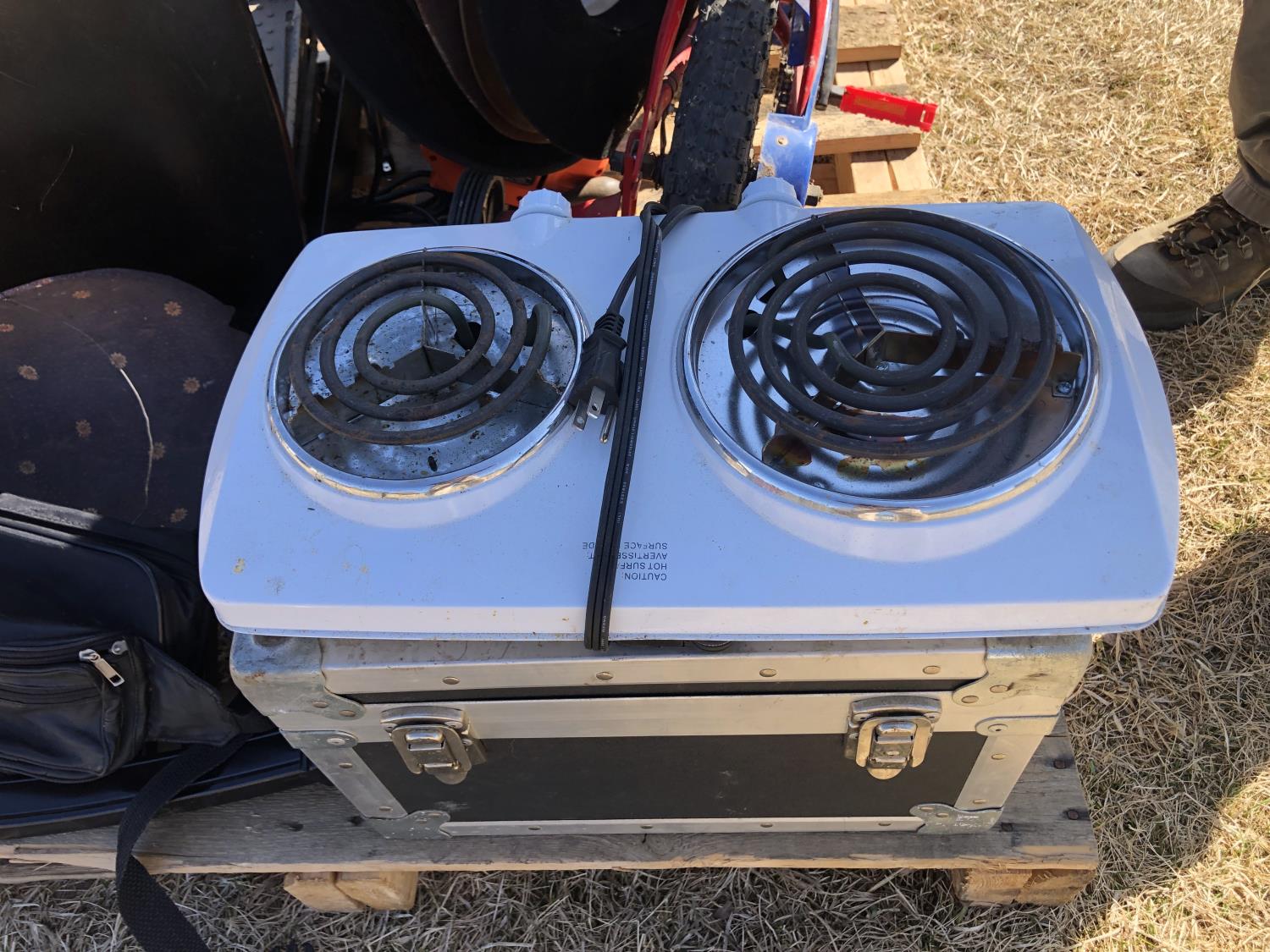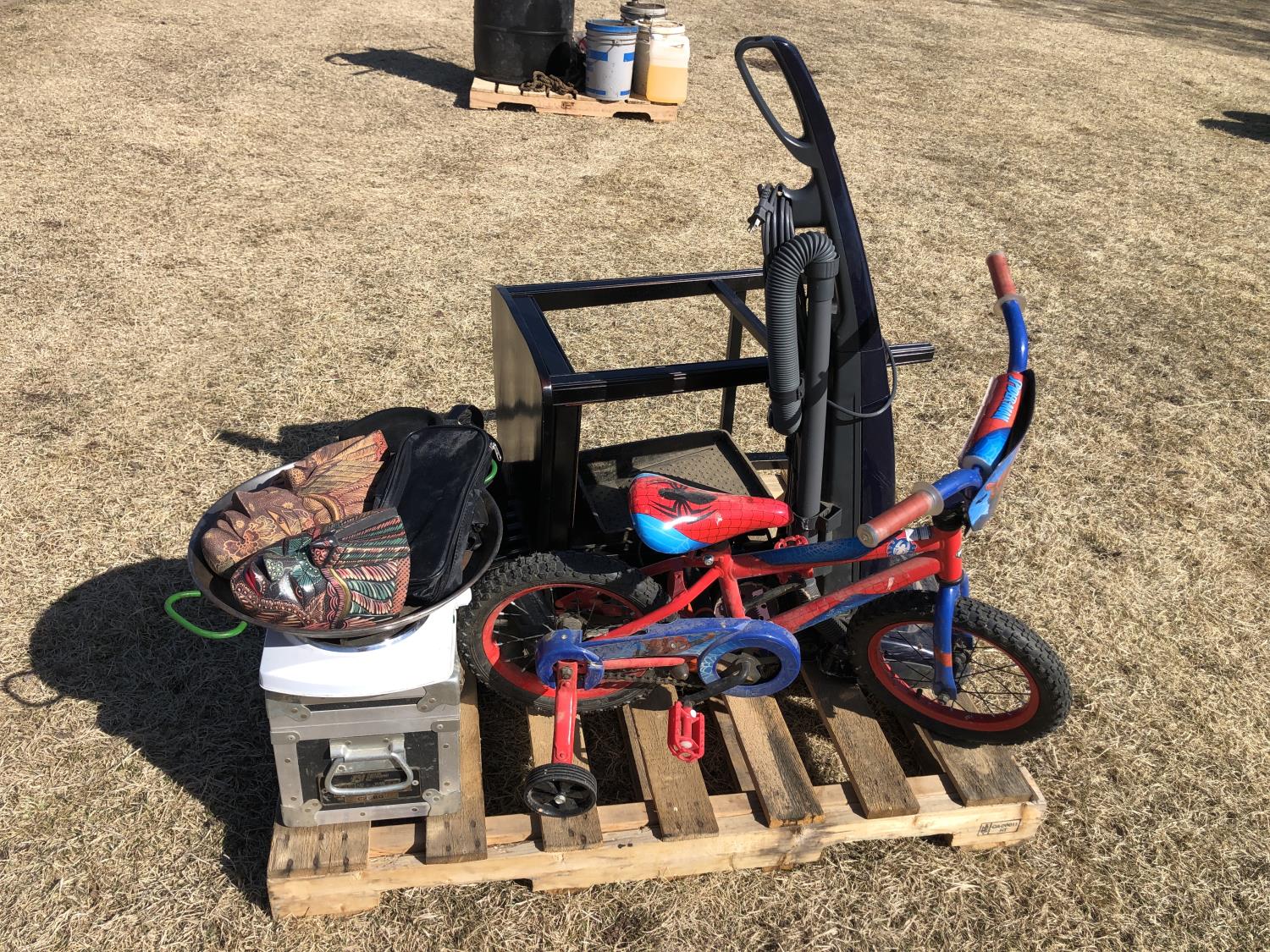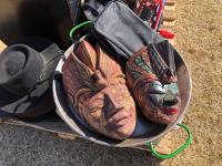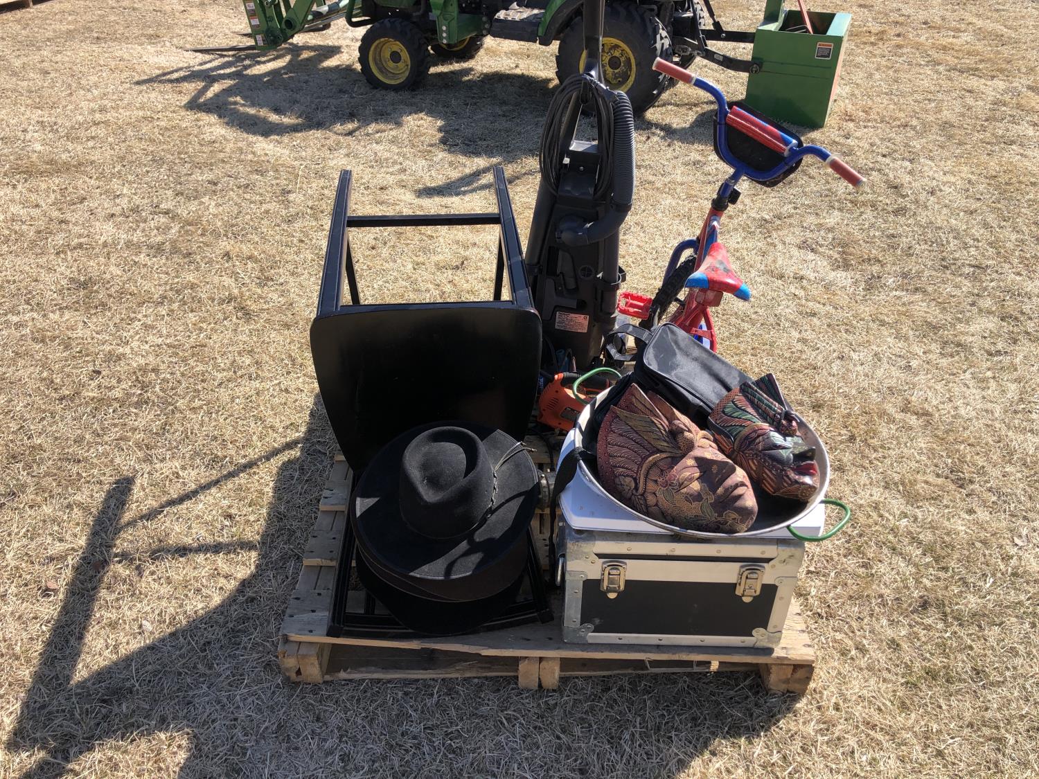 (4) leather cowboy hats, (2) wooden Face decorations, (1) kid's bike, wooden chair, vacuum, meat grinder, electric hot plate, (2) pan roller pans, metal storage box filled with hats, travel pack, wok, etc.