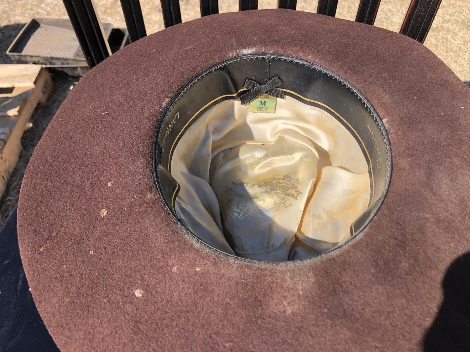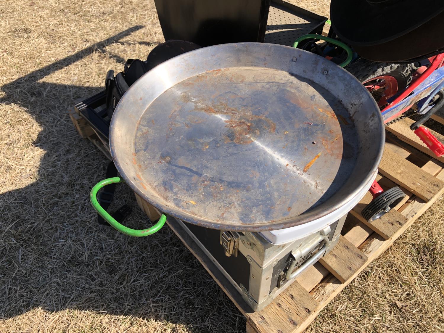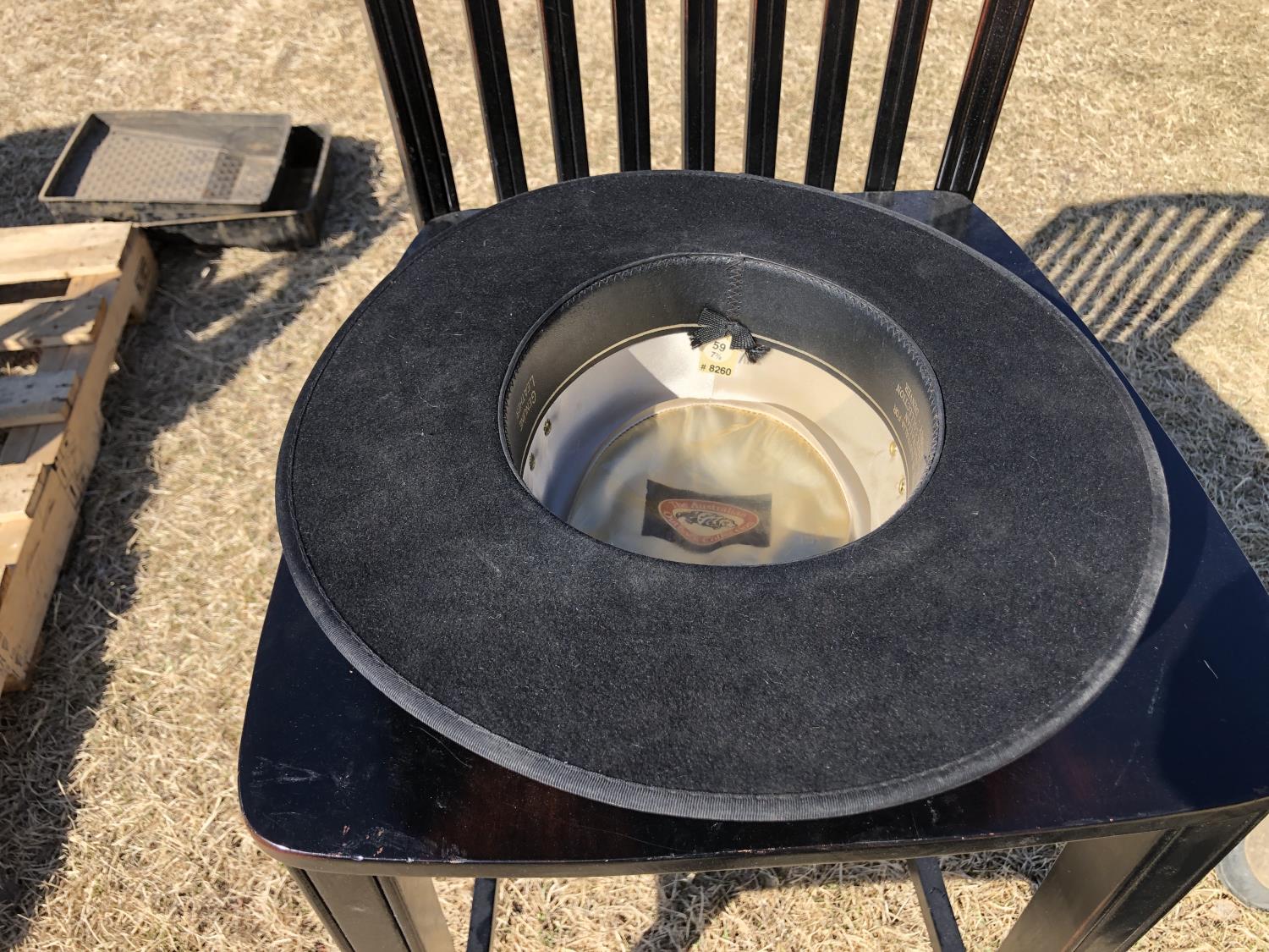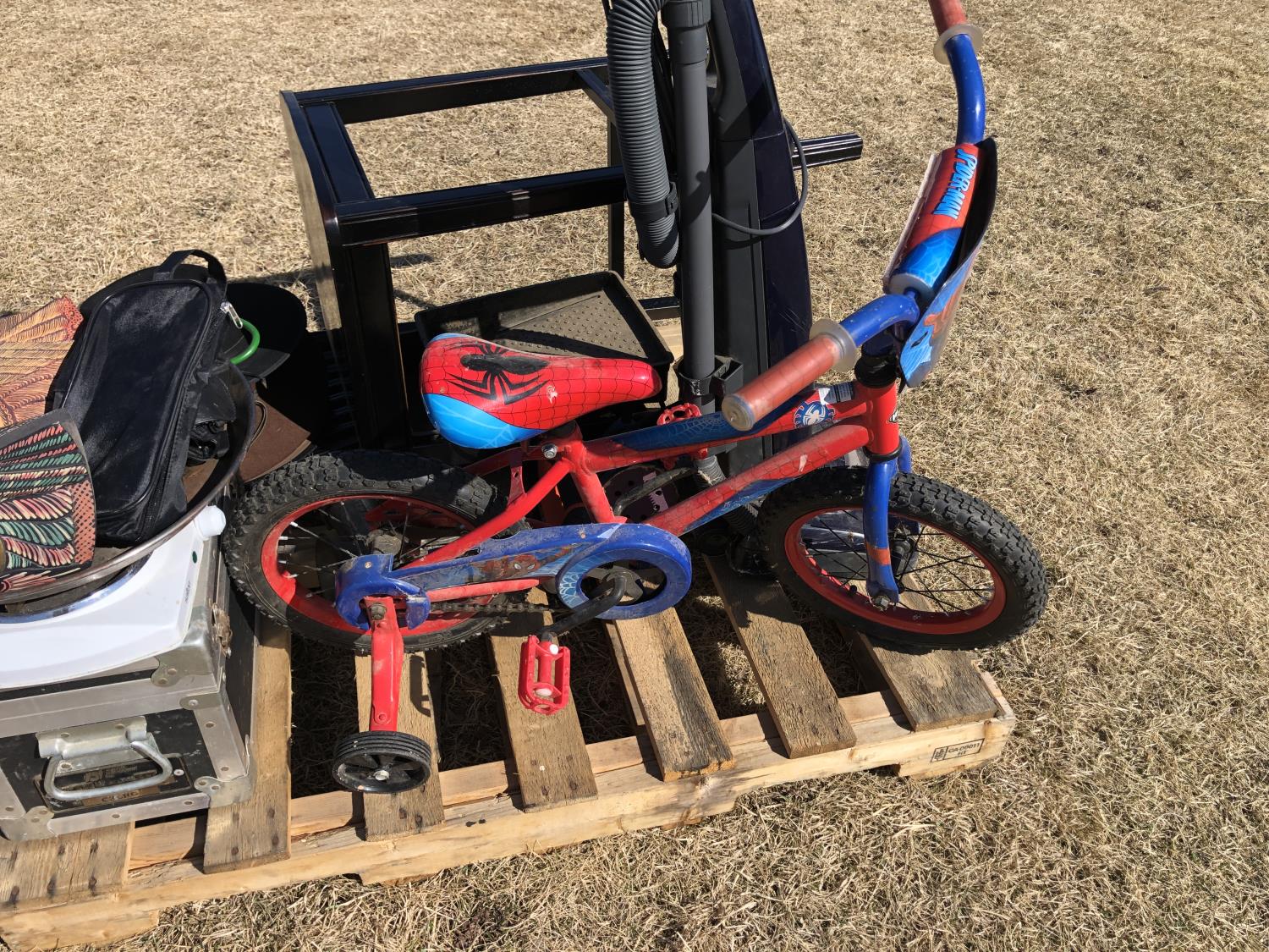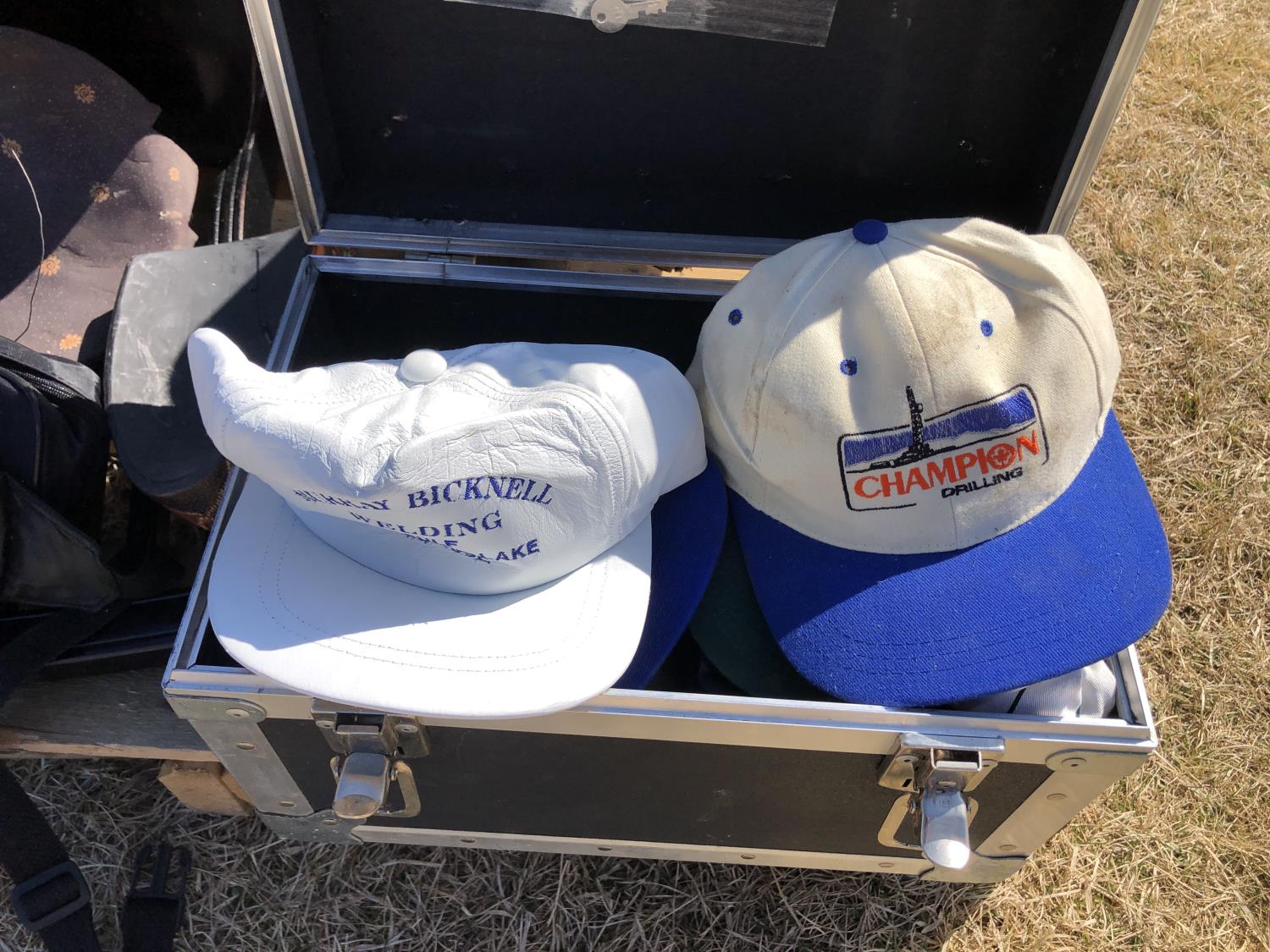 (4) leather cowboy hats, (2) wooden Face decorations, (1) kid's bike, wooden chair, vacuum, meat grinder, electric hot plate, (2) pan roller pans, metal storage box filled with hats, travel pack, wok, etc.