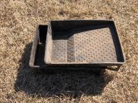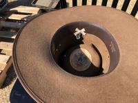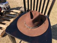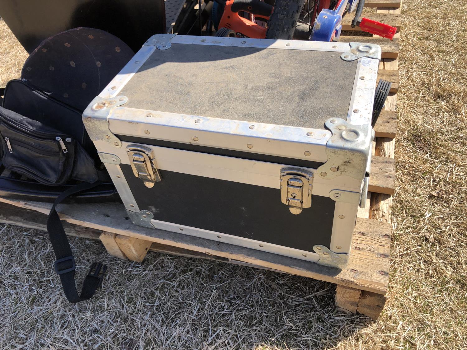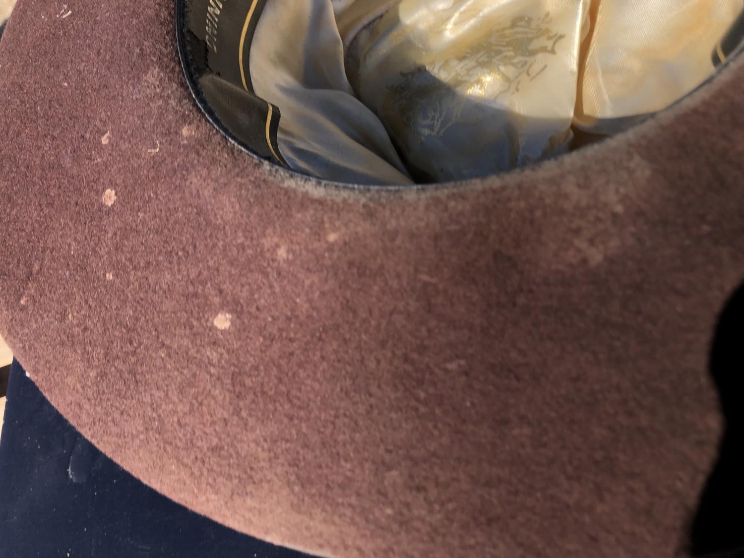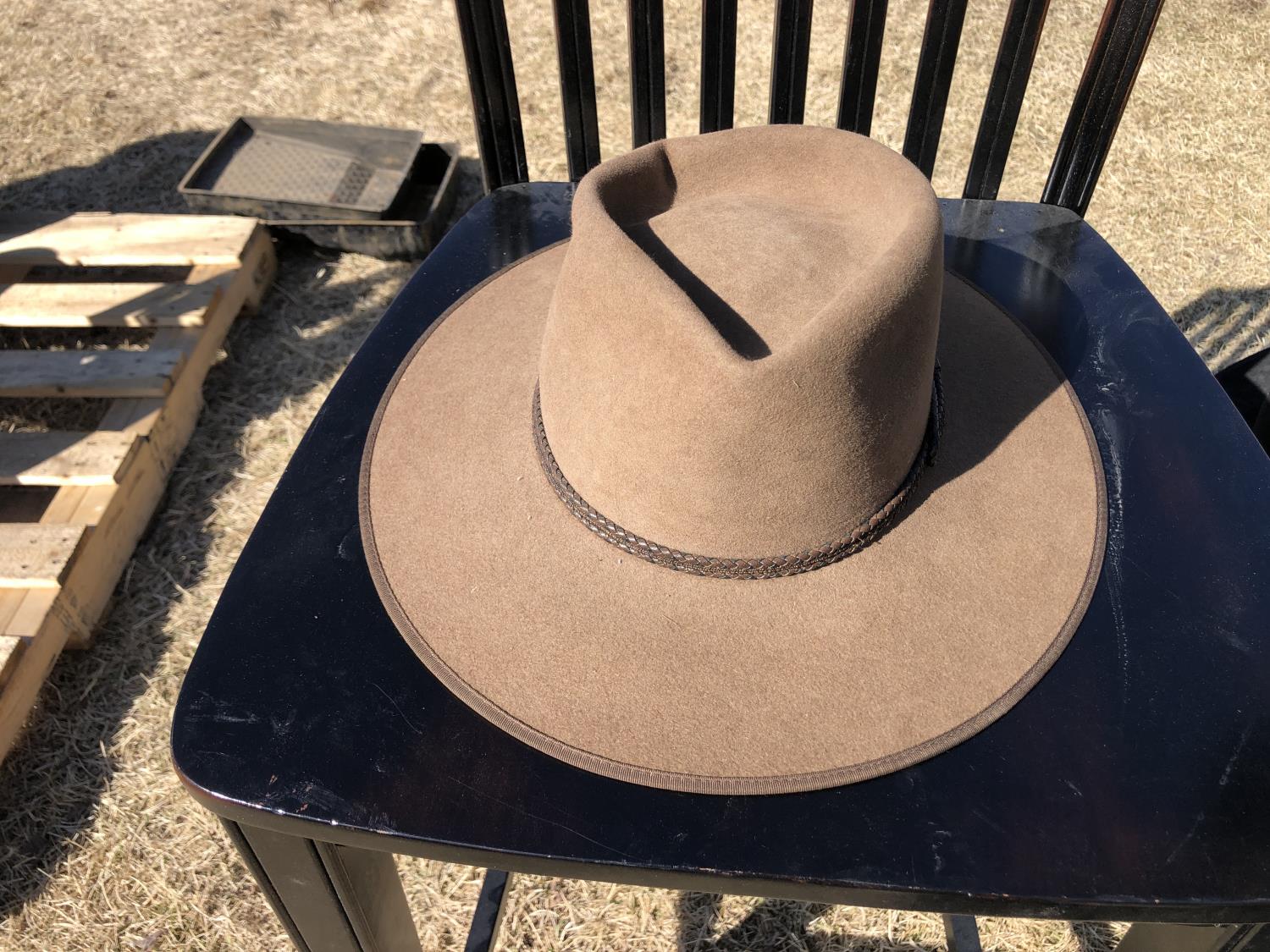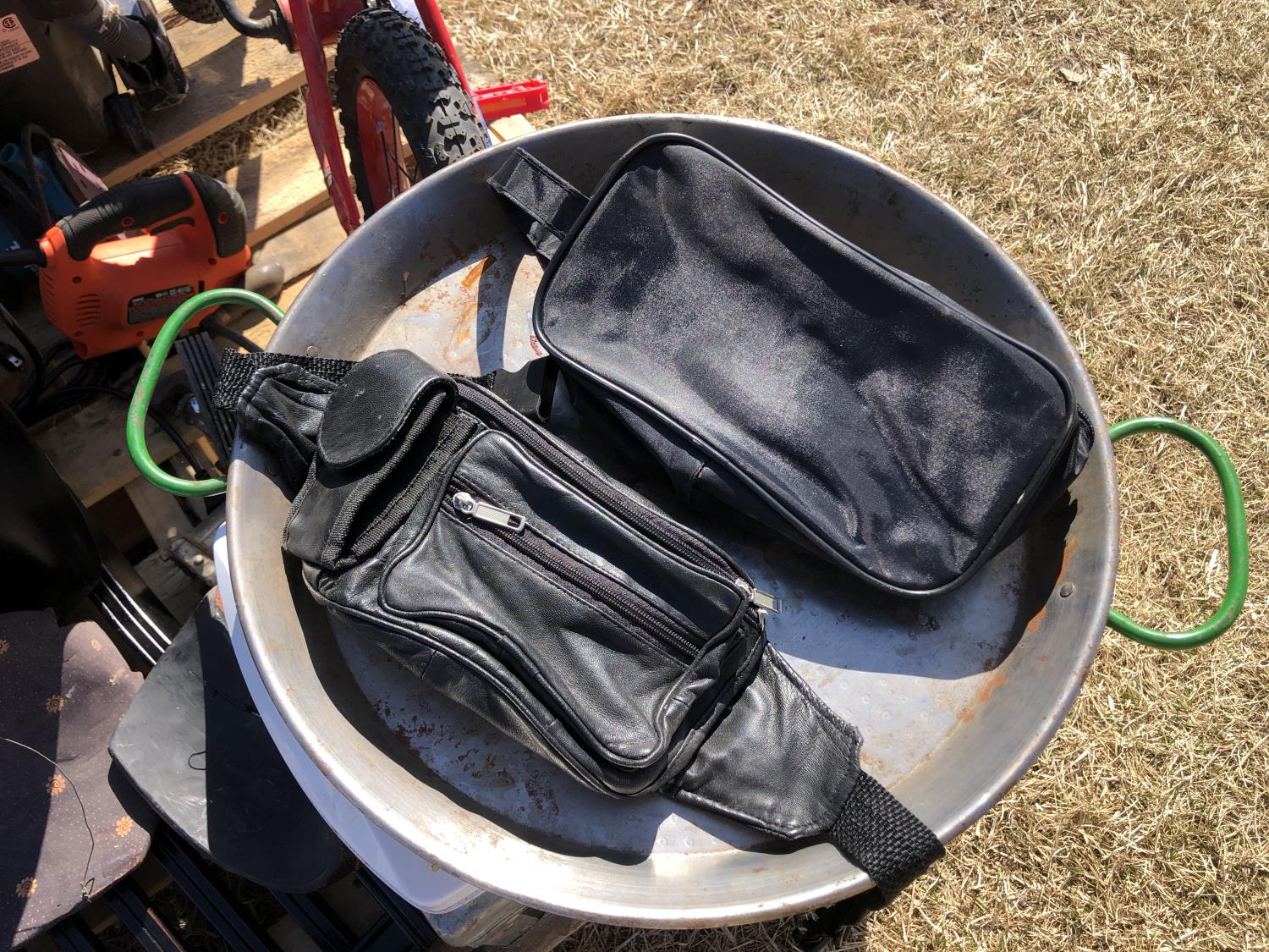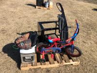 (4) leather cowboy hats, (2) wooden Face decorations, (1) kid's bike, wooden chair, vacuum, meat grinder, electric hot plate, (2) pan roller pans, metal storage box filled with hats, travel pack, wok, etc.
