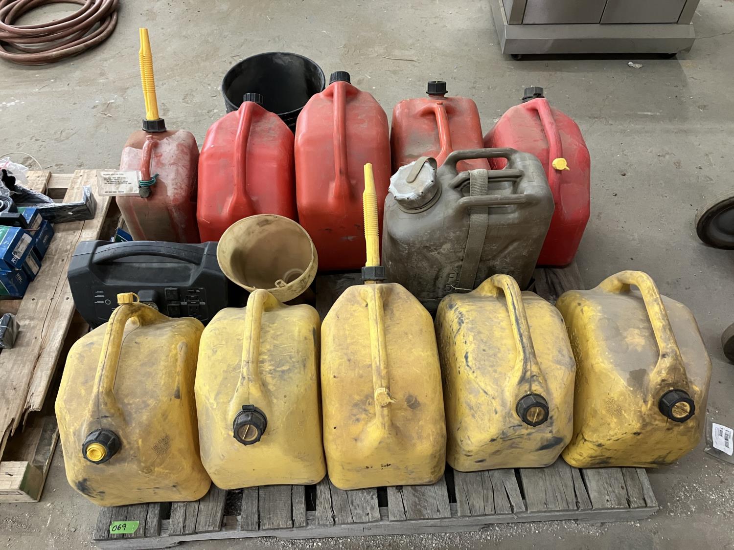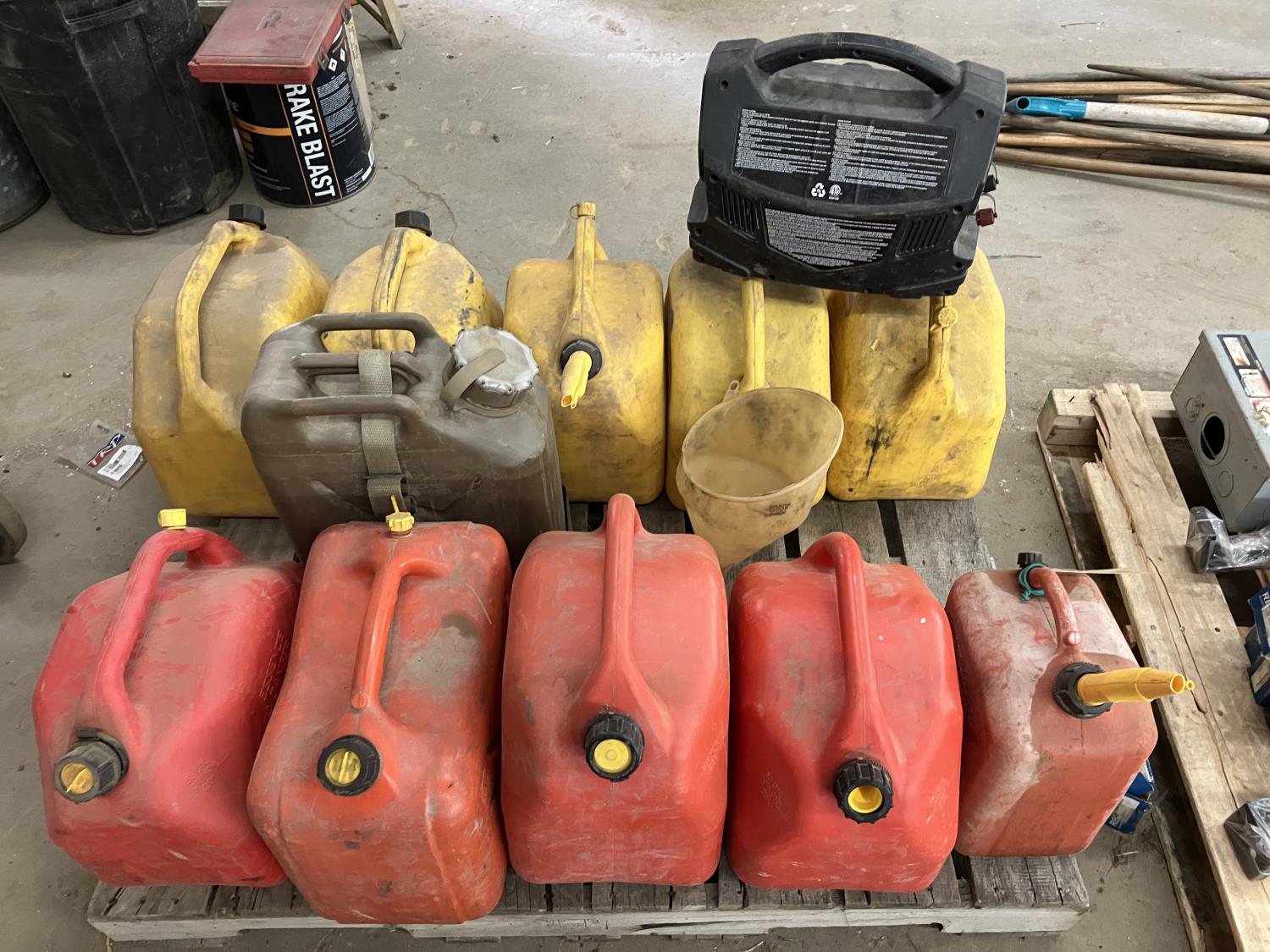 (9) poly 5 gallon Jerry cans, (3) 3 gallon poly Jerry cans, (1) 5 gallon steel army Jerry can, funnel
