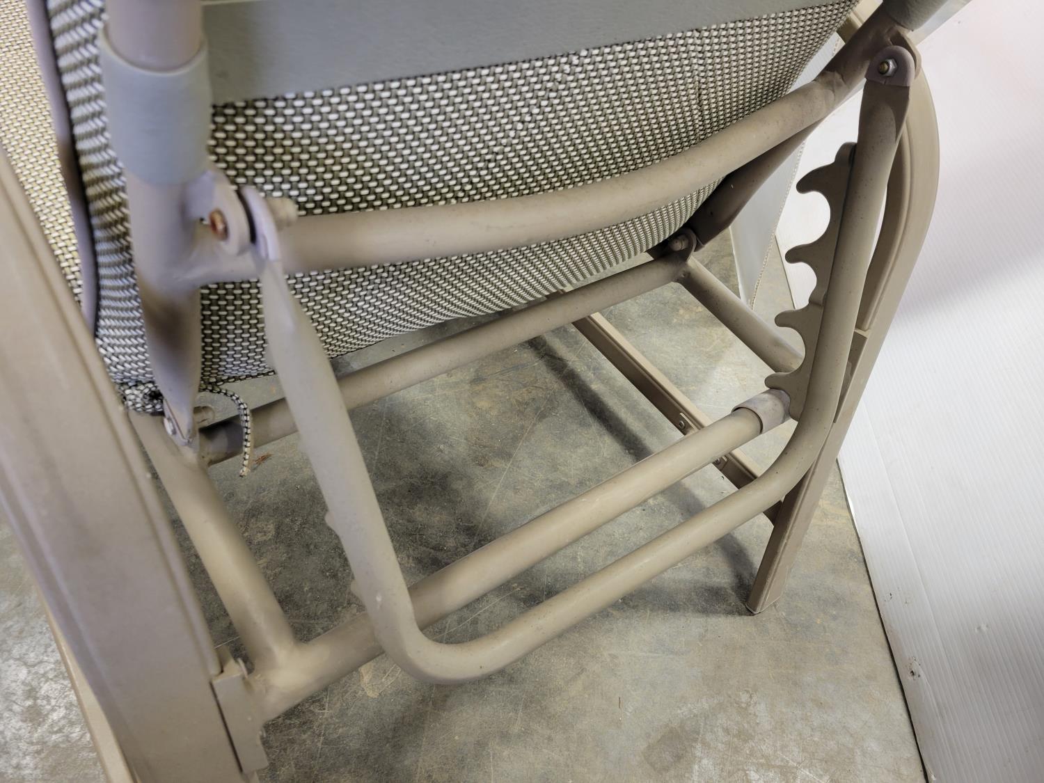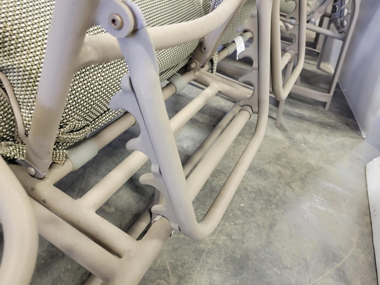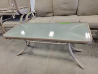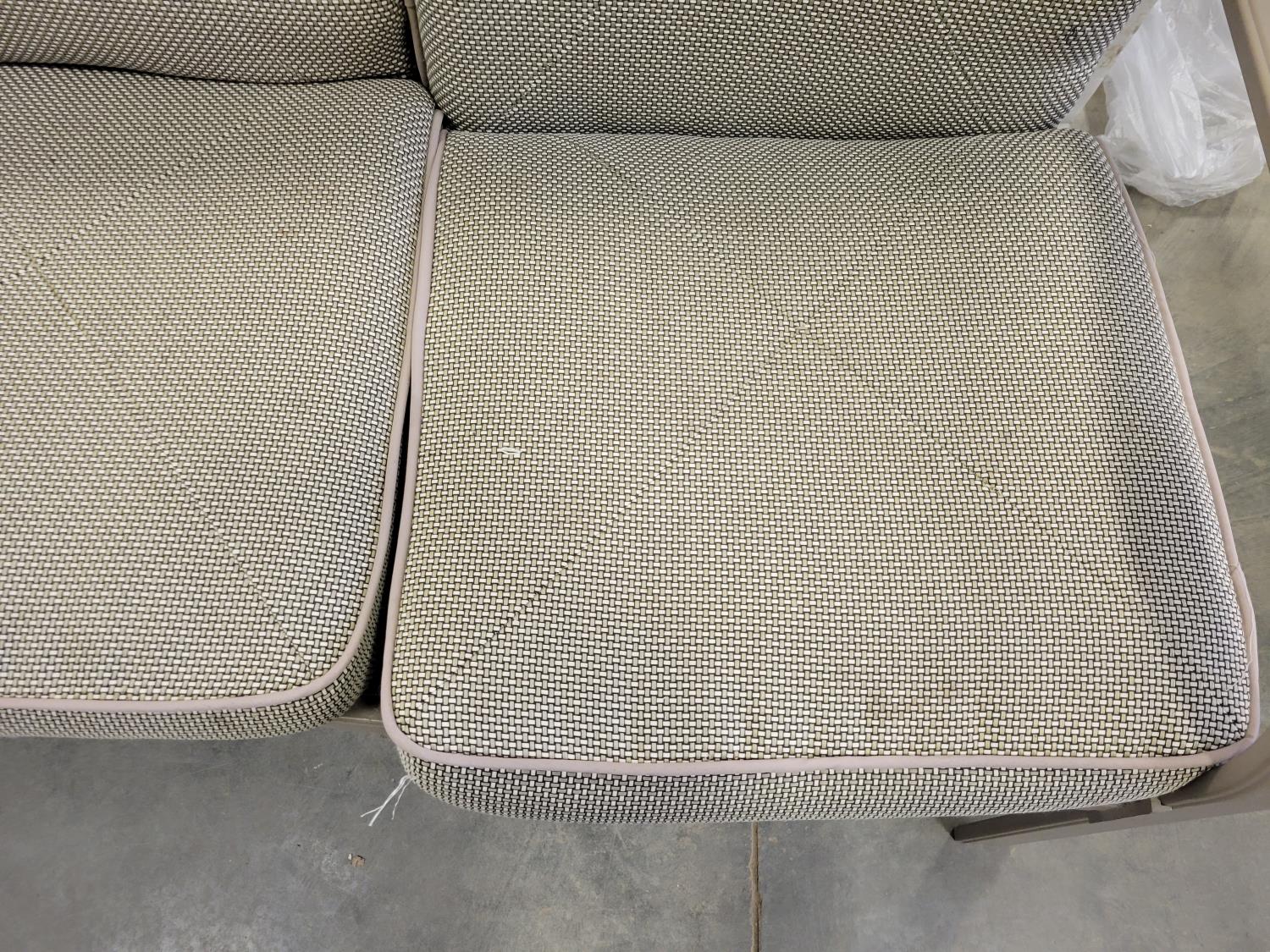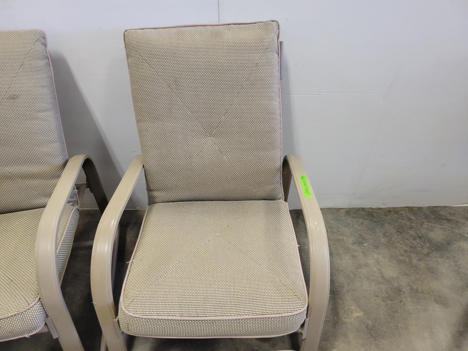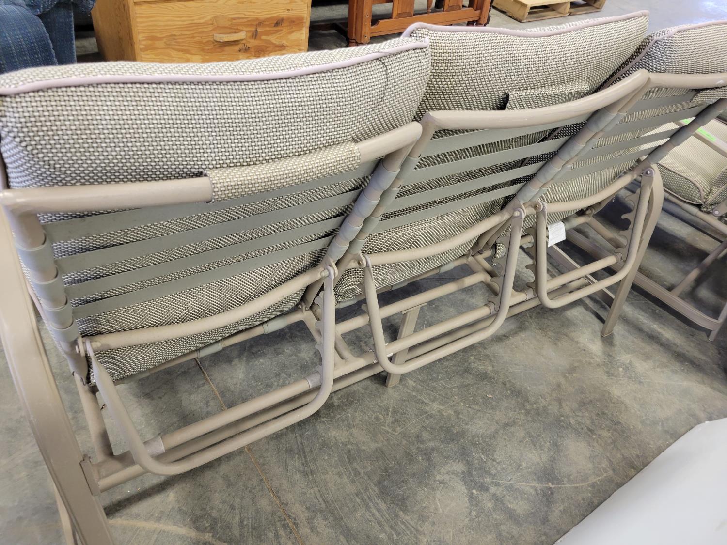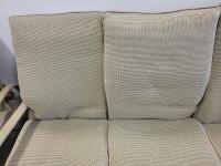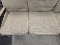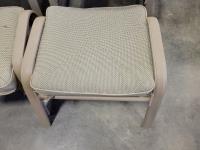 coffee table, 3 seater bench with cushions, (2) chairs with foot stools with cushions