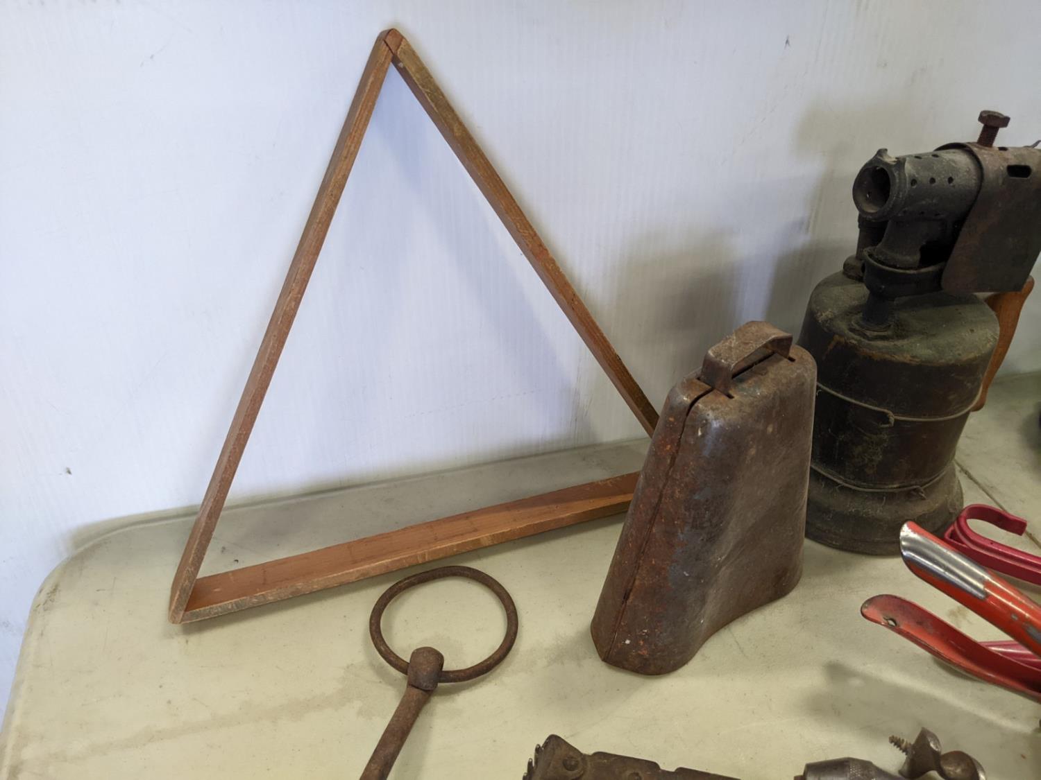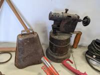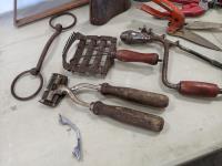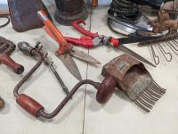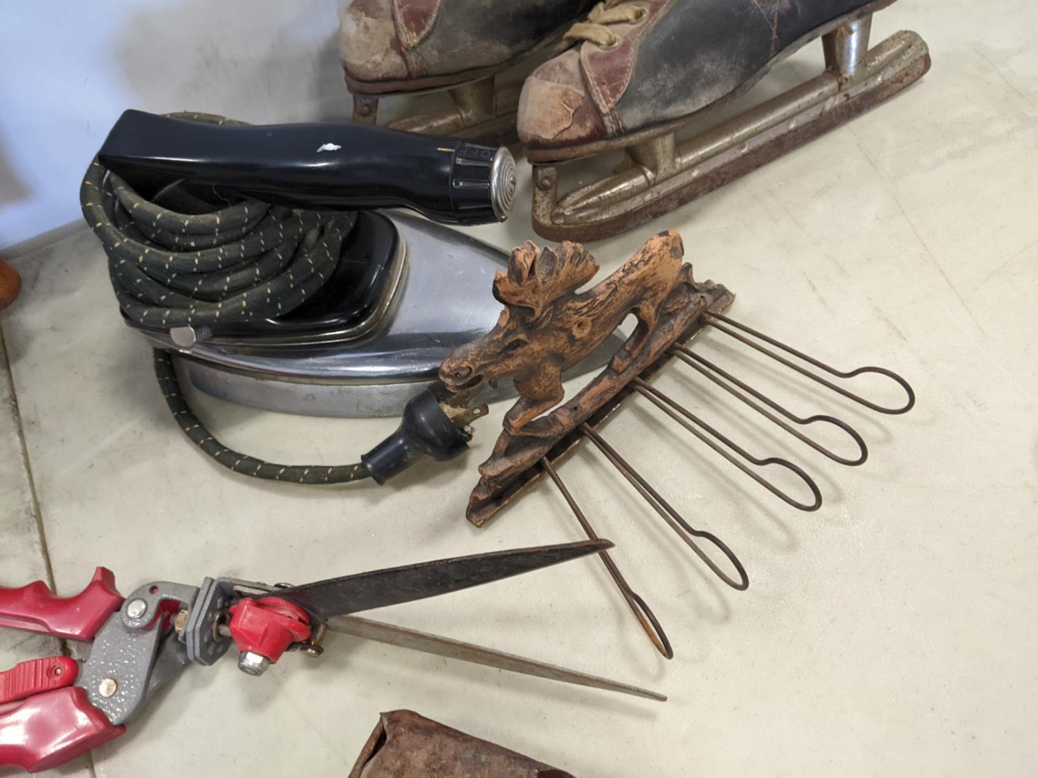 Skates, iron, bee smoker, clippers, drill, shears