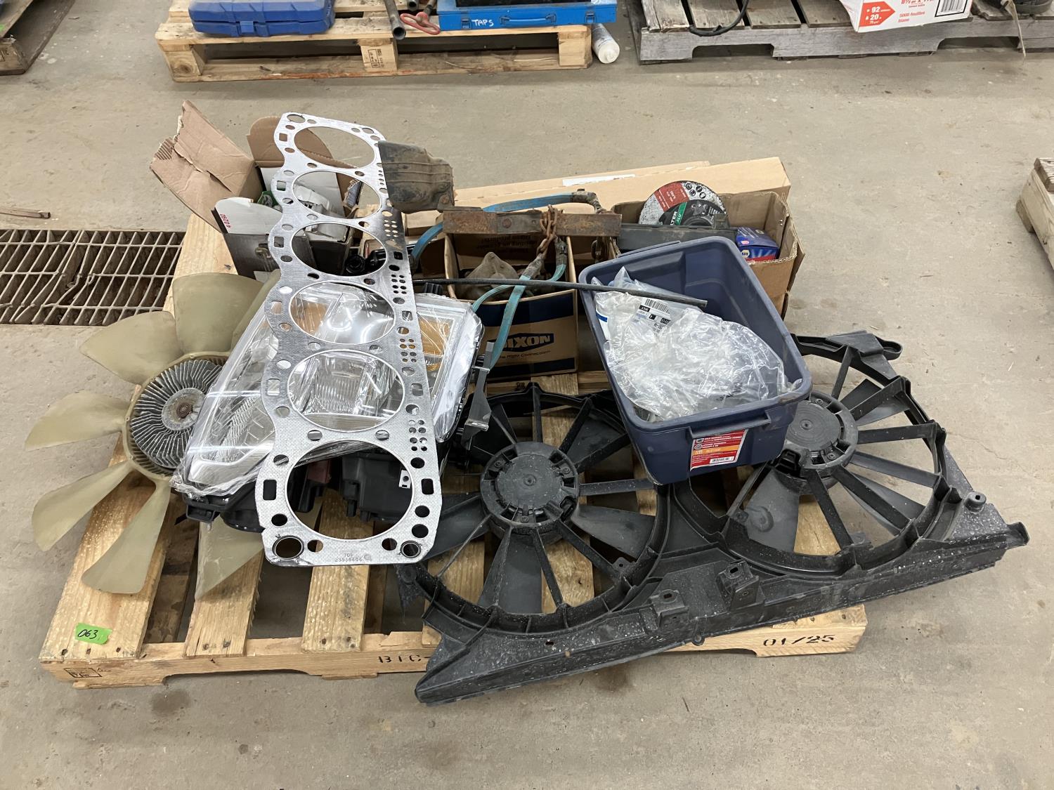 New F250 alternator, (3) new F250 shock absorbers, used starter, new headlight unit for 2018 Ford F150, electric fan for Ford 2018 F150, miscellaneous Ford parts