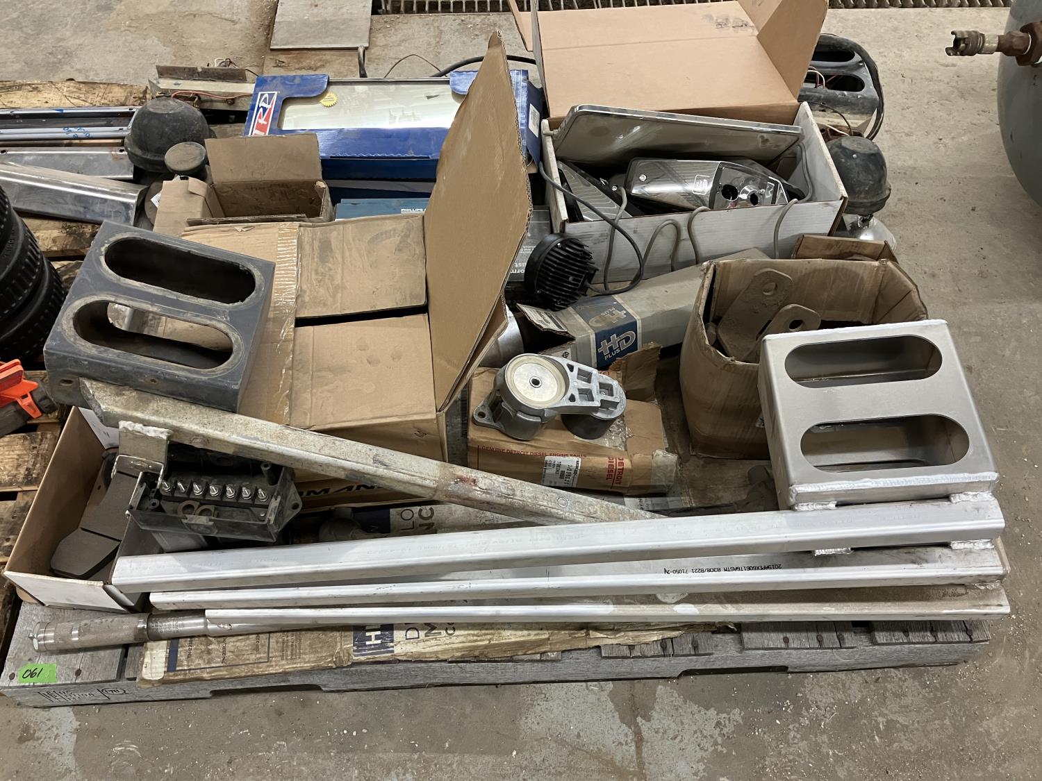 (3) New aluminum light brackets, (2) used light brackets, (1) new trailer hub, (2) exhaust clamps, (4) new Paccar cab lights, Unused Detroit idler pulley, (3) aluminum mounting brackets, torque arm for differential, heavy duty block heater, scale pad mounting brackets,