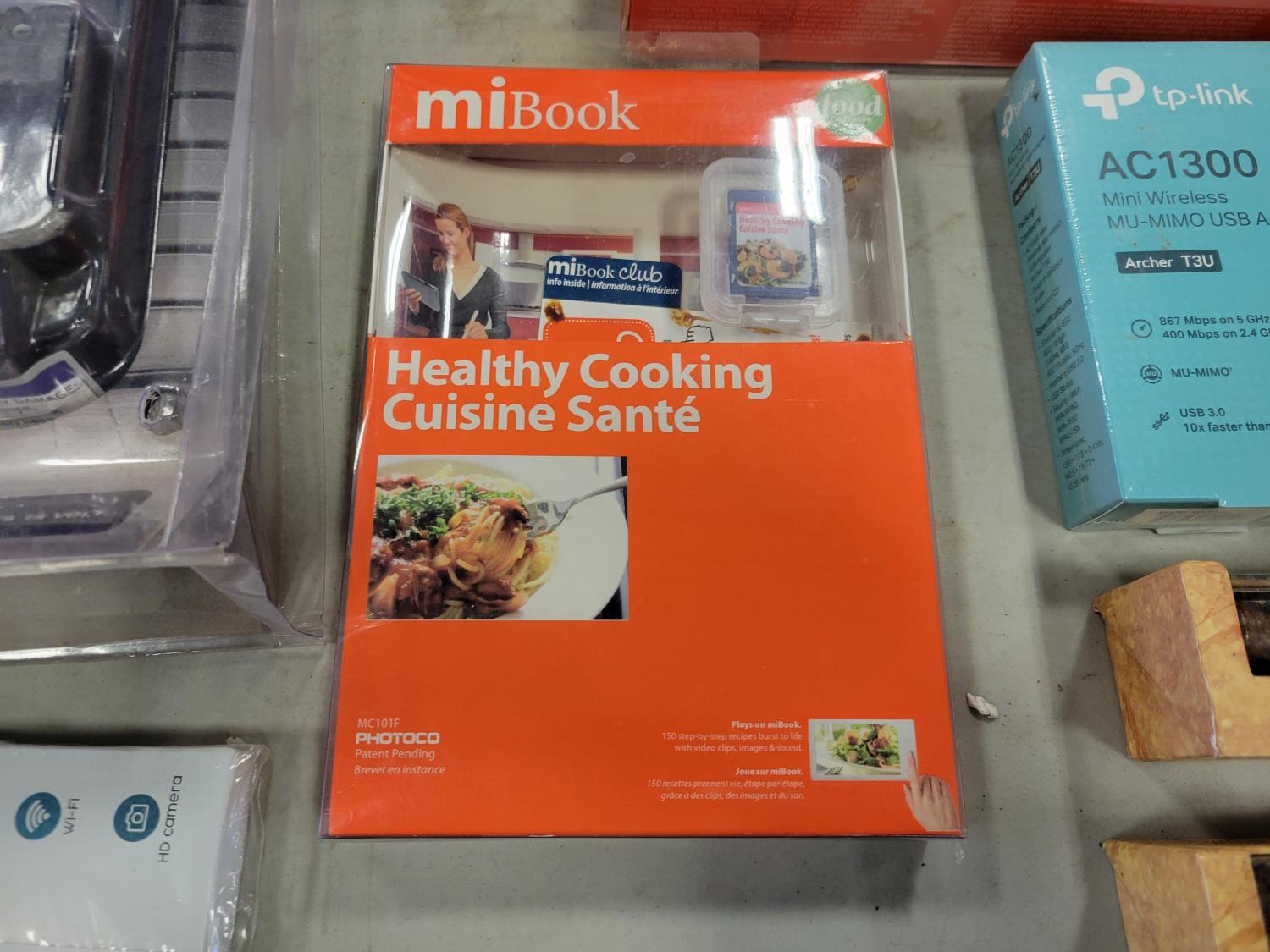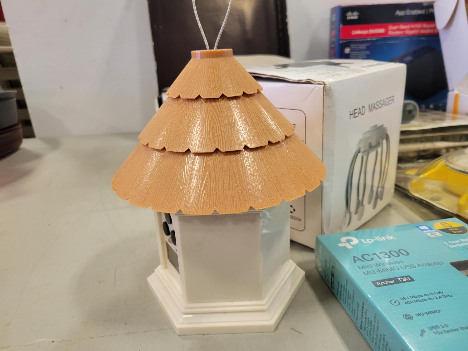 picture frame, router, garage parking sensor, digital camcorder, digital cook book, USB adapter, (2) wax seal stamps, 18V battery, ear cleaner with camera, bird feeder