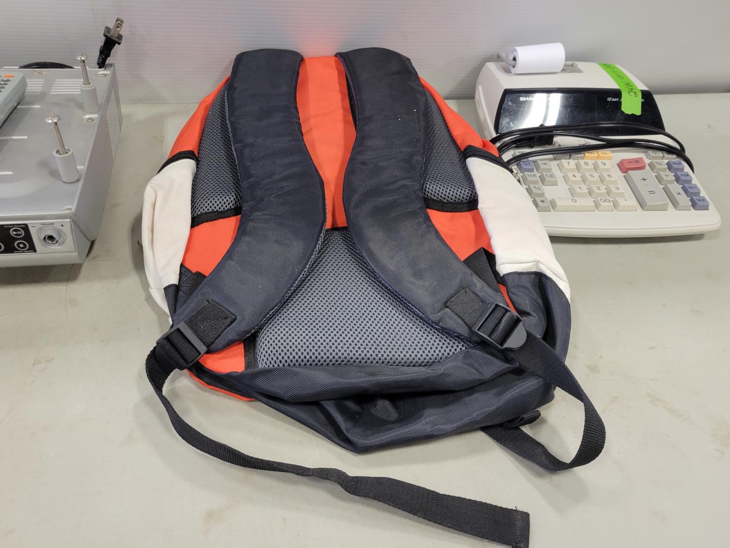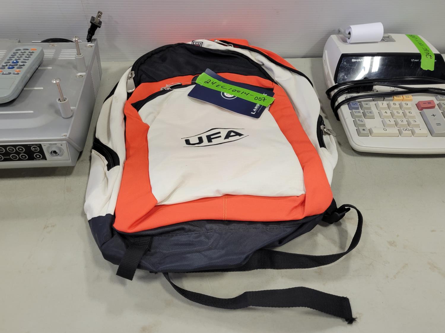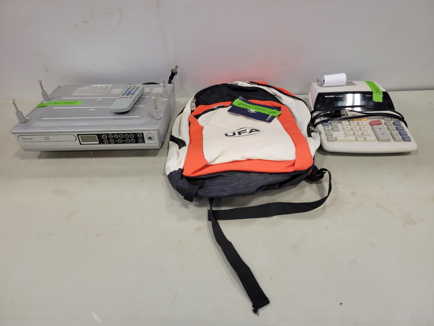 Undermount TV with DVD player, UFA backpack, Sharp calculator
