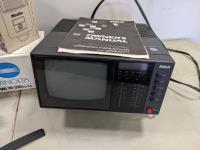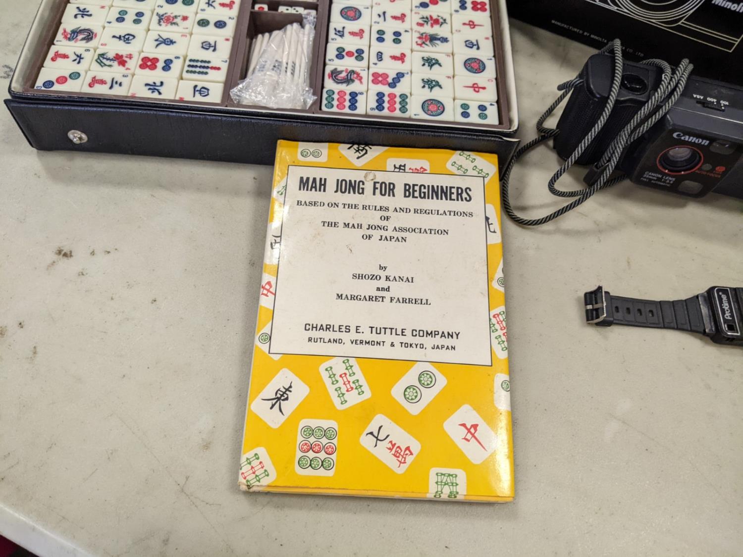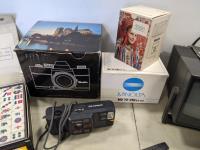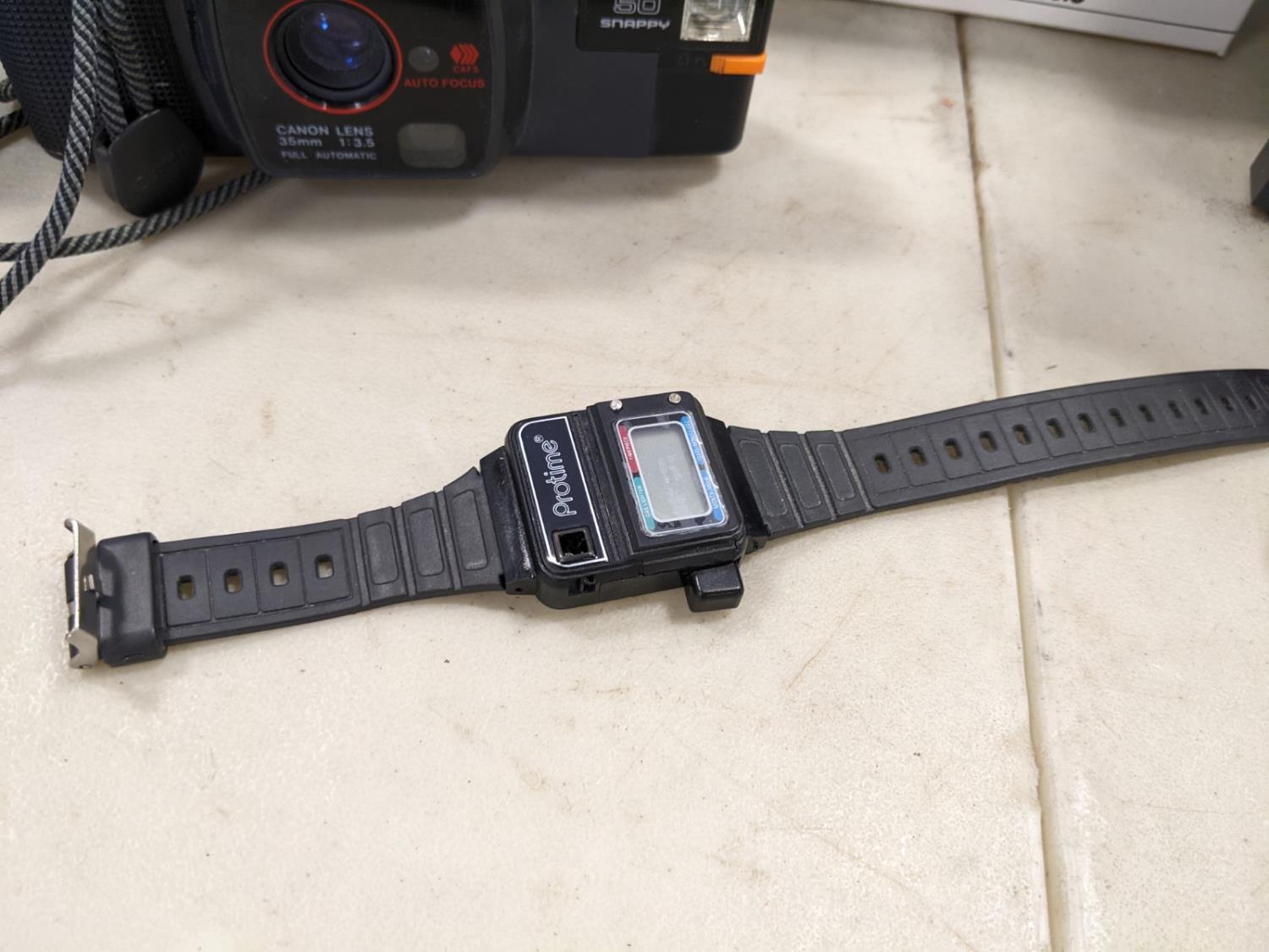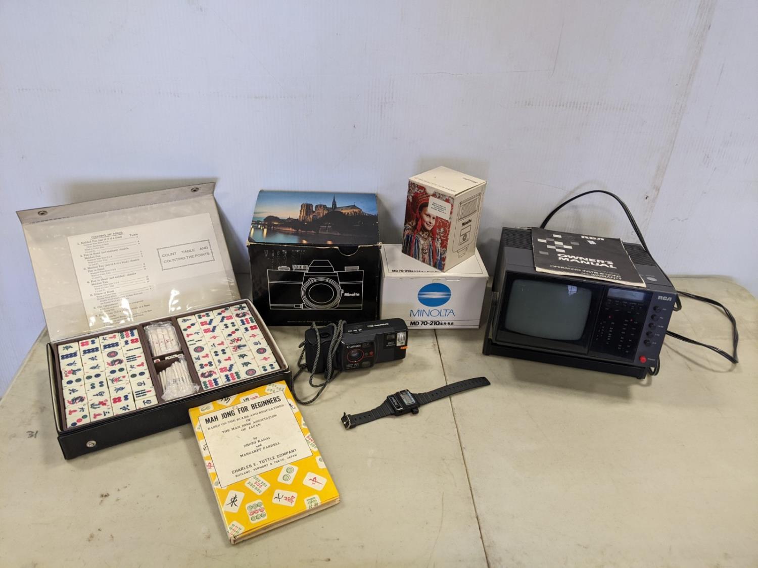 Minolta camera flash and lens, RCA mini TV, lighter watch, Canon camera
