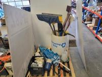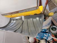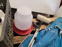 Snow shovels, hoe, rake, beach umbrella, (2) bird feeders, pick axe, wash brush