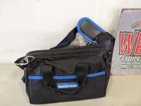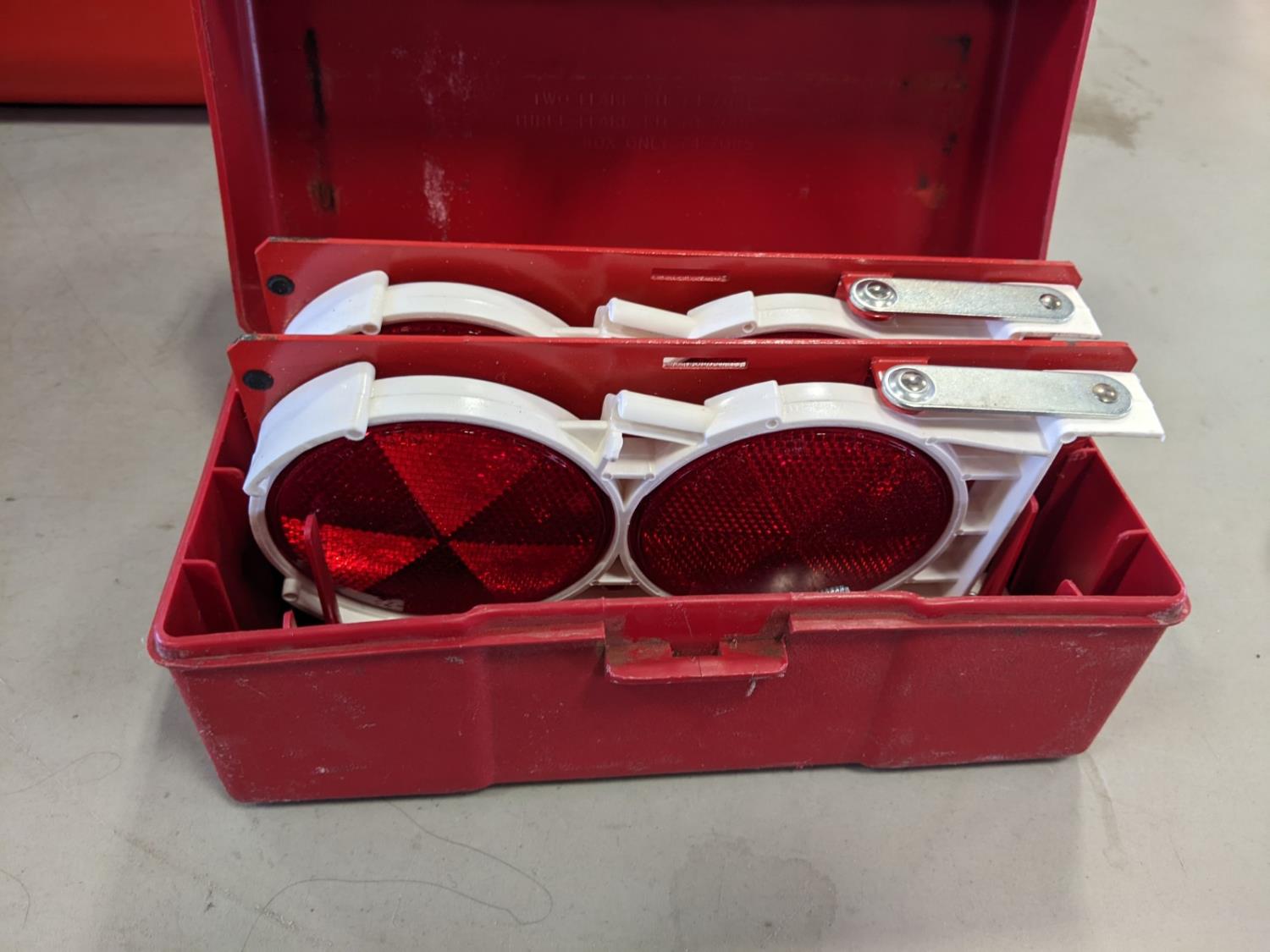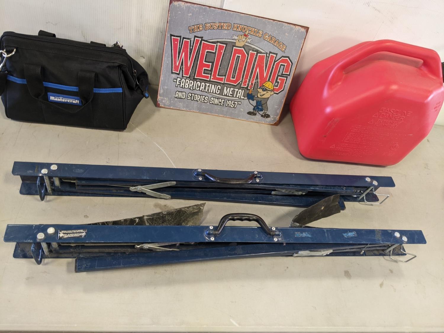 (2) folding sawhorses, road safety lights, jerry can, tin sign