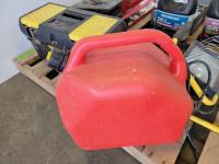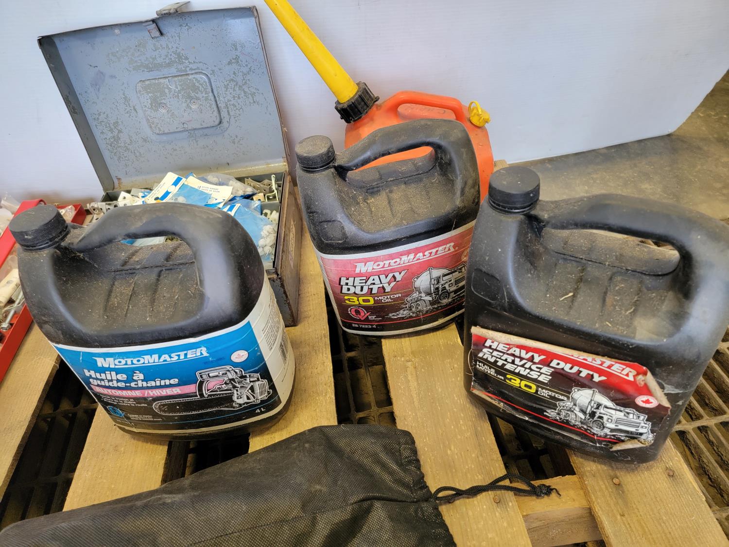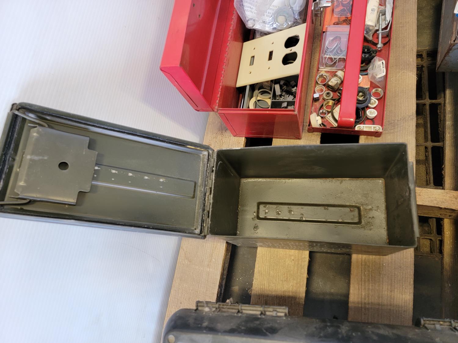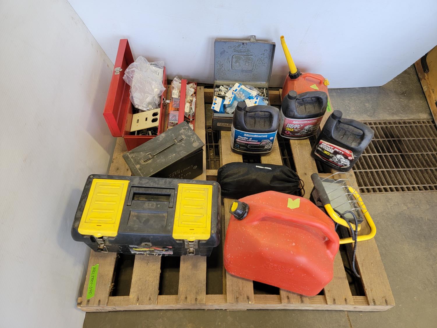 Toolbox with hardware, toolbox, (2) jerry cans, work light, metal ammunition box