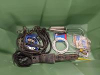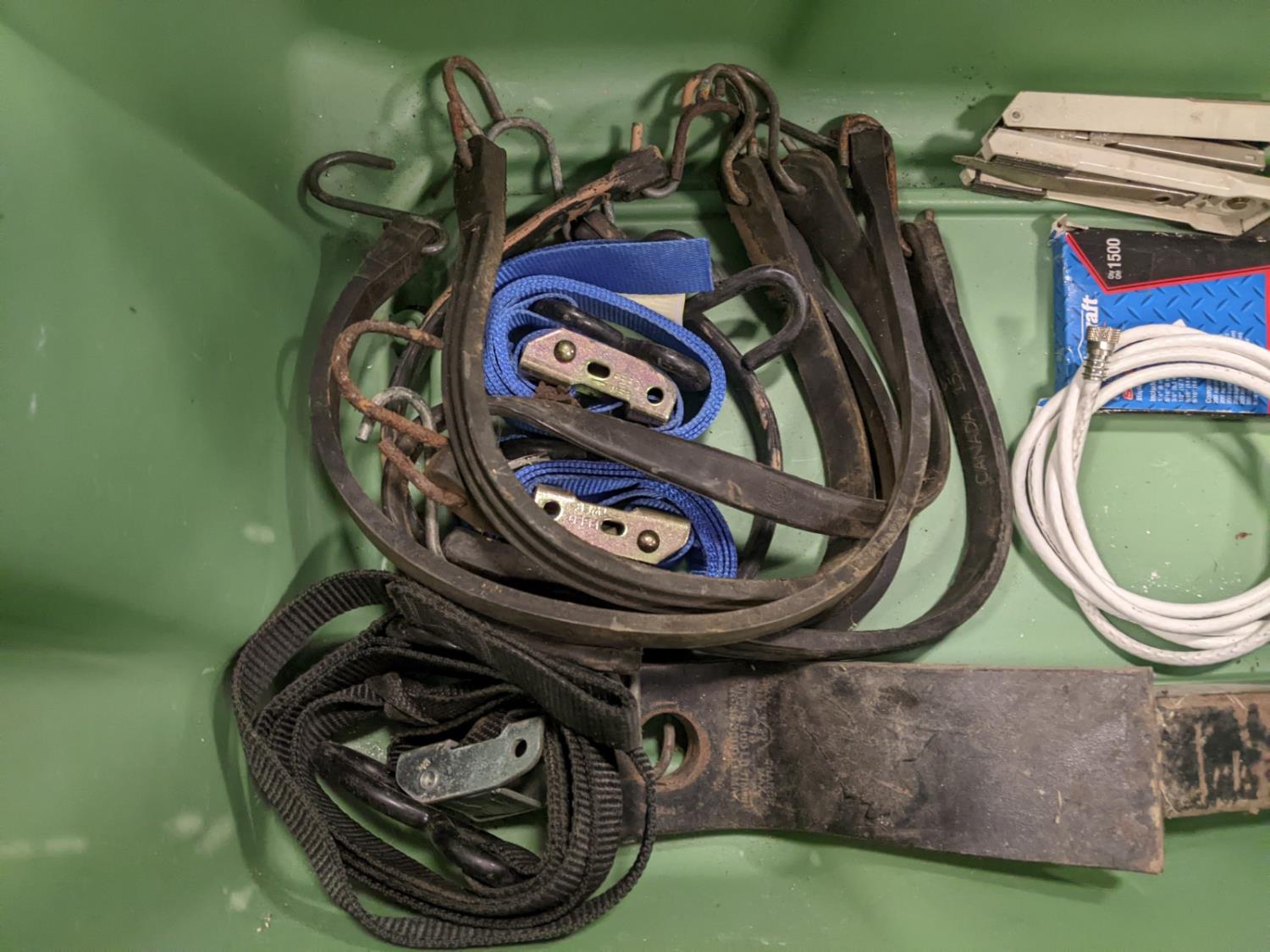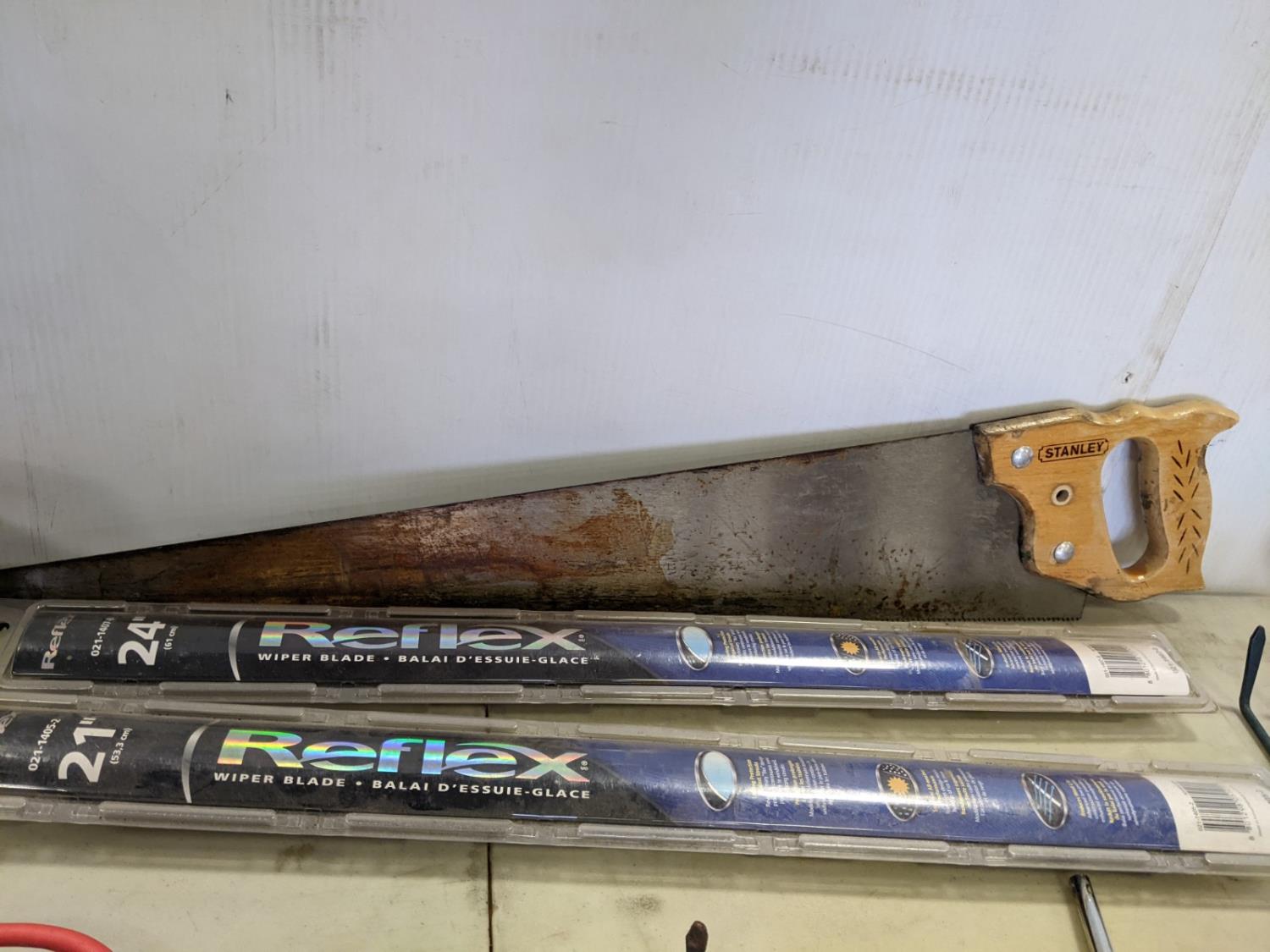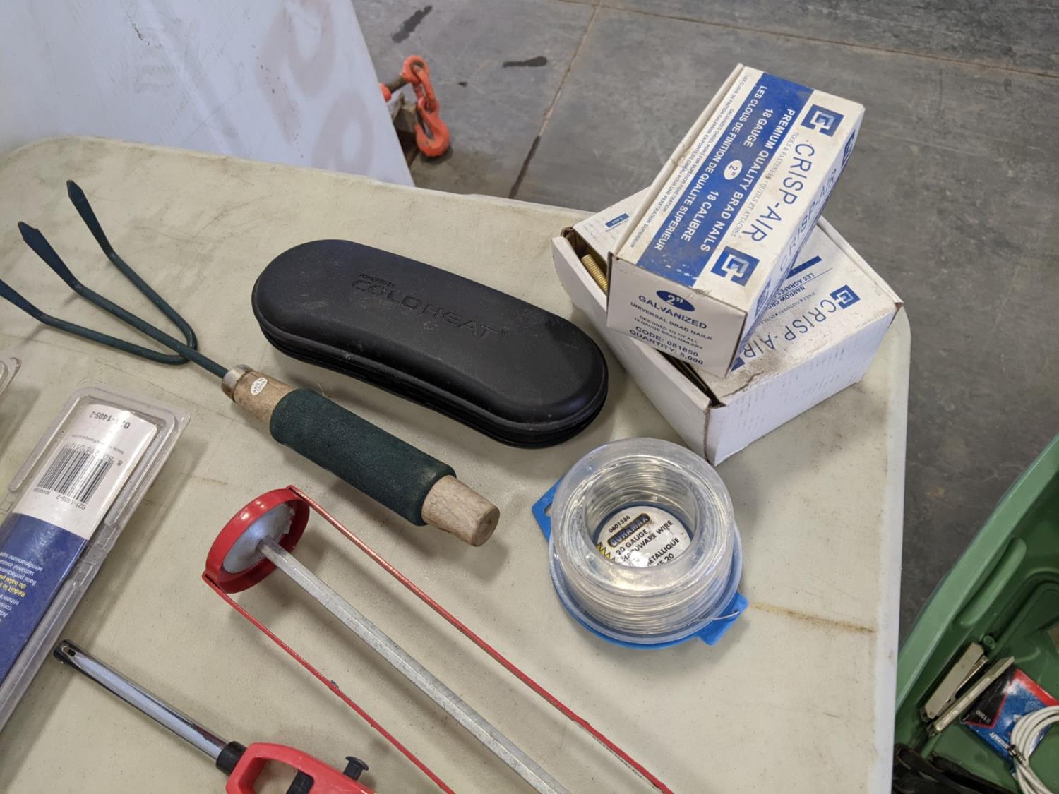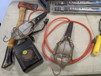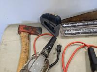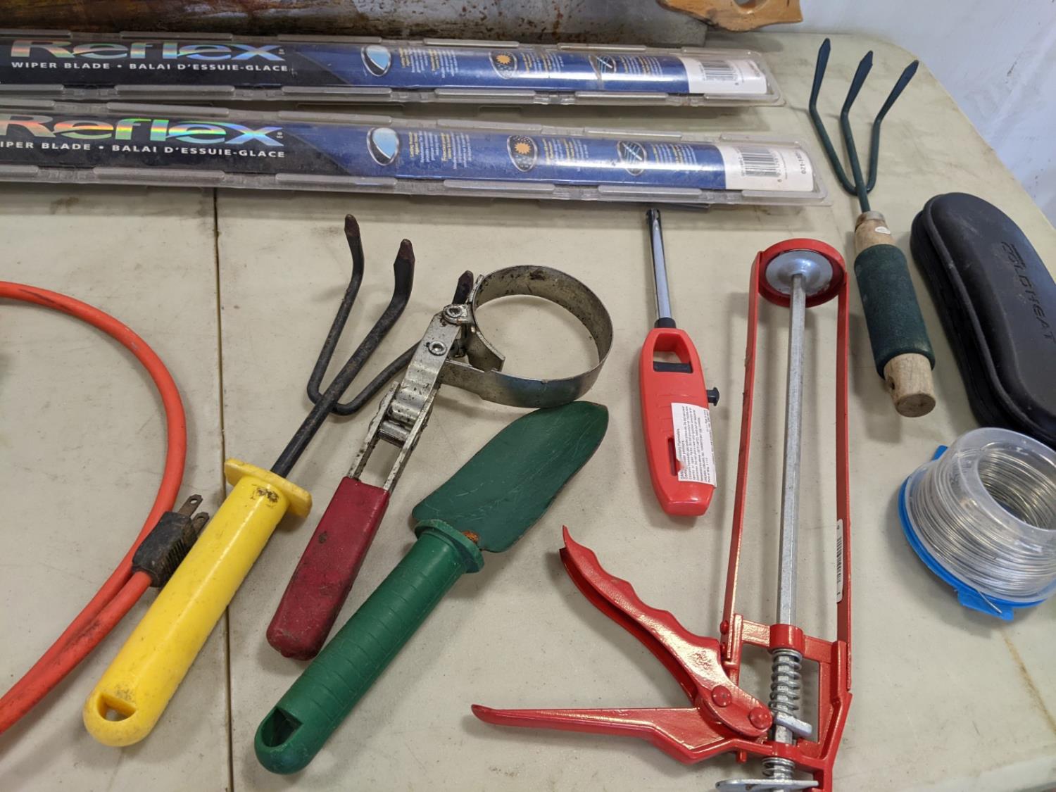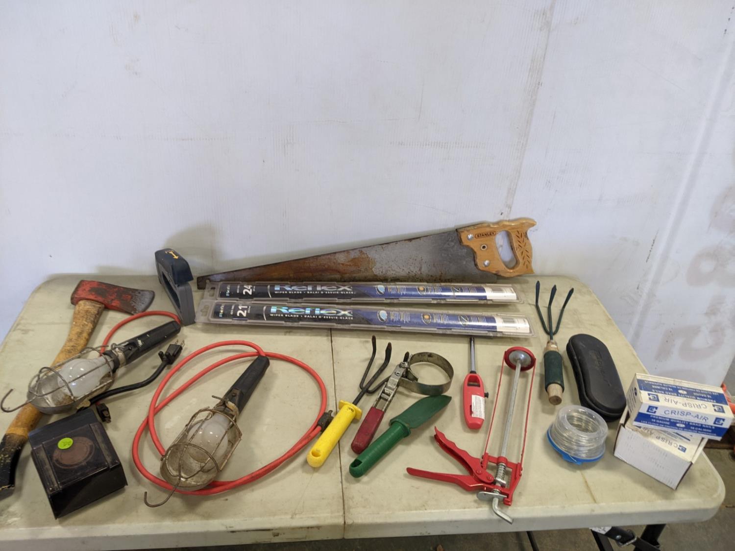 Hatchet, (2) trouble lights, hand saw, hitch, timer, staplers, straps, windshield wipers