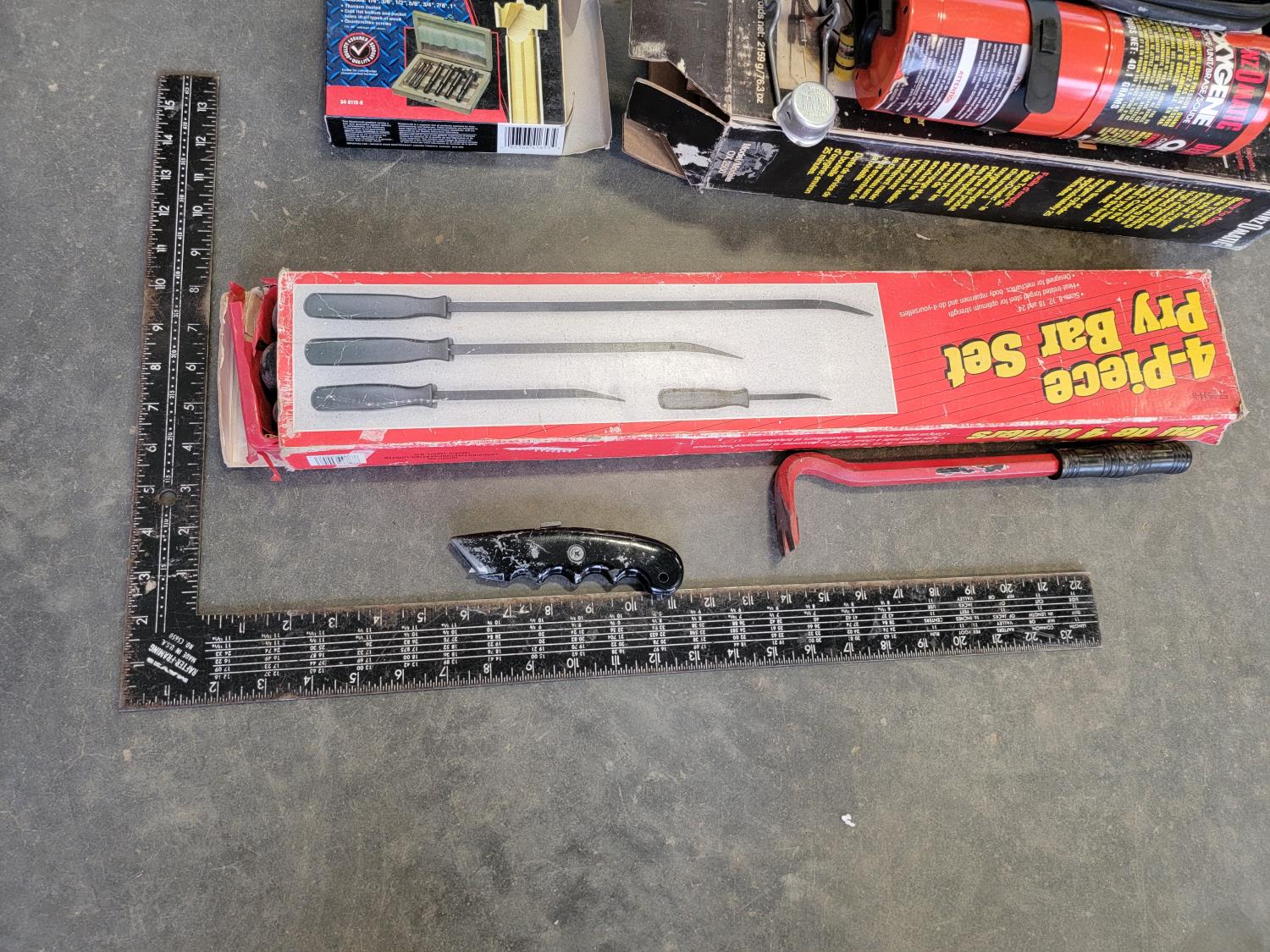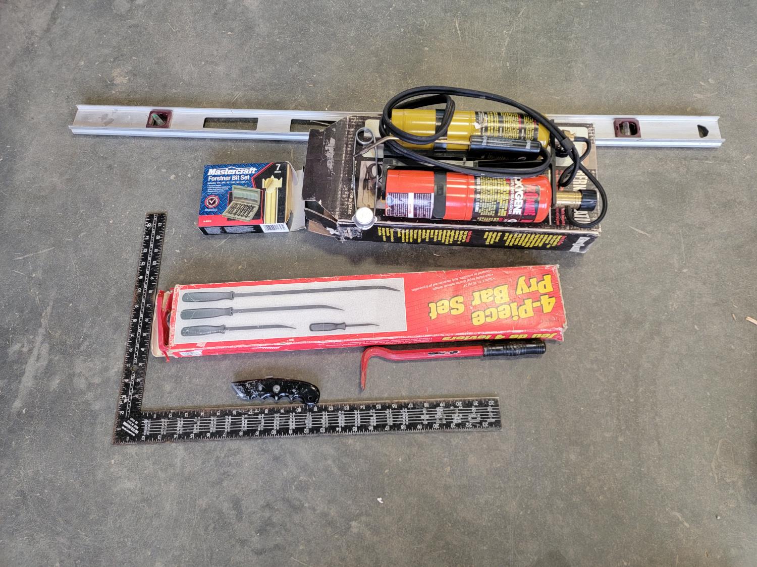 Carpenter square, 4 piece pry bar set, Mastercraft Forstner bit set, BernzOmatic torch, 4 ft level