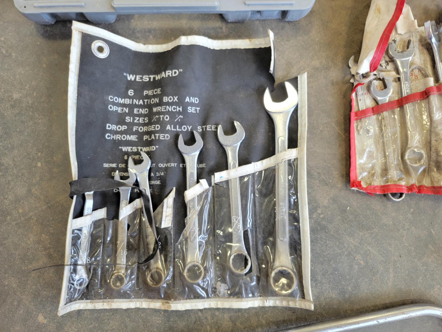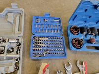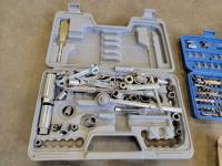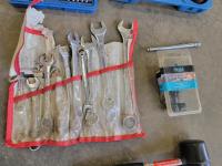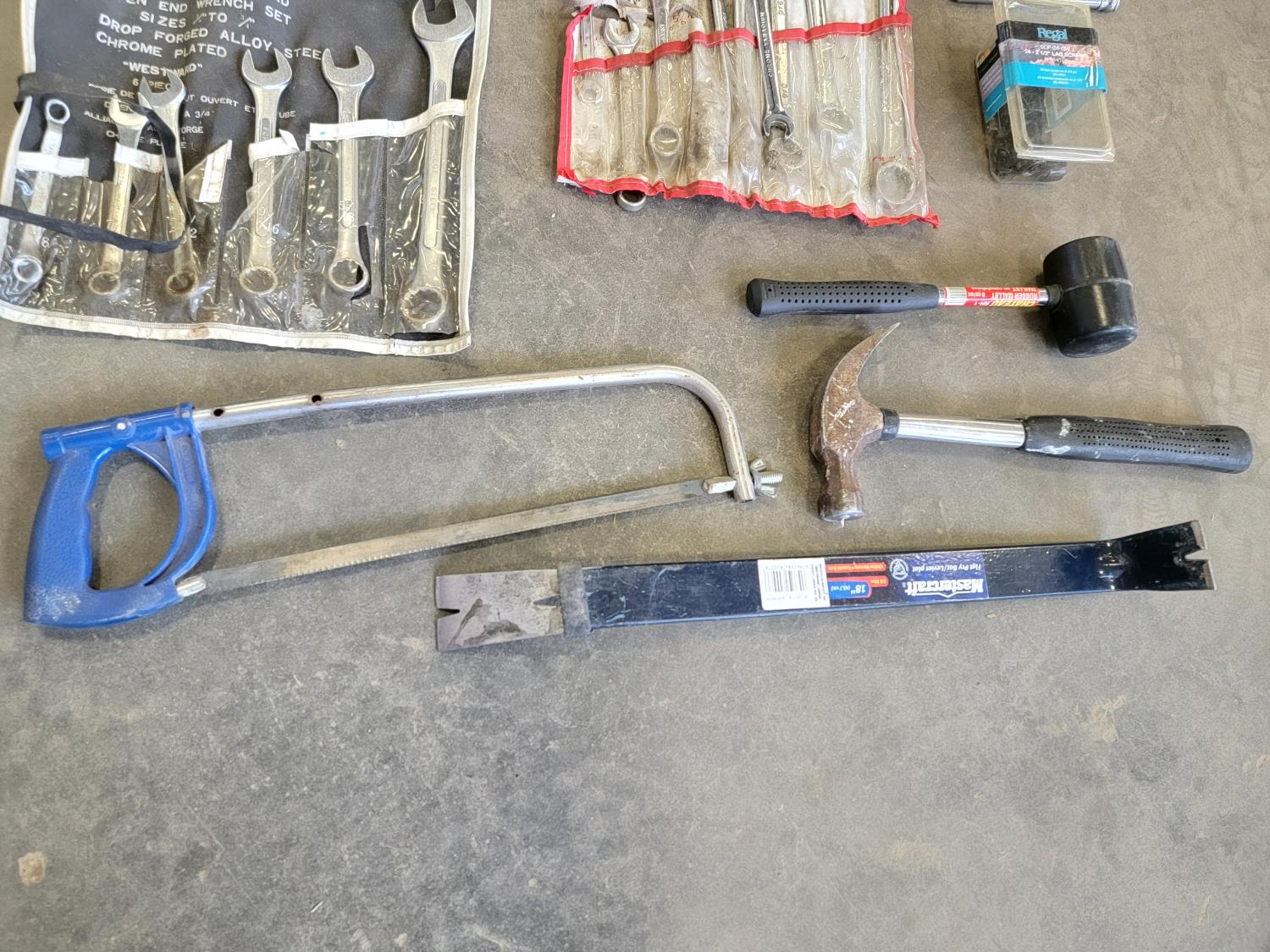 Flat pry bar, hack saw, hammers, combination wrenches, bit set,