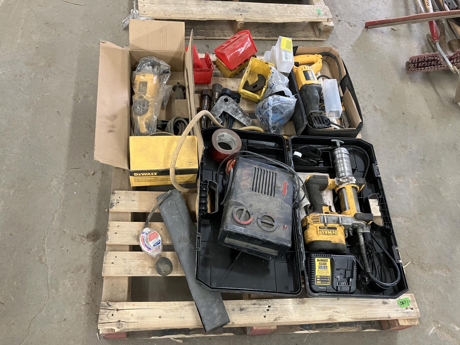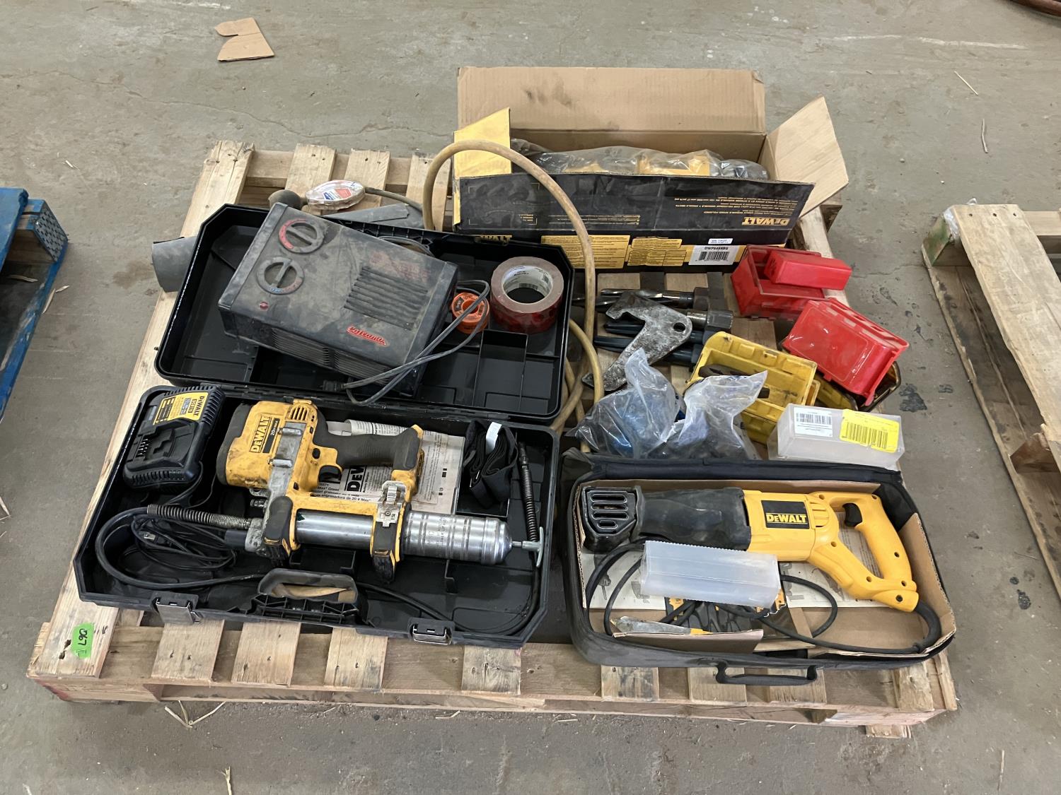 DeWalt 20V grease gun, DeWalt Electric polisher, DeWalt sawzall, (4) reamers, electric heater, Qty of 1/2 ft X 6 inch Allen bolts