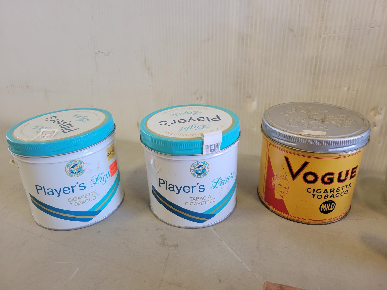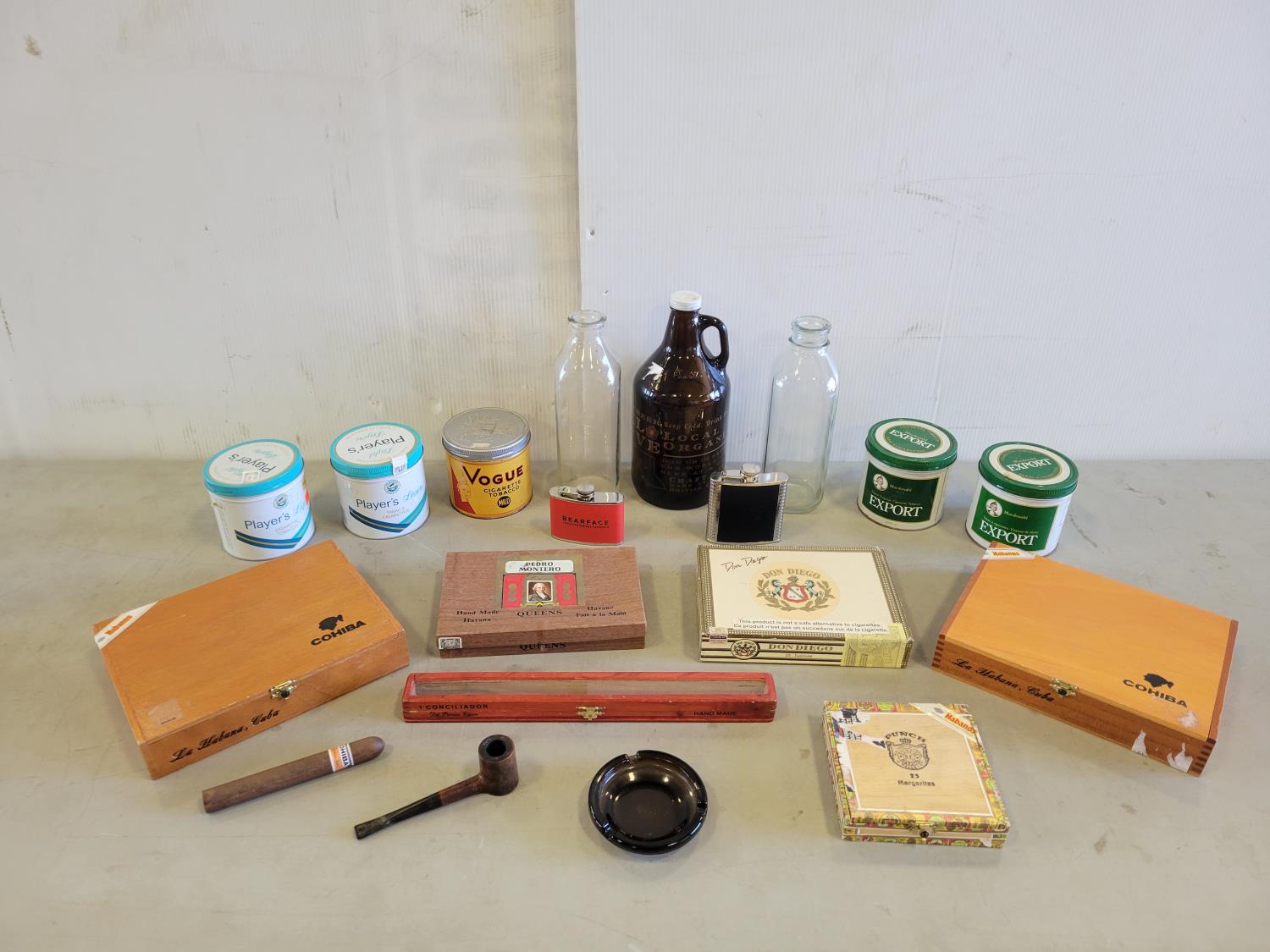 Tobacco tins, cigar boxes, milk bottles, beer jug, flasks