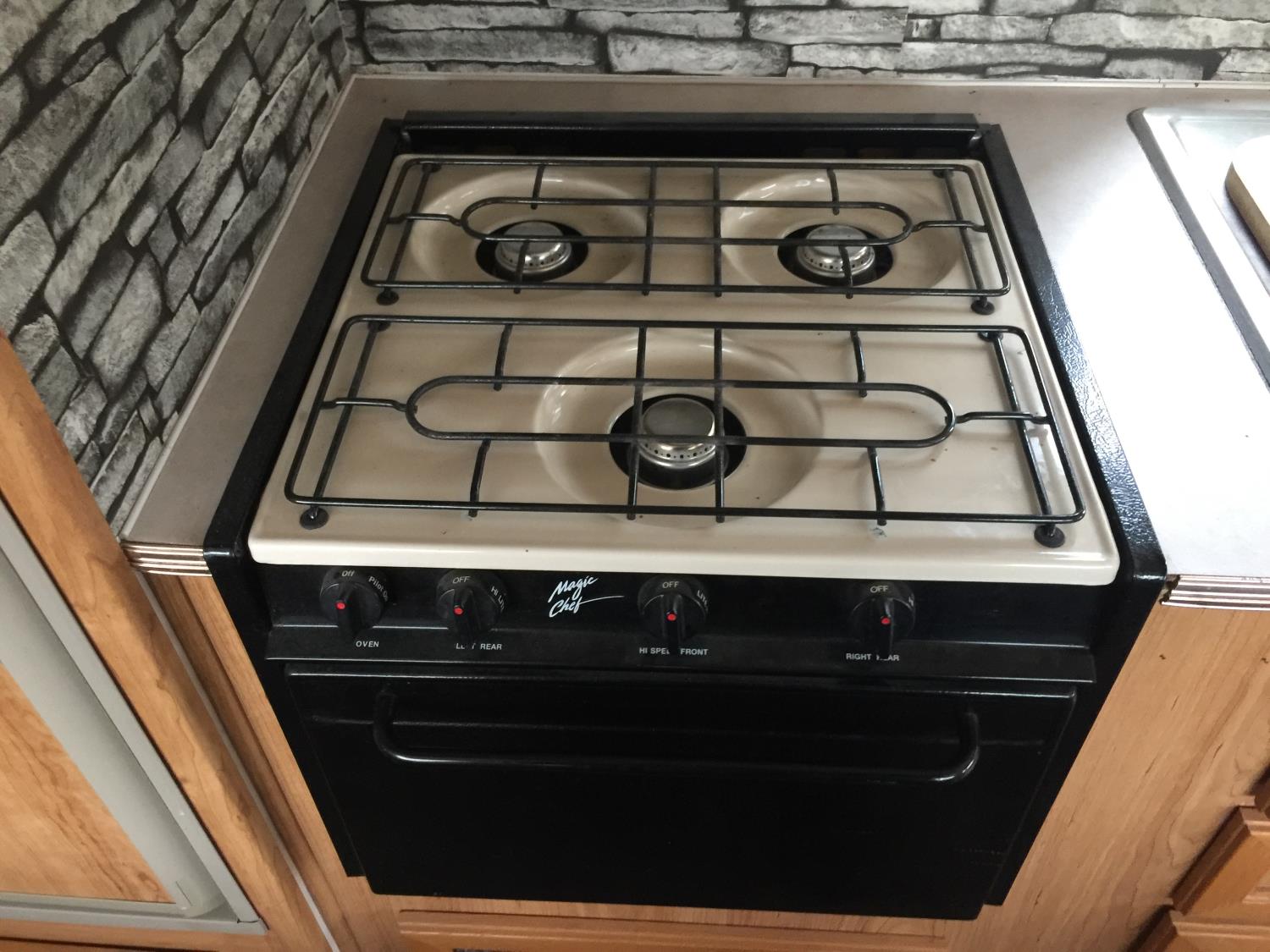 stove, fridge, microwave, full bath, A/C, 1 slide, manual awning, power levelling jacks, spring suspension, rear storage rack, 225/75R15 tires