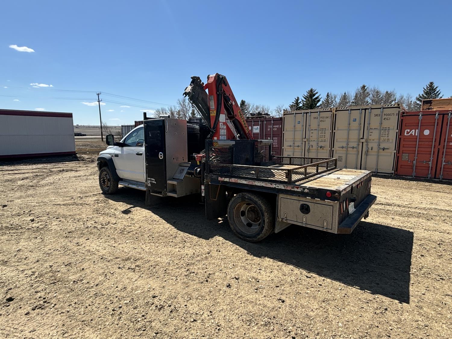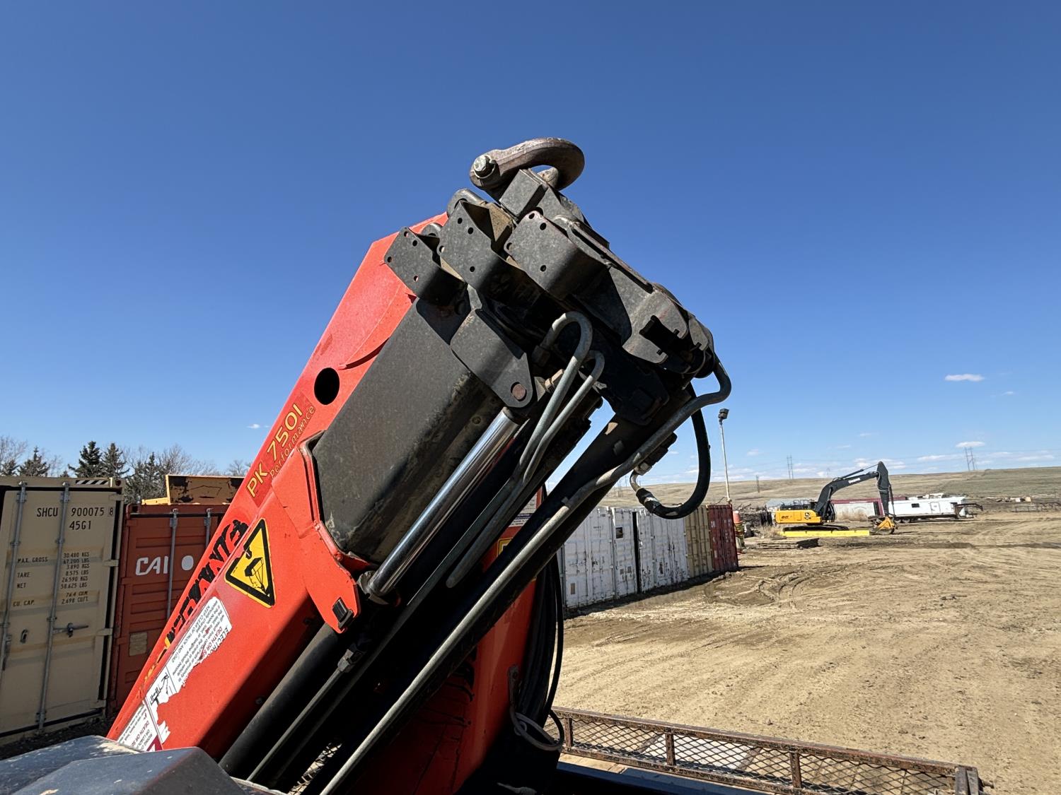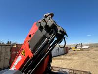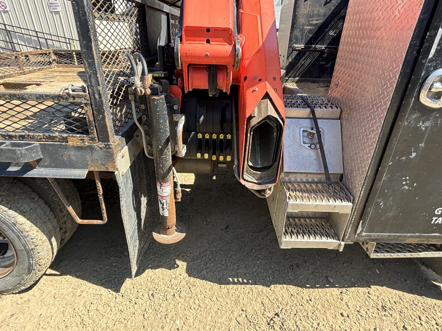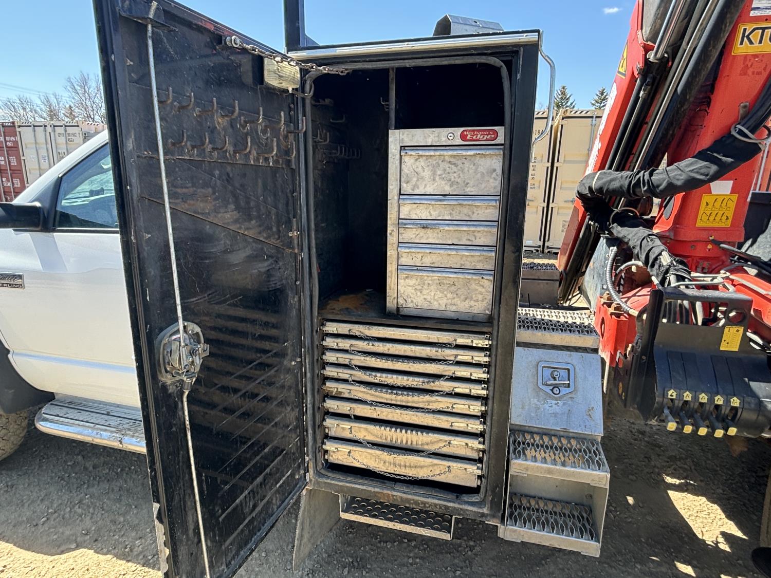 Cummins 6.7 L 6 cylinder diesel engine, electric engine block heater, positive air shutoff, automatic transmission, A/C, cruise control, stereo, steel tool boxes, 92 inch x 87 inch deck, Palfinger PK7501 3 section 12 ft rear mount crane, outriggers, 11,900 lb capacity, spring suspension, 193 inch WB, 225/70R19.5 tires