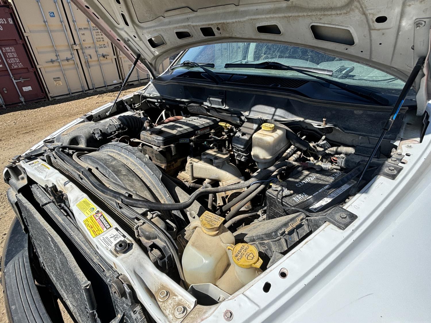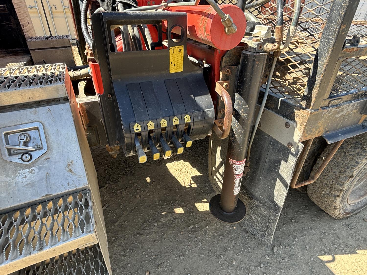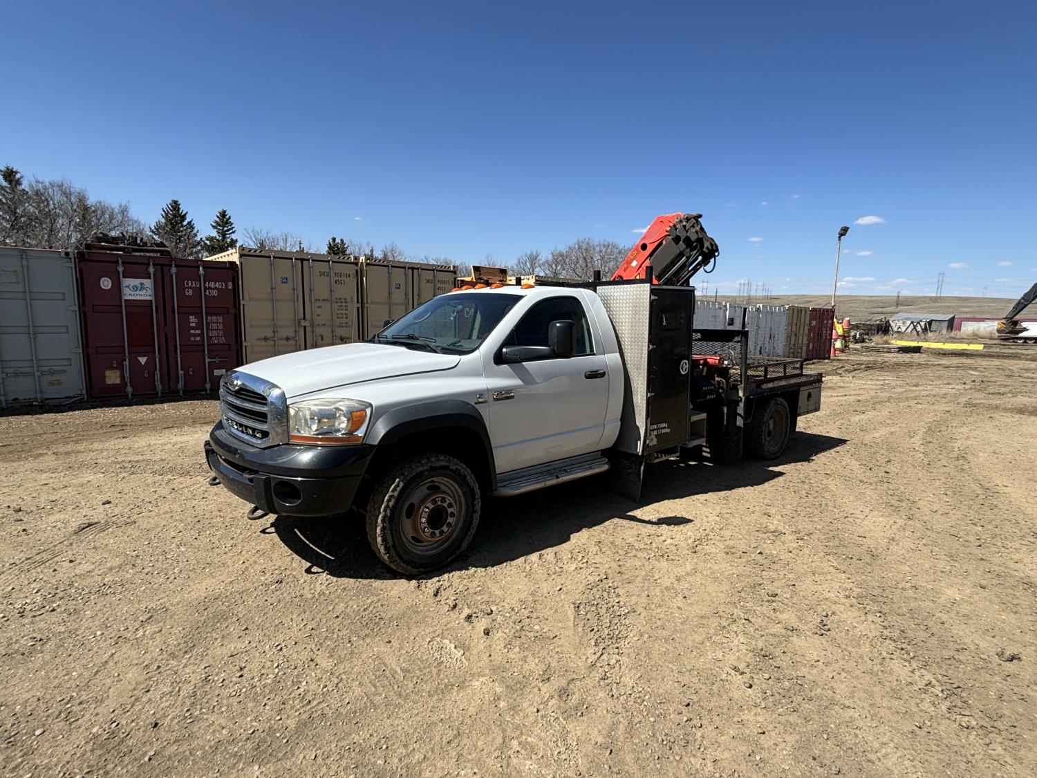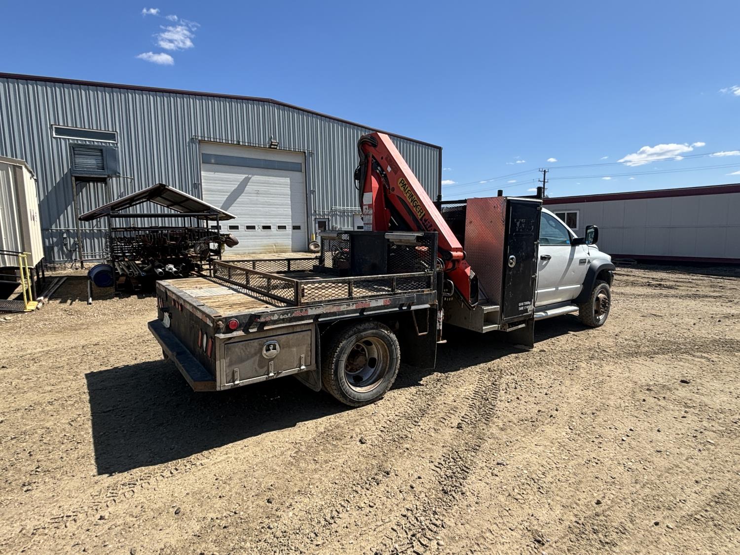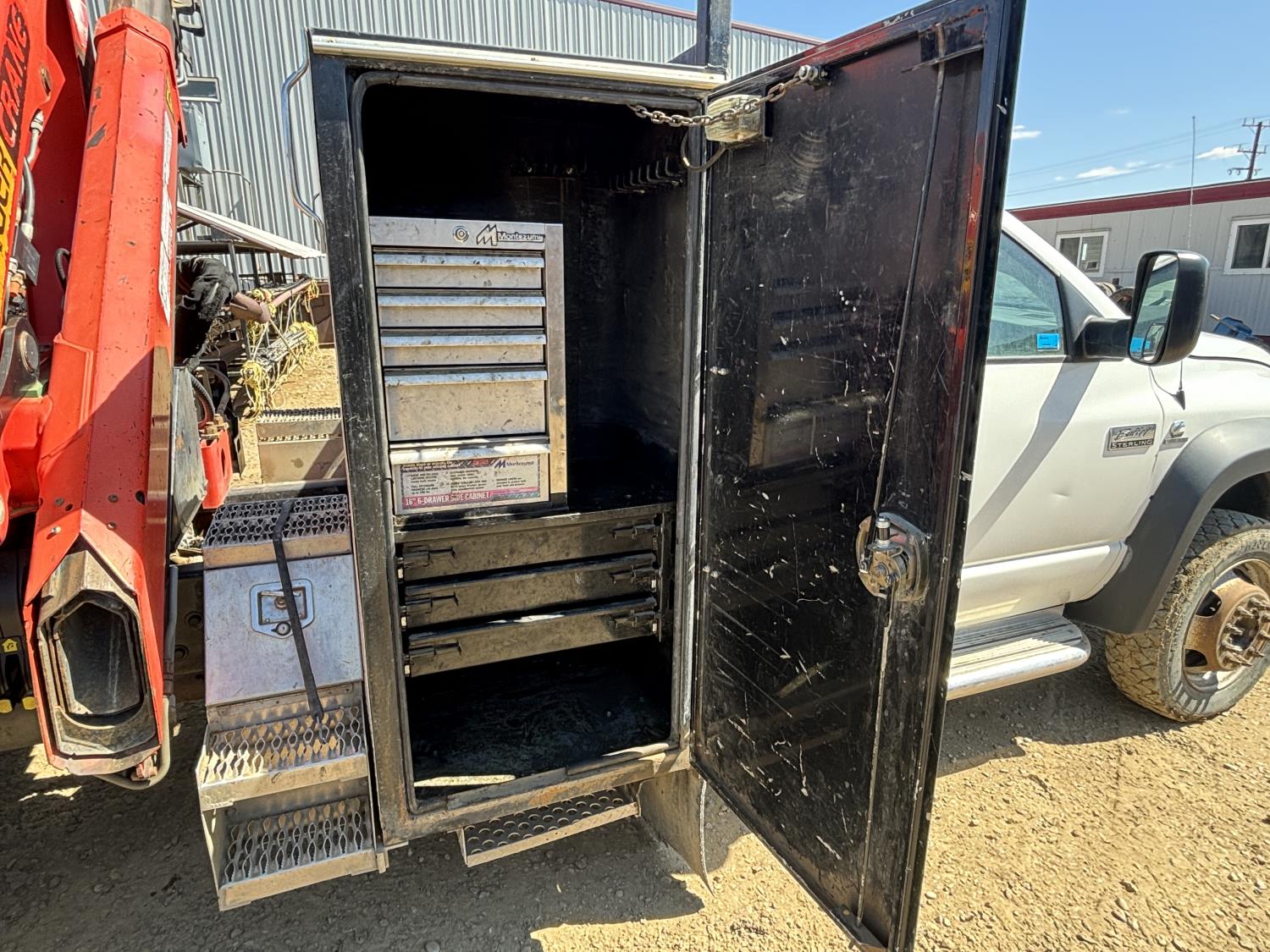 Cummins 6.7 L 6 cylinder diesel engine, electric engine block heater, positive air shutoff, automatic transmission, A/C, cruise control, stereo, steel tool boxes, 92 inch x 87 inch deck, Palfinger PK7501 3 section 12 ft rear mount crane, outriggers, 11,900 lb capacity, spring suspension, 193 inch WB, 225/70R19.5 tires