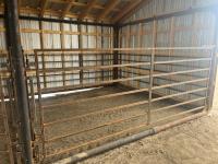(6) 12 ft x 12 ft stalls, 12 ft alleyway, full width gates, removeable partitions to make 12, 24 or 36 ft stalls, 3-1/2 inch pipe framing, 2x8 wood roof