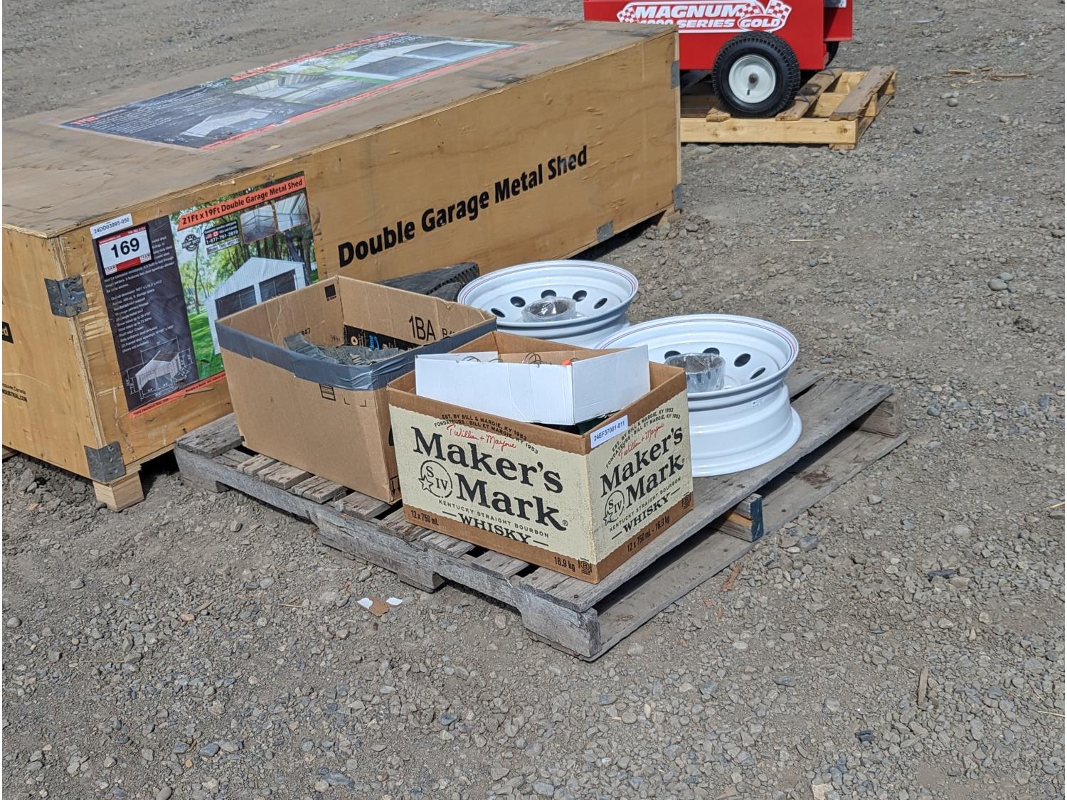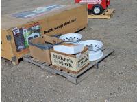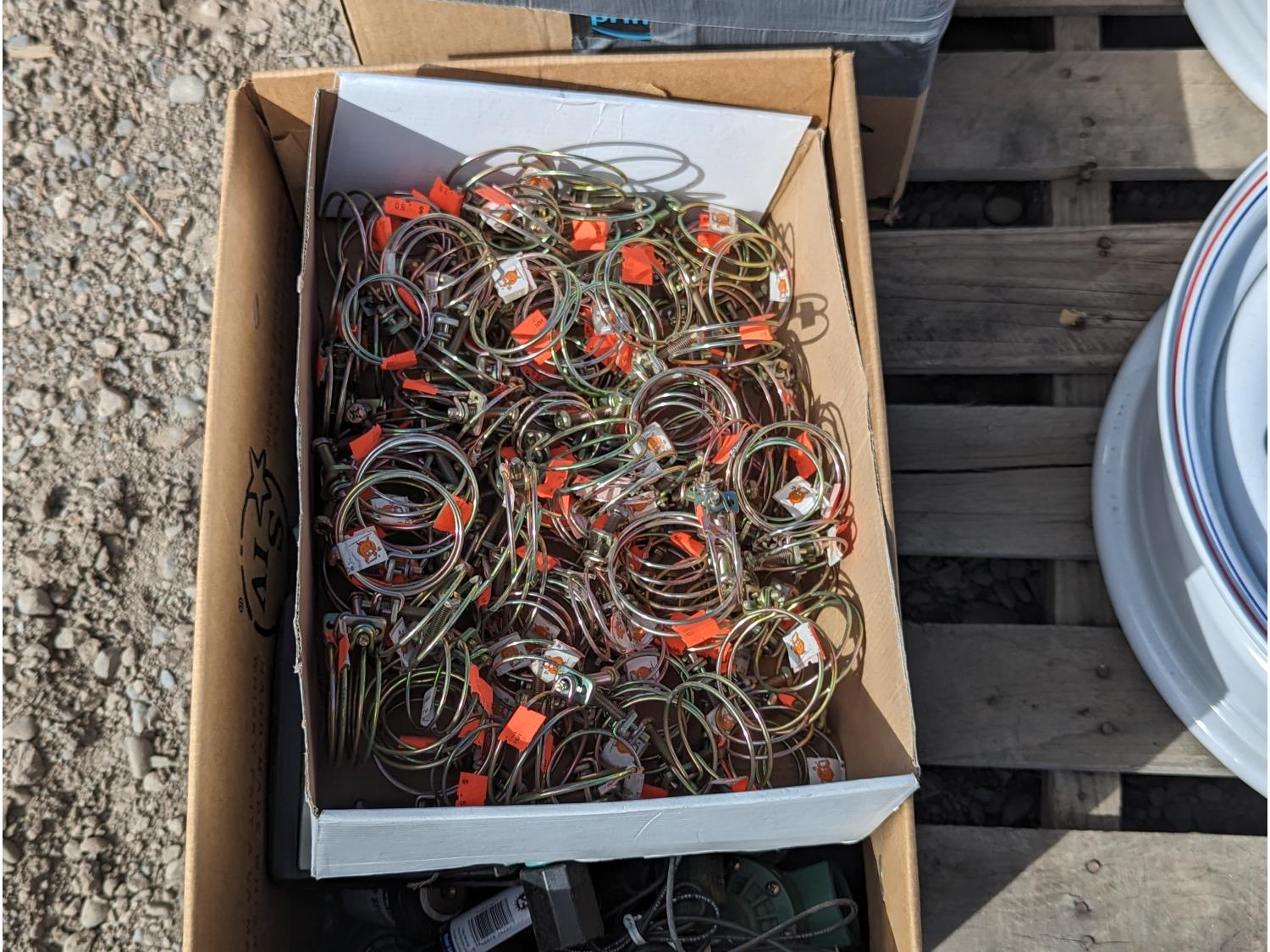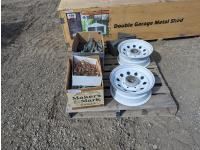 470 (2) 16 Inch Trailer Wheels, Irrigation Parts, Joist Hangers & Hose Clamps